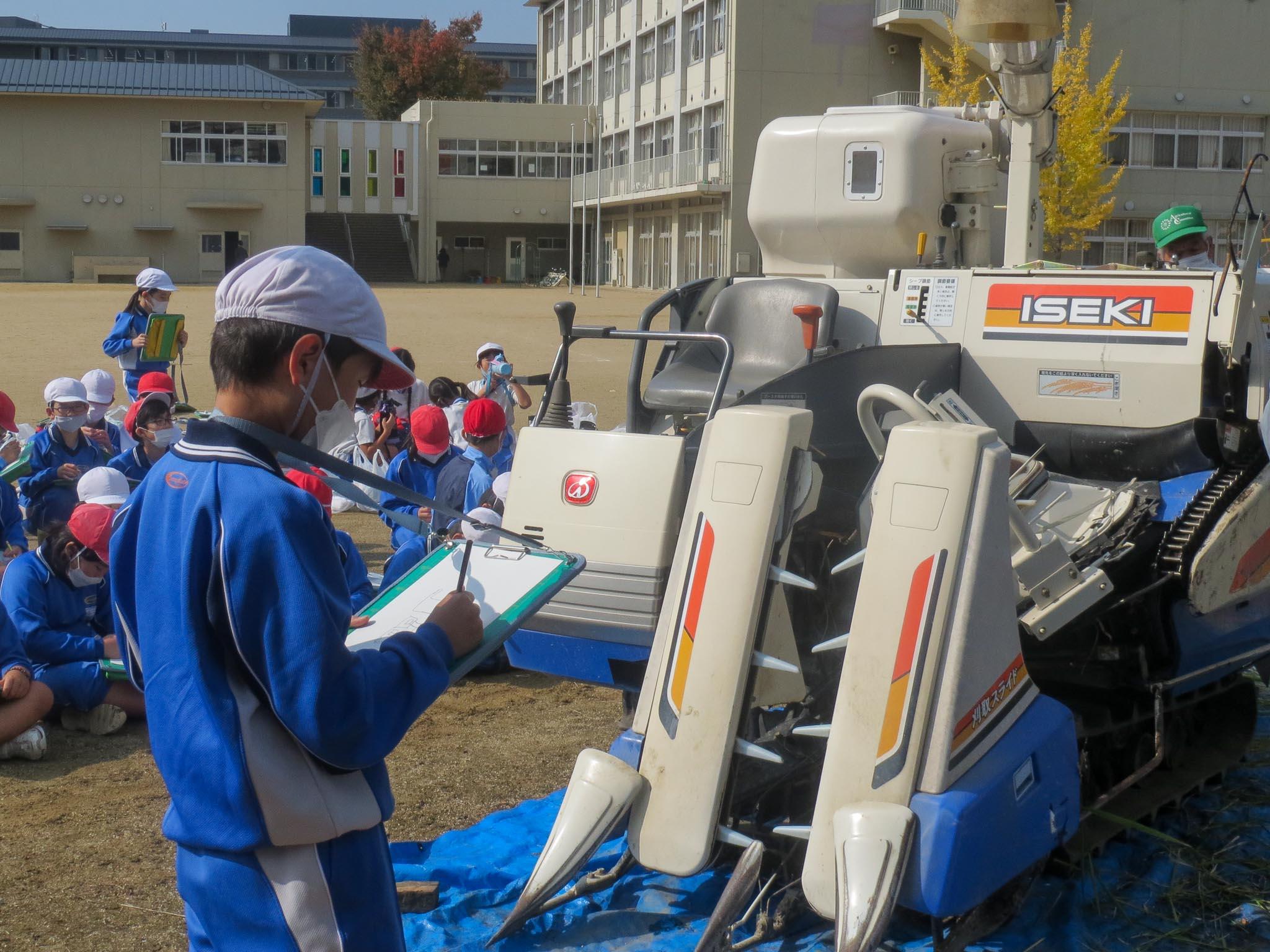 慣れないカマを手に、慎重にイネを刈り取る子どもたち。刈り取ったイネは、グループで協力して運び、コンバインにかけてもらってモミの脱穀とわらの処理をします。働き者のコンバインを見て、空いた時間に一生懸命スケッチする様子もありました。