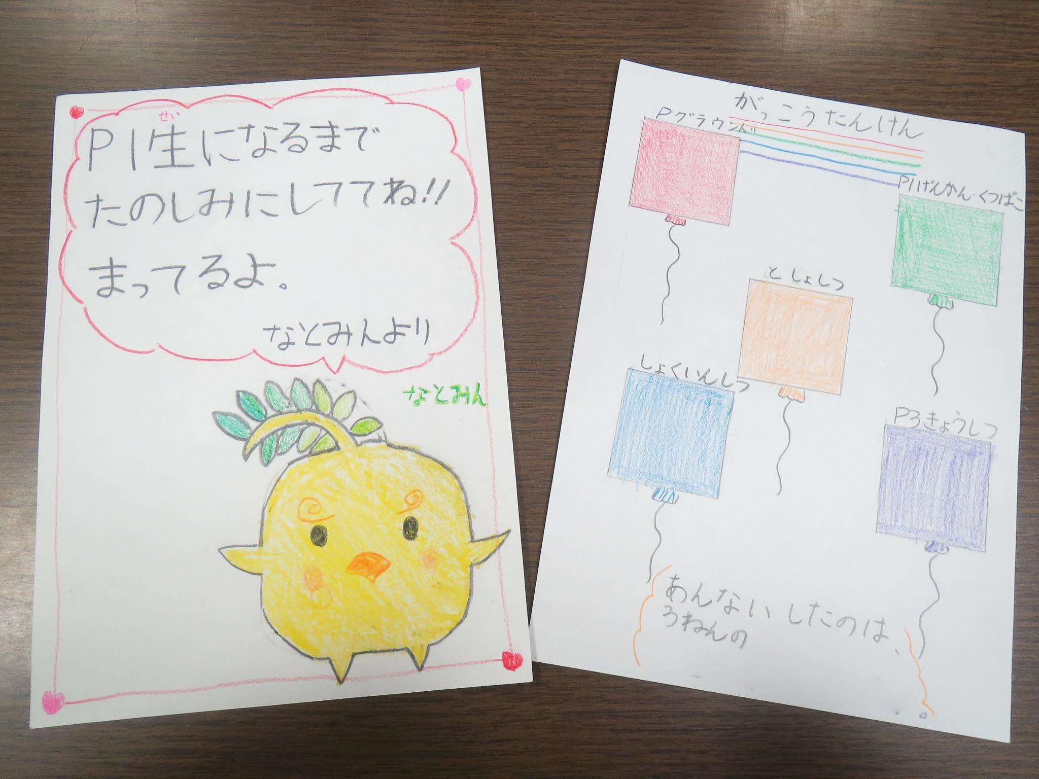 「今日は、幼稚園のお友達と、小学校の学校たんけんをしました。P3教室、しょく員室、くつばこ、図書室、Pグラウンドがおもしろいと言ってくれました。いいカードを作ってよかったなと思います。とてもいい顔をしていたので楽しかったと思います。それを見ると、ぼくも楽しくなります。」