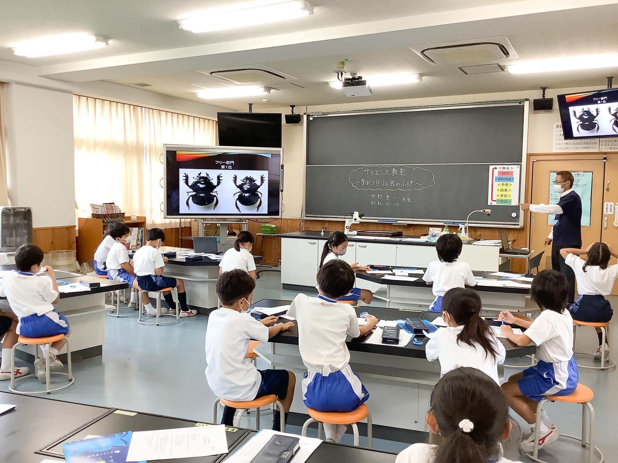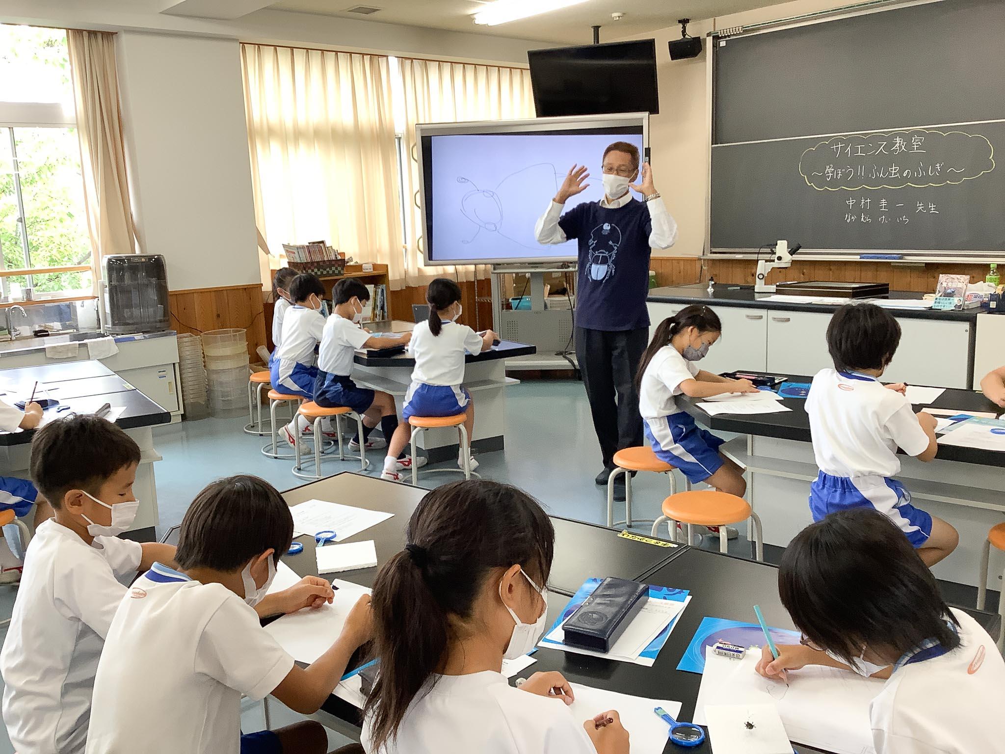 P3(小学3年)生のサイエンス教室「学ぼう!!糞虫のふしぎ」に奈良町の糞虫館から中村先生に来ていただき、お話を聞くことができました。