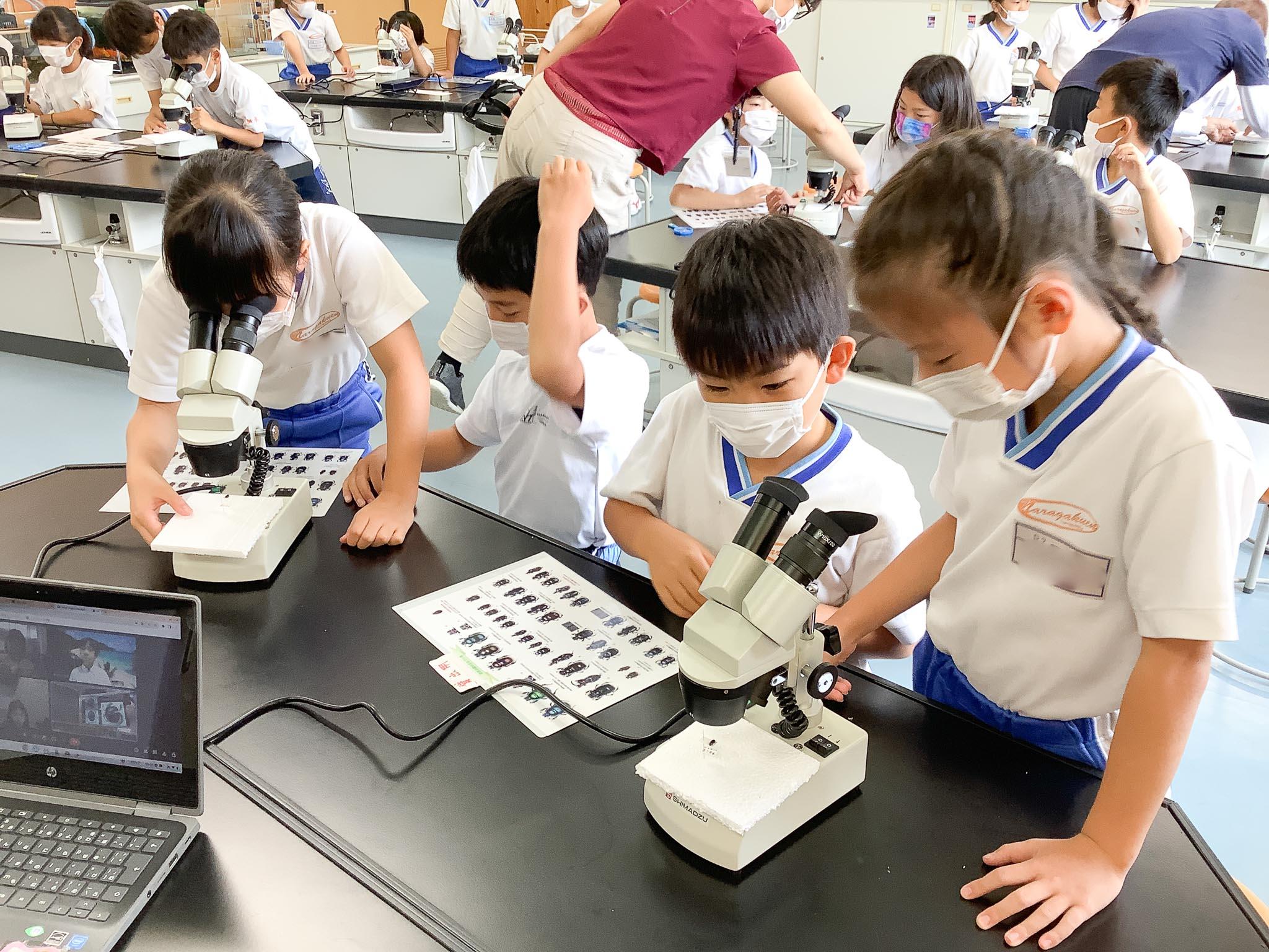 大仏様より古くから鹿とともに奈良公園に住み続けている糞虫たちです。毎日の鹿の糞の量は1トンということですから、糞虫たちが食べて分解してくれなければ大変なことになってしまいます。なんと日本にいる糞虫160種類のうち60種類も奈良に住んでいるというお話も聞いてびっくりです。そんなお話の後に糞虫を顕微鏡で観察することができたので、子どもたちの興味はさらに高まった様子でした。