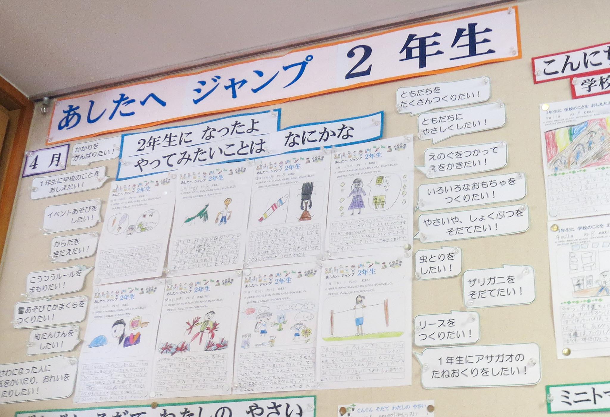 4月、P2(小学2年)生の生活科の一番はじめに「2年生になって、やってみたいことはなにかな?」と聞いたとき、たくさんのやってみたいことが子どもたちから出てきました。廊下の掲示にその言葉が残っています。「ともだちをたくさんつくりたい!」「えのぐをつかってえをかきたい!」「いろいろなおもちゃをつくりたい!」「やさいやしょくぶつをそだてたい!」「虫とりをしたい!」「リースを作りたい!」「ザリガニをそだてたい!」などなど。それらを一つ一つ生活科の時間に実現していっている子どもたちです。