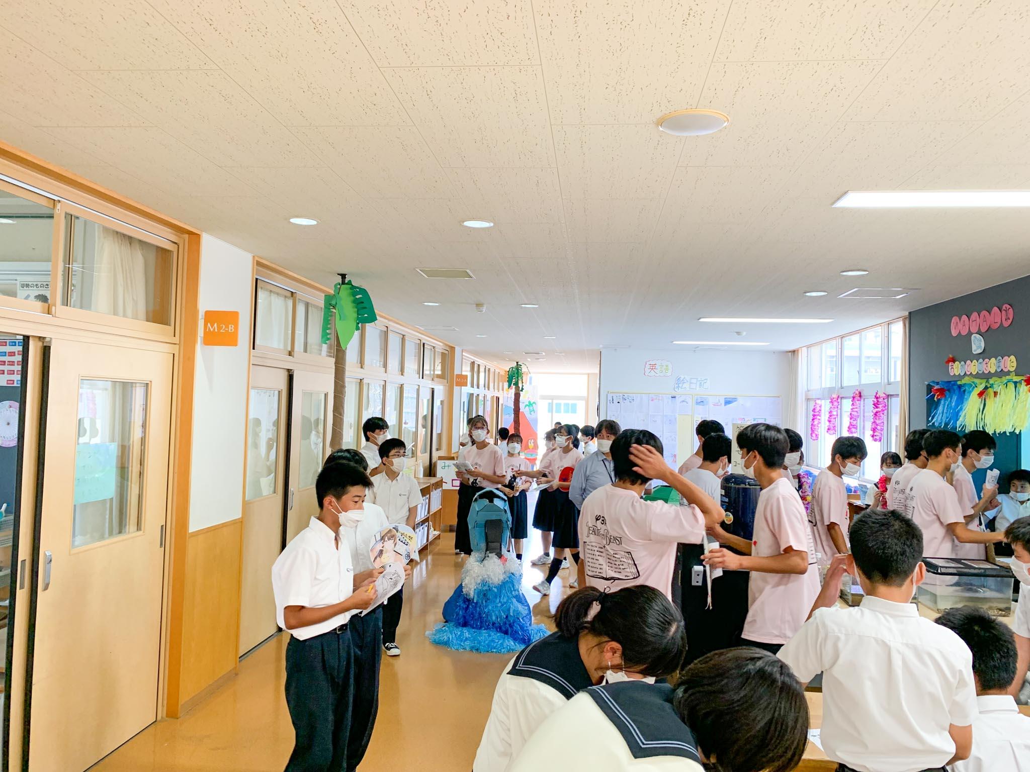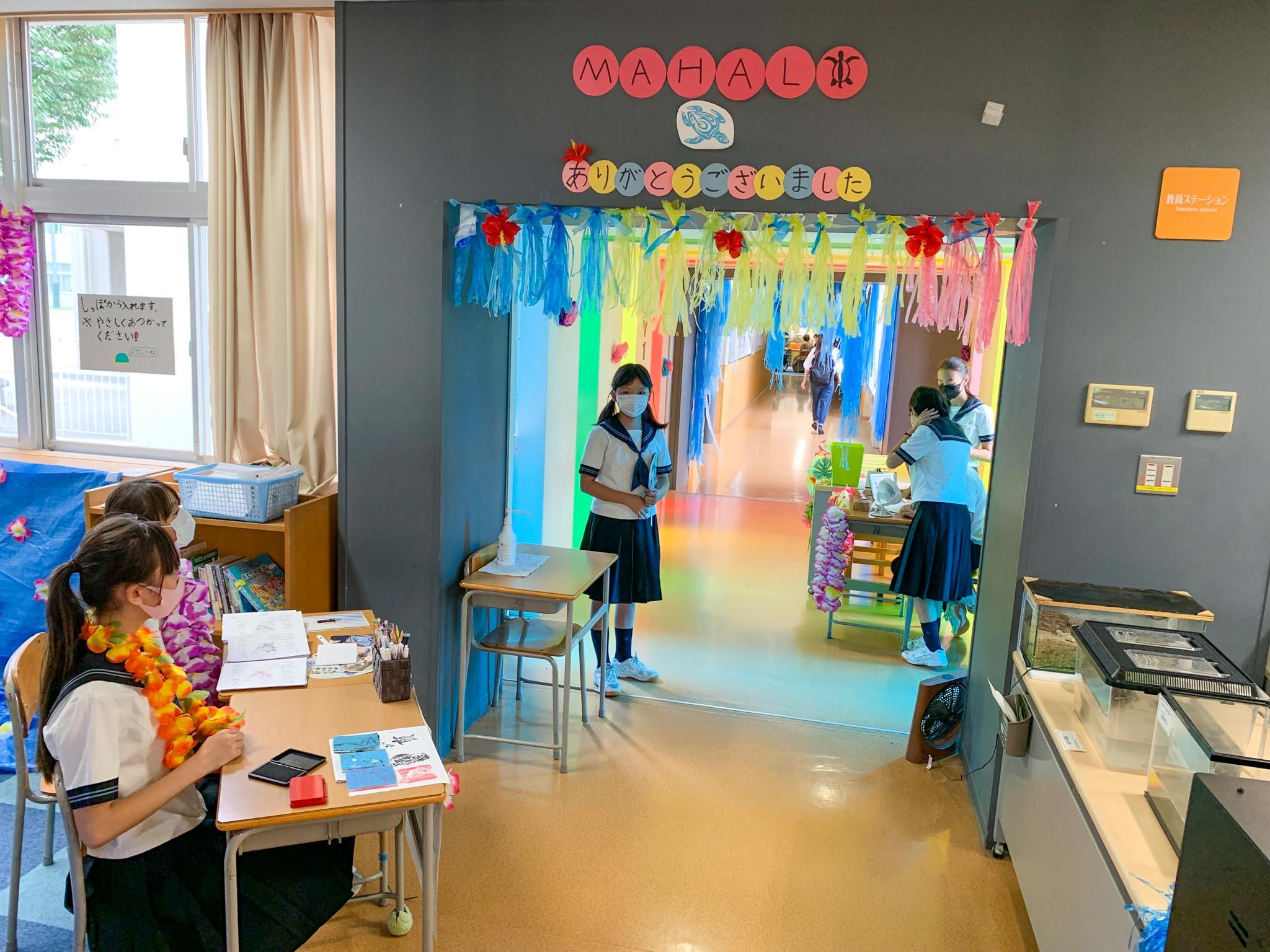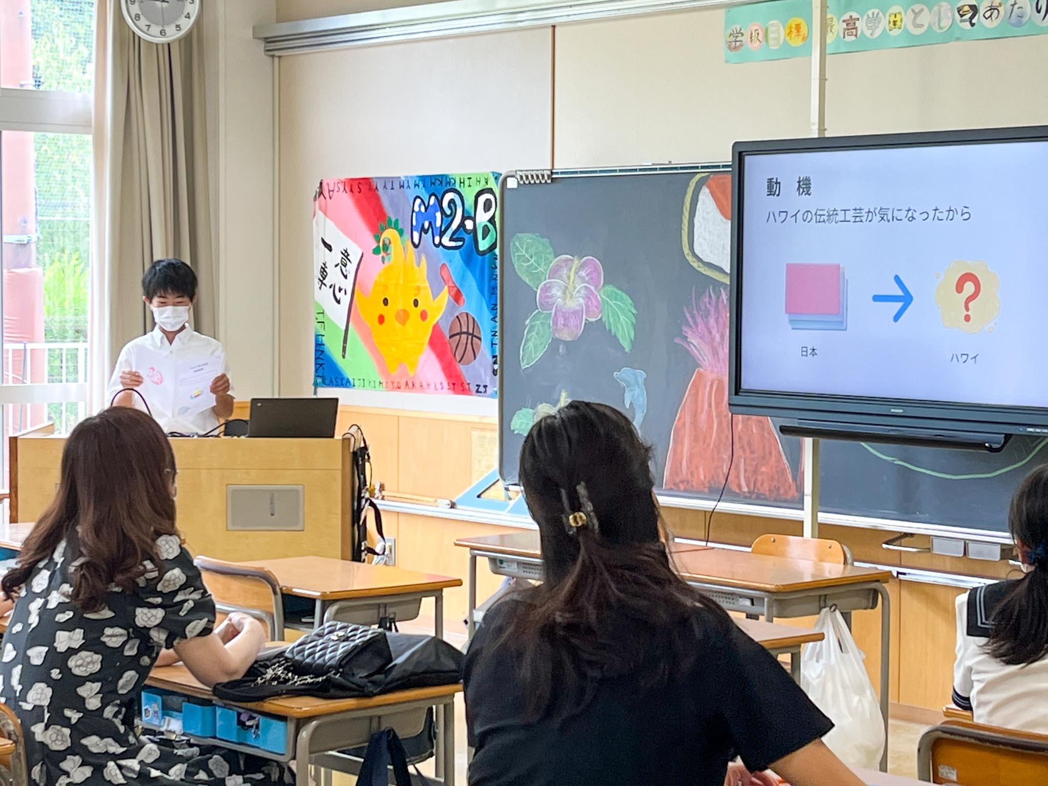 ハワイの調べ学習は、一人一人がその内容についてロイロノートを活用して発表です。保護者の方々に聞いていただくとてもよい機会になりました。また、M2学年のフロアをハワイに見立てて、入り口には入国審査でパスポートが渡され、帰りには出国審査がある、などの工夫がされています。訪れてくれた上級生や保護者の方々も、その雰囲気を楽しんでいただくことができました。