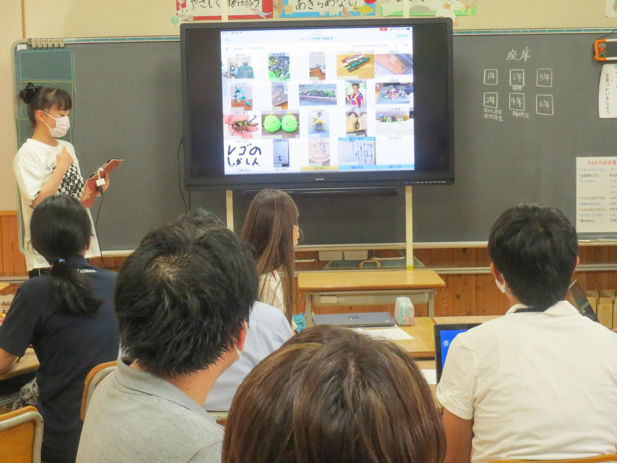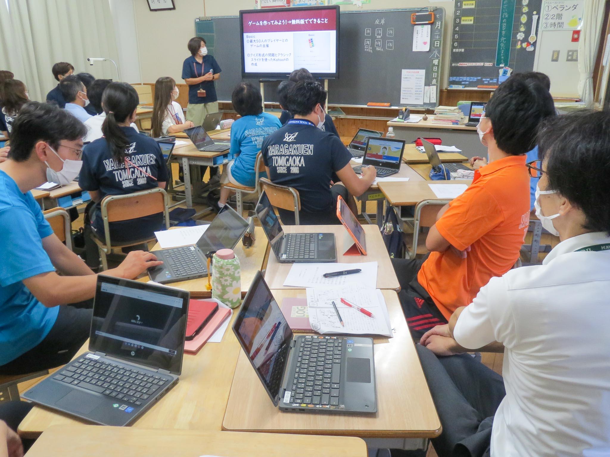 教員全員が集まって、前半は「学習支援ソフト活用の研修会」です。まず、朝の会でのアプリの活用場面や、授業での活用場面の報告。子どもたちが活躍できる場面を作るのに、アプリを工夫して活用することで大変効果的だということが報告内容から伝わってきます。その後、Geogle Jamboardの使い方も共有し、授業において様々に活用することで、子どもたちの意欲や関心を高めていくことにつないでいきたいと話し合いました。