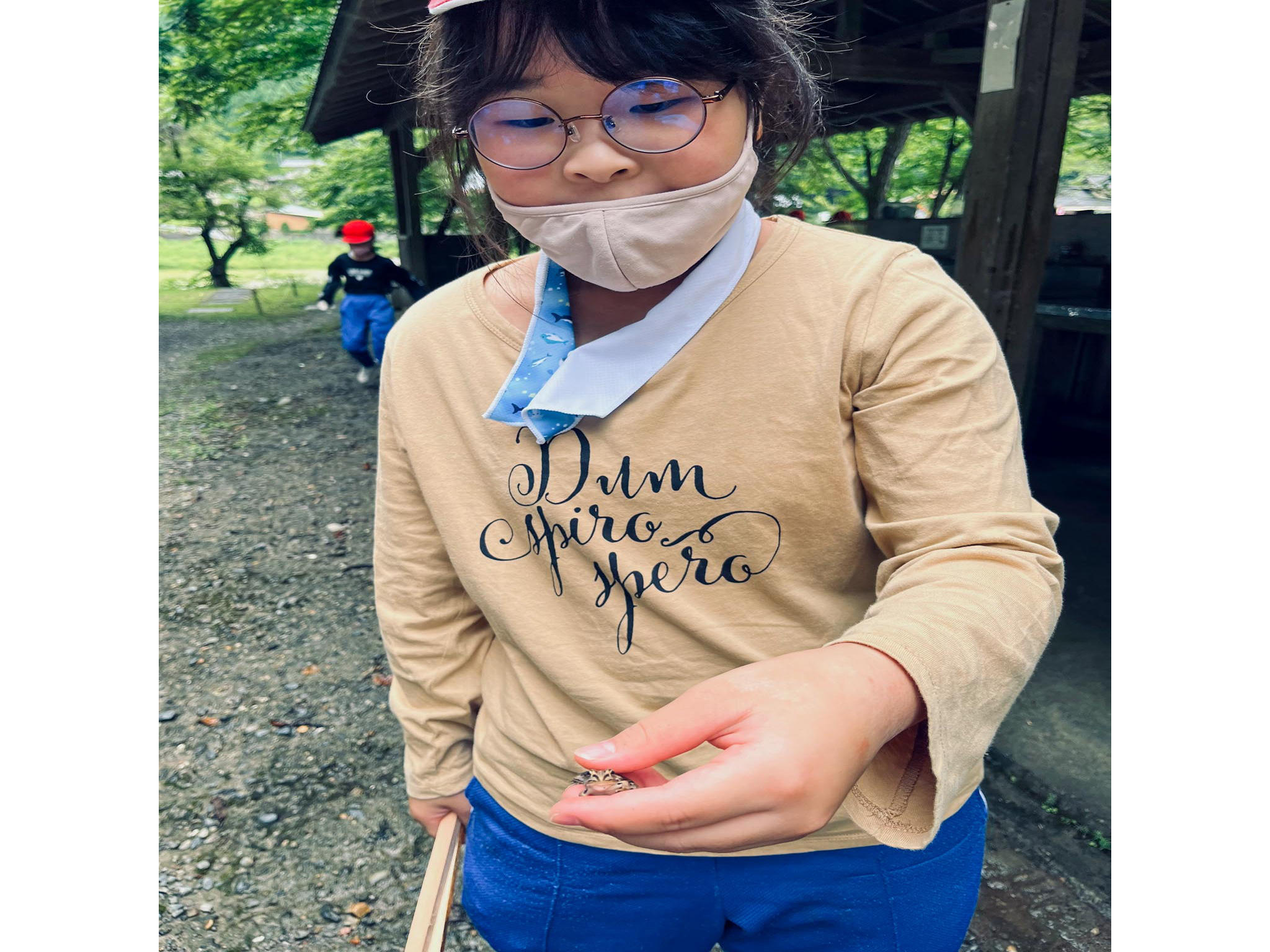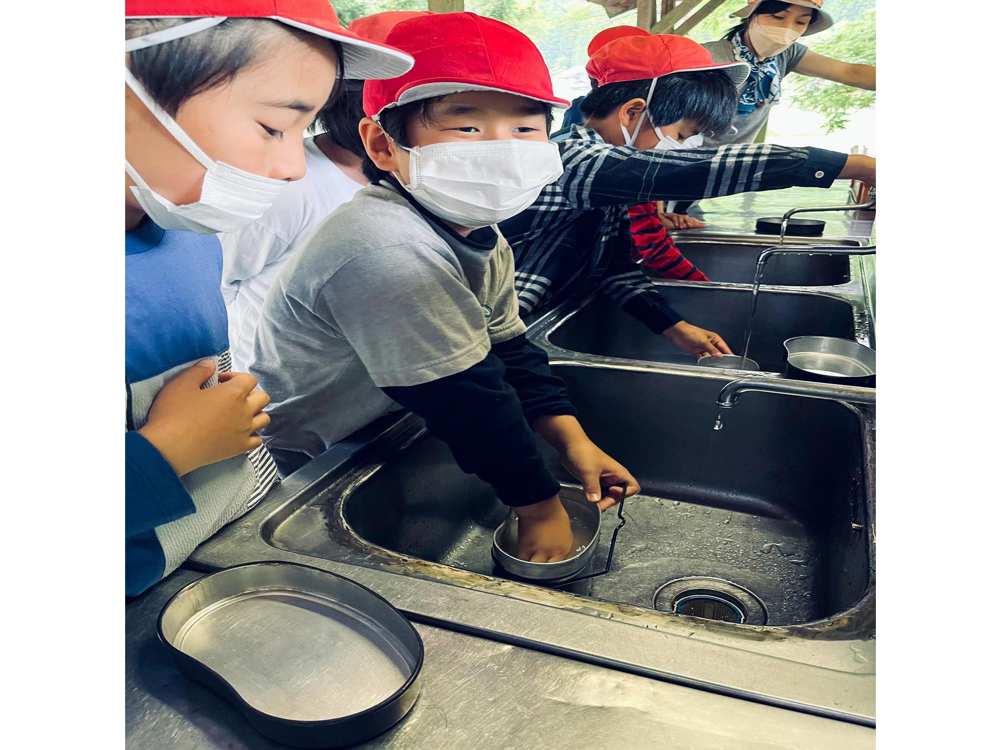 まずは薪割り。初めてなたを使って薪割りをする子どもたちは怖がりながらも、上手く薪割りができました。薪割りができるたびに歓声が上がっていました。カエルもいました。自然いっぱいです。お米を洗って、いよいよお米を炊きます。