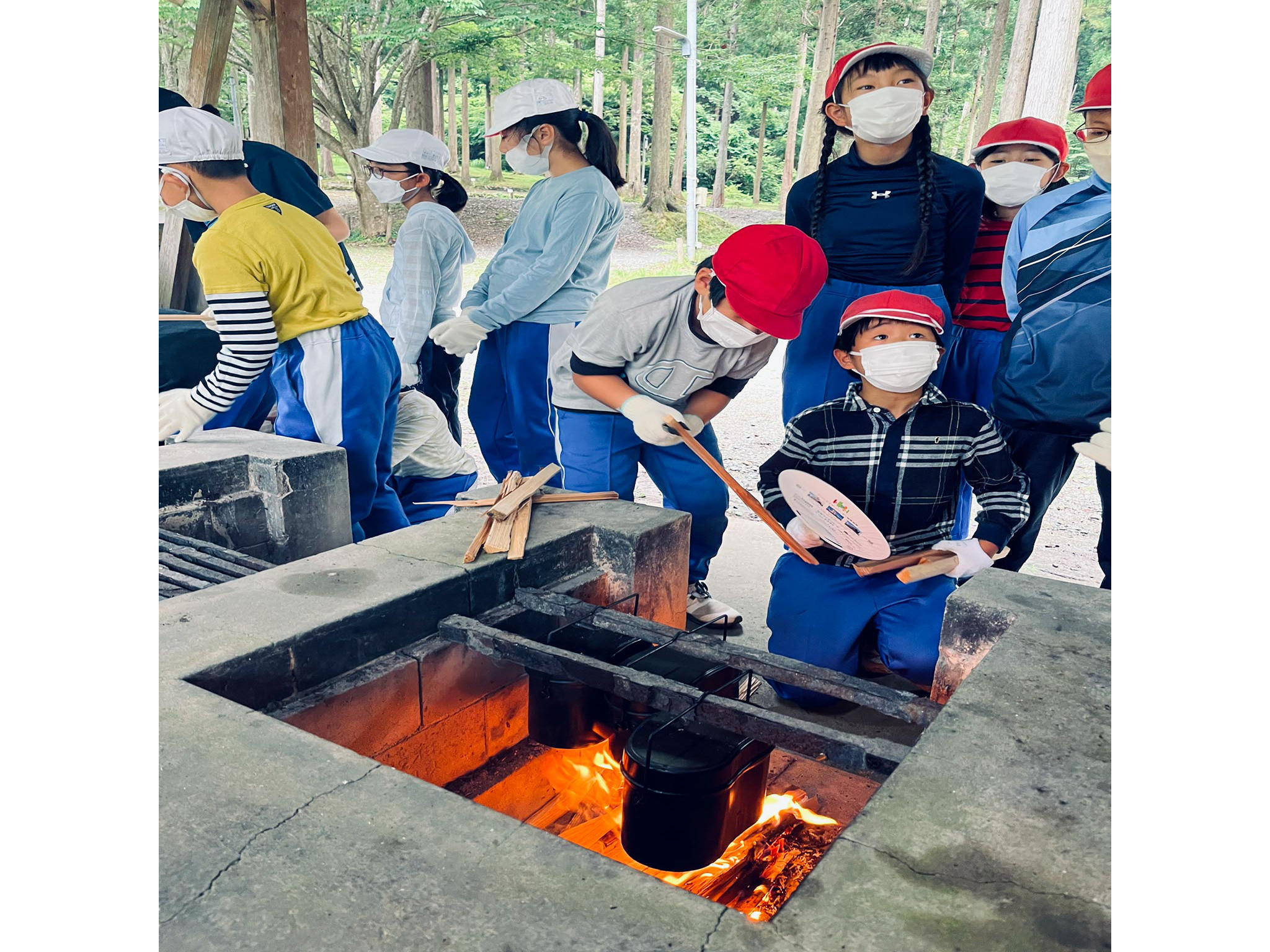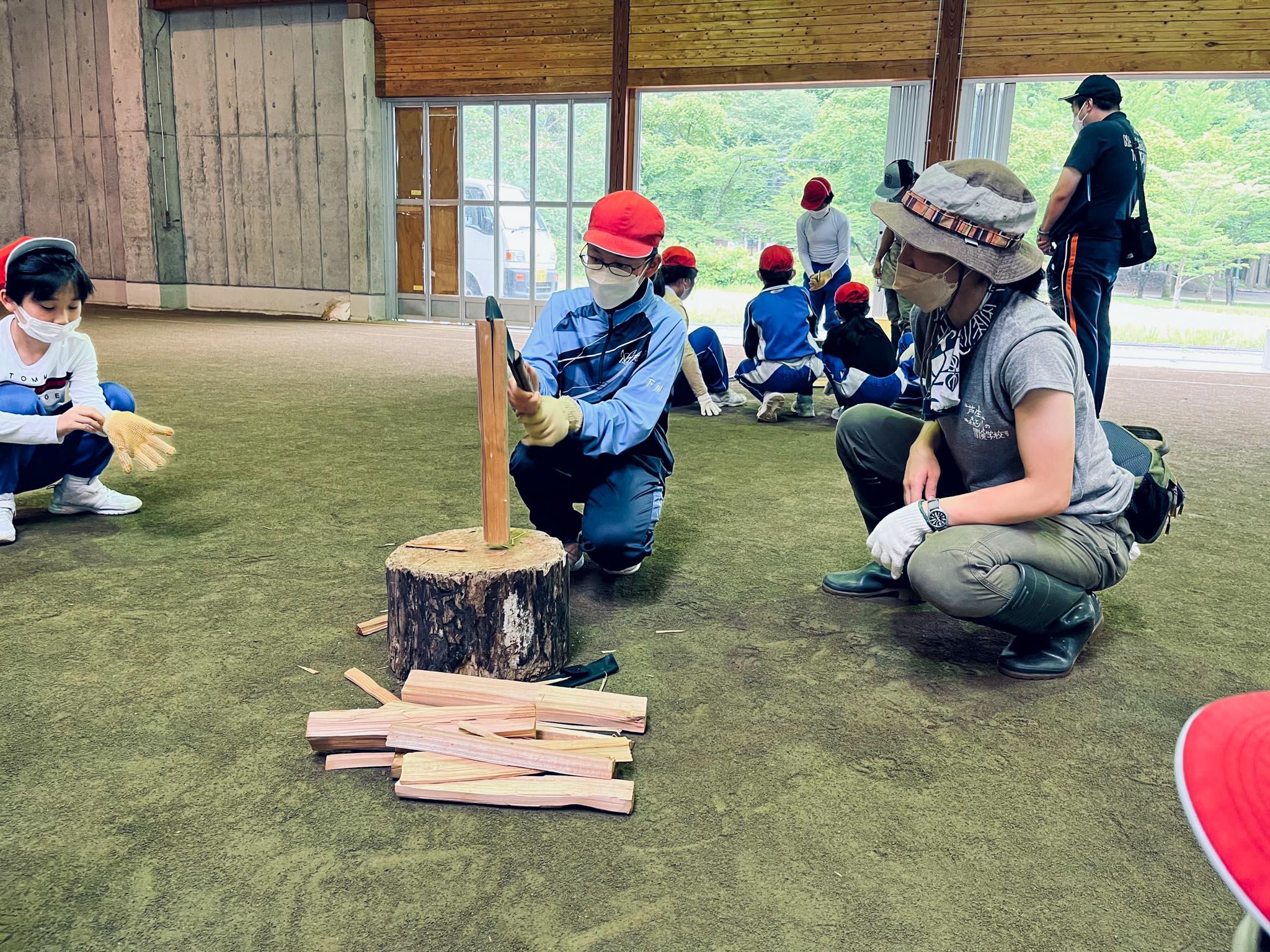 雨が心配された初日ですが、どうにか大雨に降られることもなく、1日目午前中の体験を終えました。薪割り体験ののちに飯盒炊飯です。