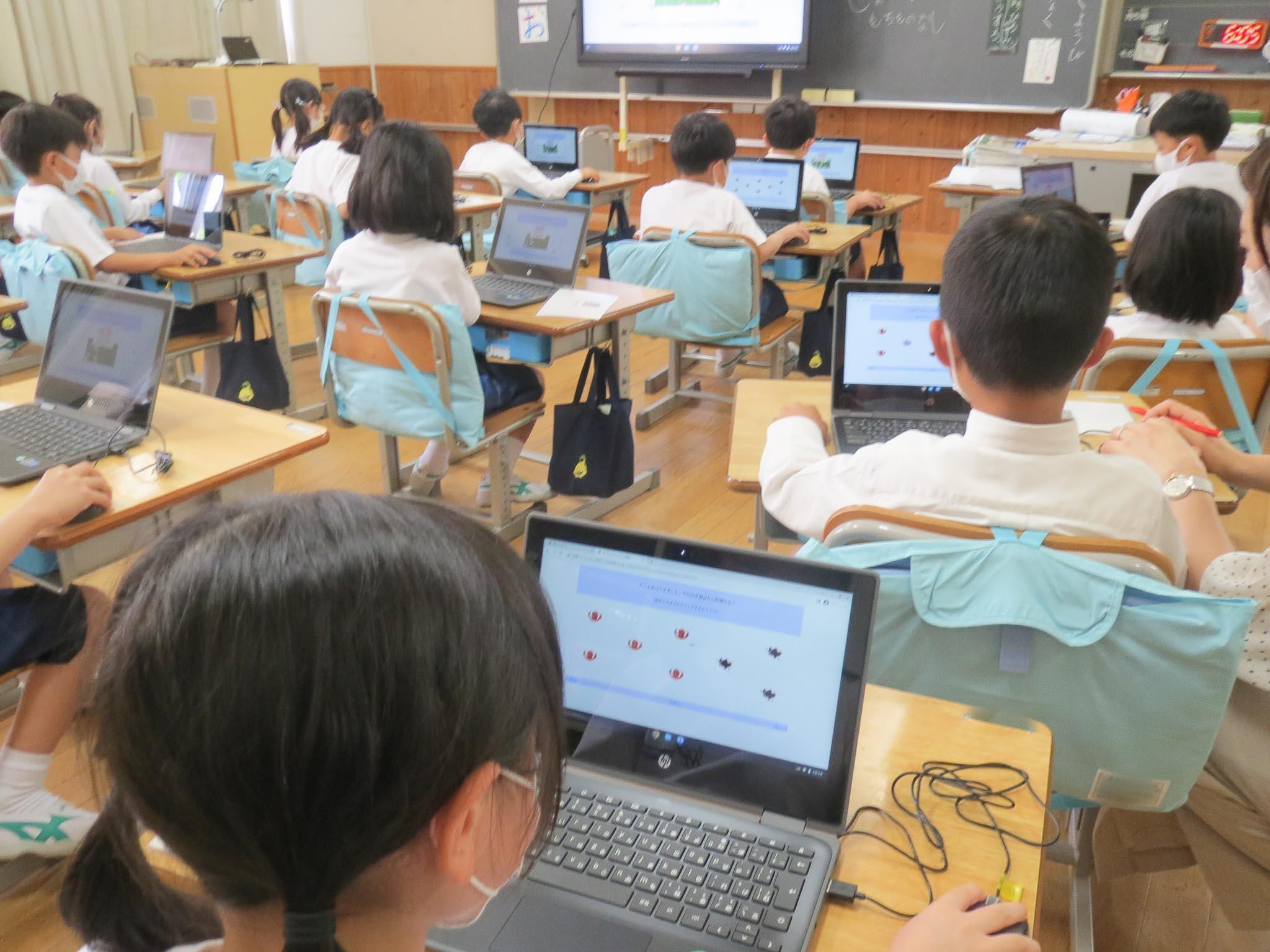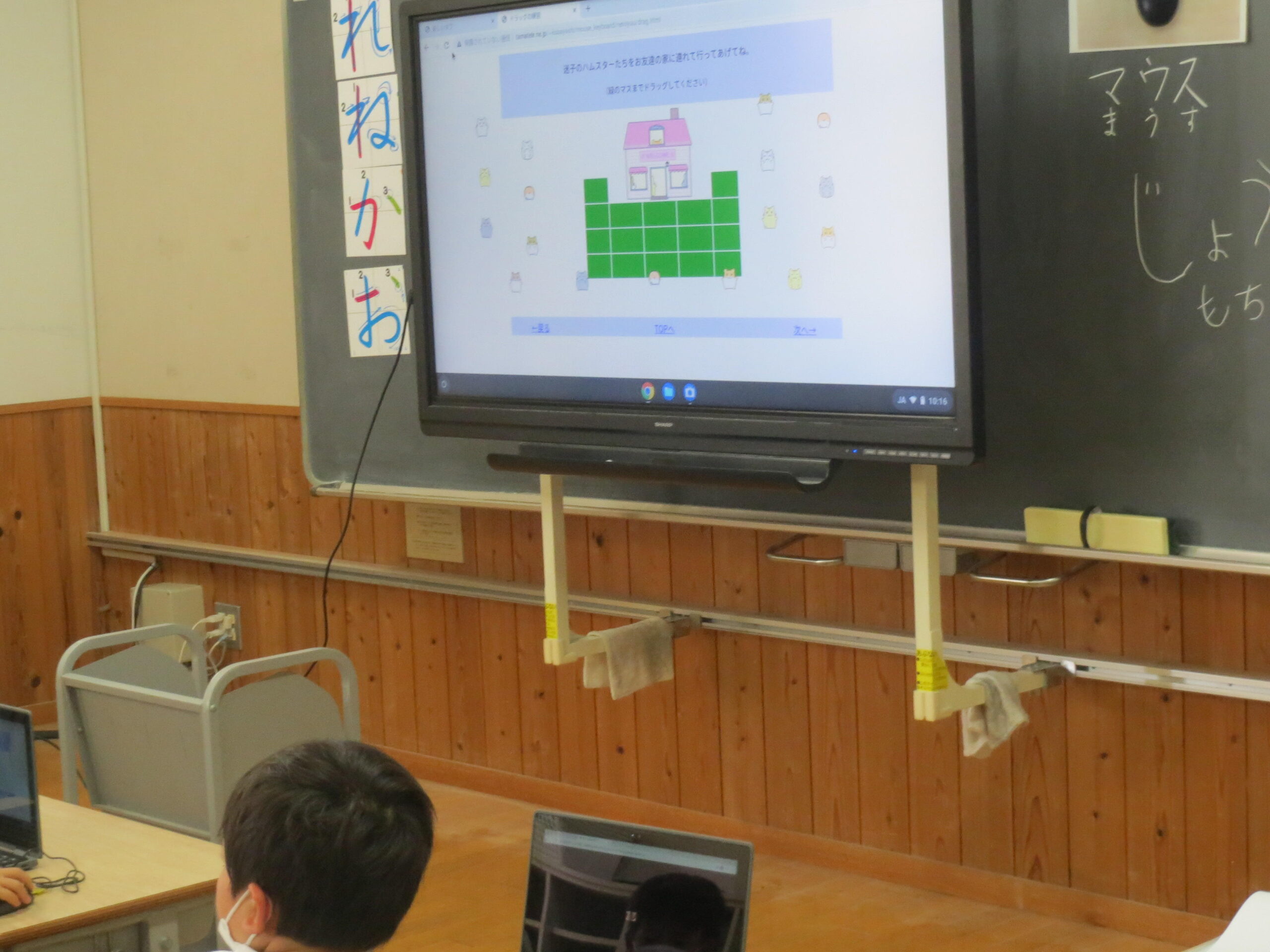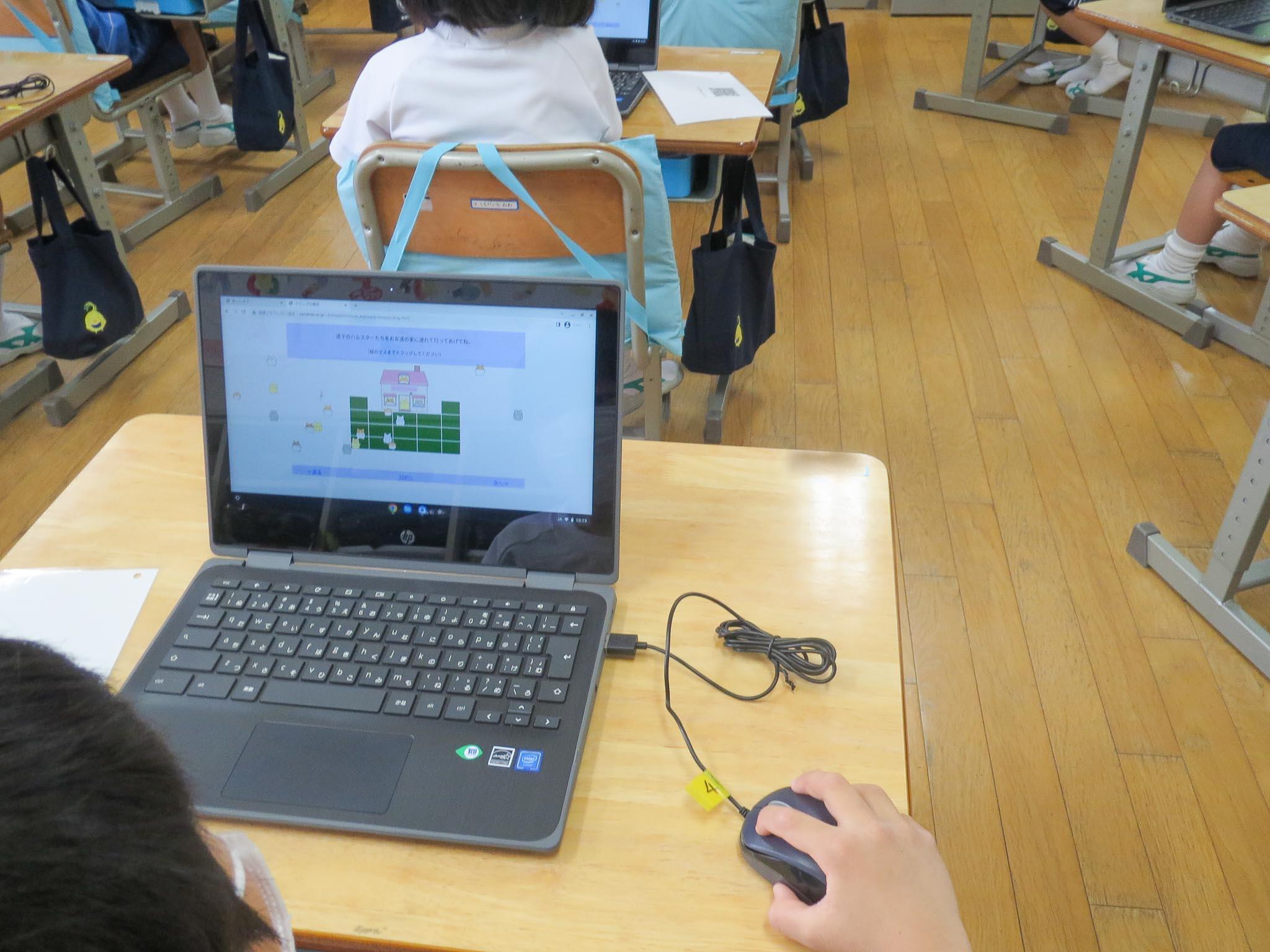 「あ、ねずみが逃げた」「どっかいっちゃった」「うまくおうちに入ったよ」など、一人一人のつぶやきの声が聞こえてきます。使うことなど簡単に思えるマウスですが、一年生という発達段階において、人差し指指先だけを使った操作は、結構難しいものなのです。このような時間を丁寧に積み重ねることで、操作スキルを身に付けていきます。