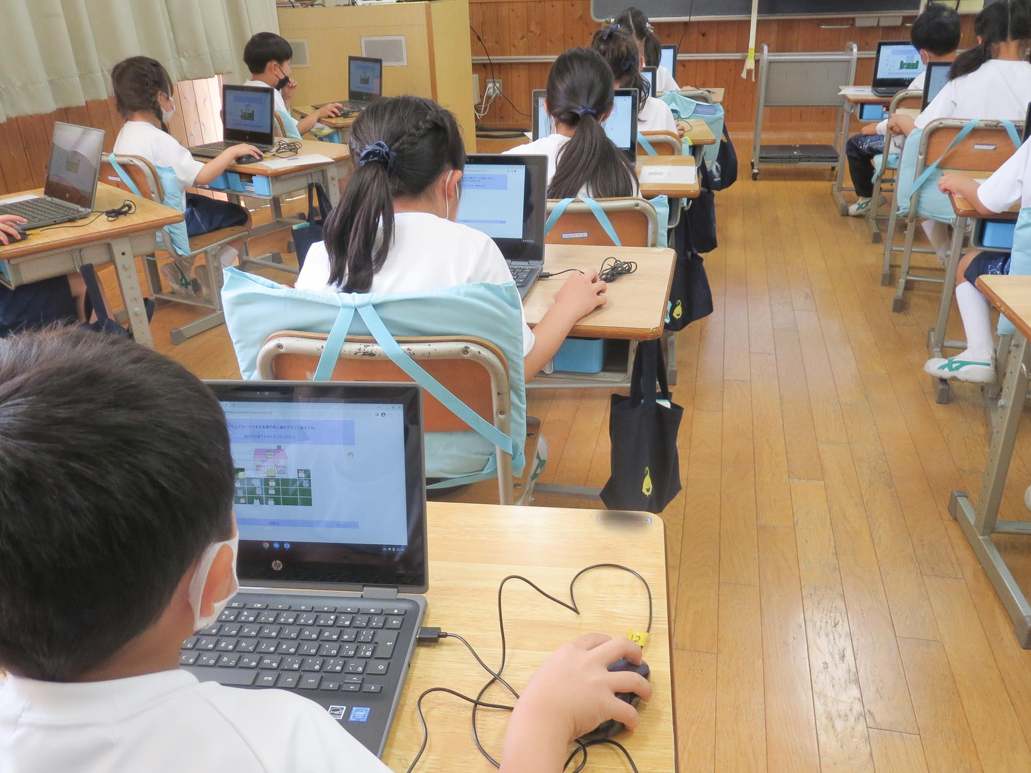 P1(小学1年)生の情報の時間。一人一台のPCを使って動かすのは2回目です。PCの扱い方の学習です。