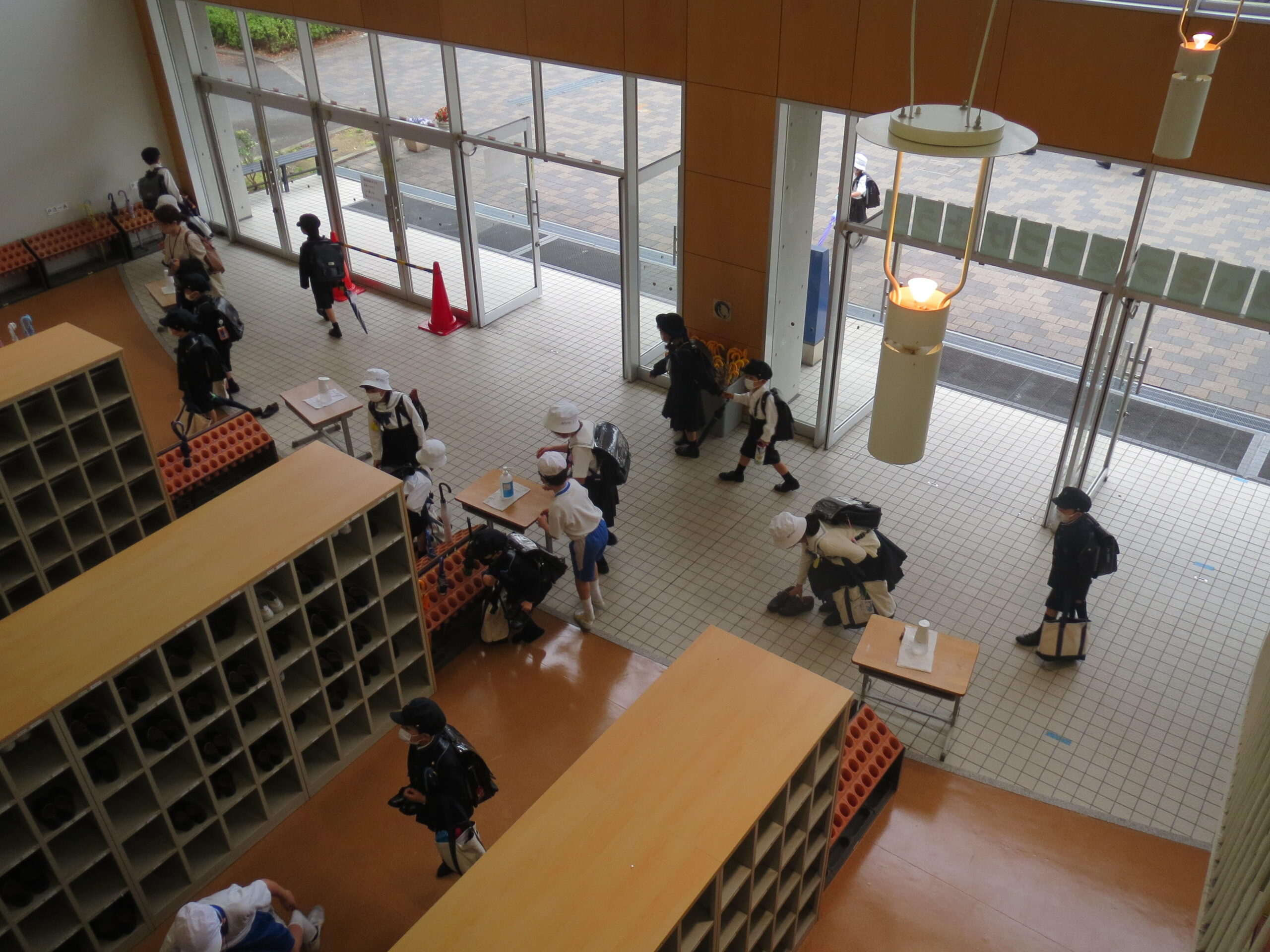 朝の登校時の子どもたち。校歌に迎えられる昇降口で元気に挨拶をしてくれる声から、今日も一日楽しく過ごしてくれそうだなと感じ取ることができます。友達と教室の前で過ごす高学年の子どもたちもいれば、元気に先生と一緒に運動場に飛び出して遊んでいる子どもたちもいます。M2(小学6年)生のステーションでは、「かめっち」も子どもたちの登校を迎えてくれています。