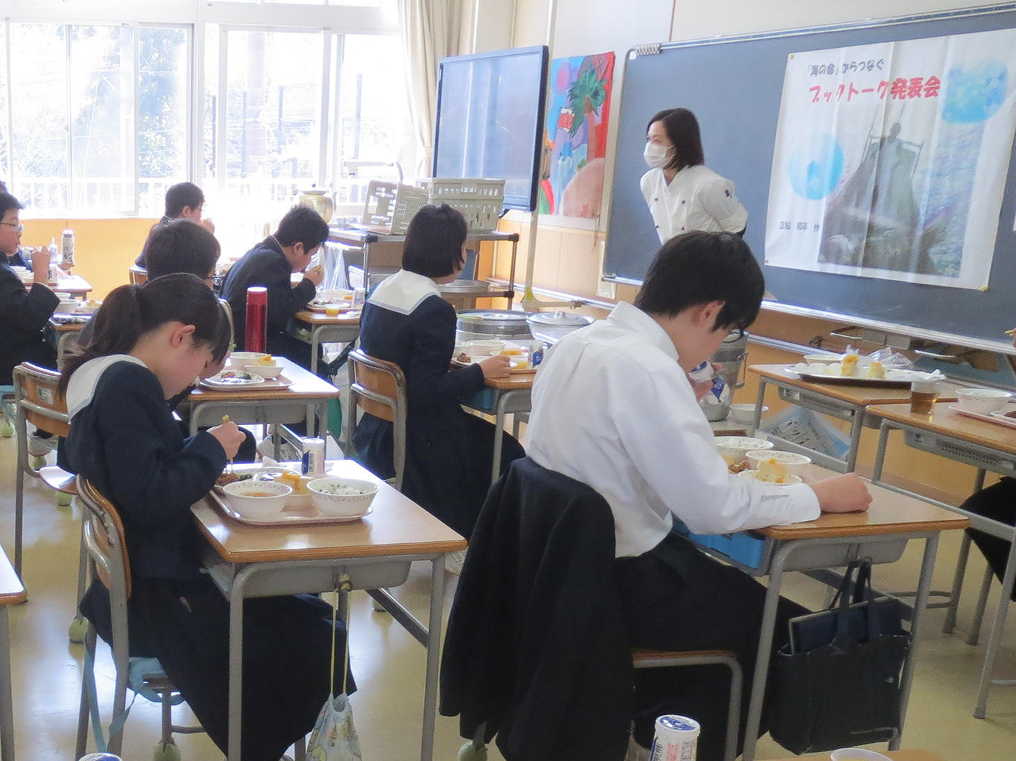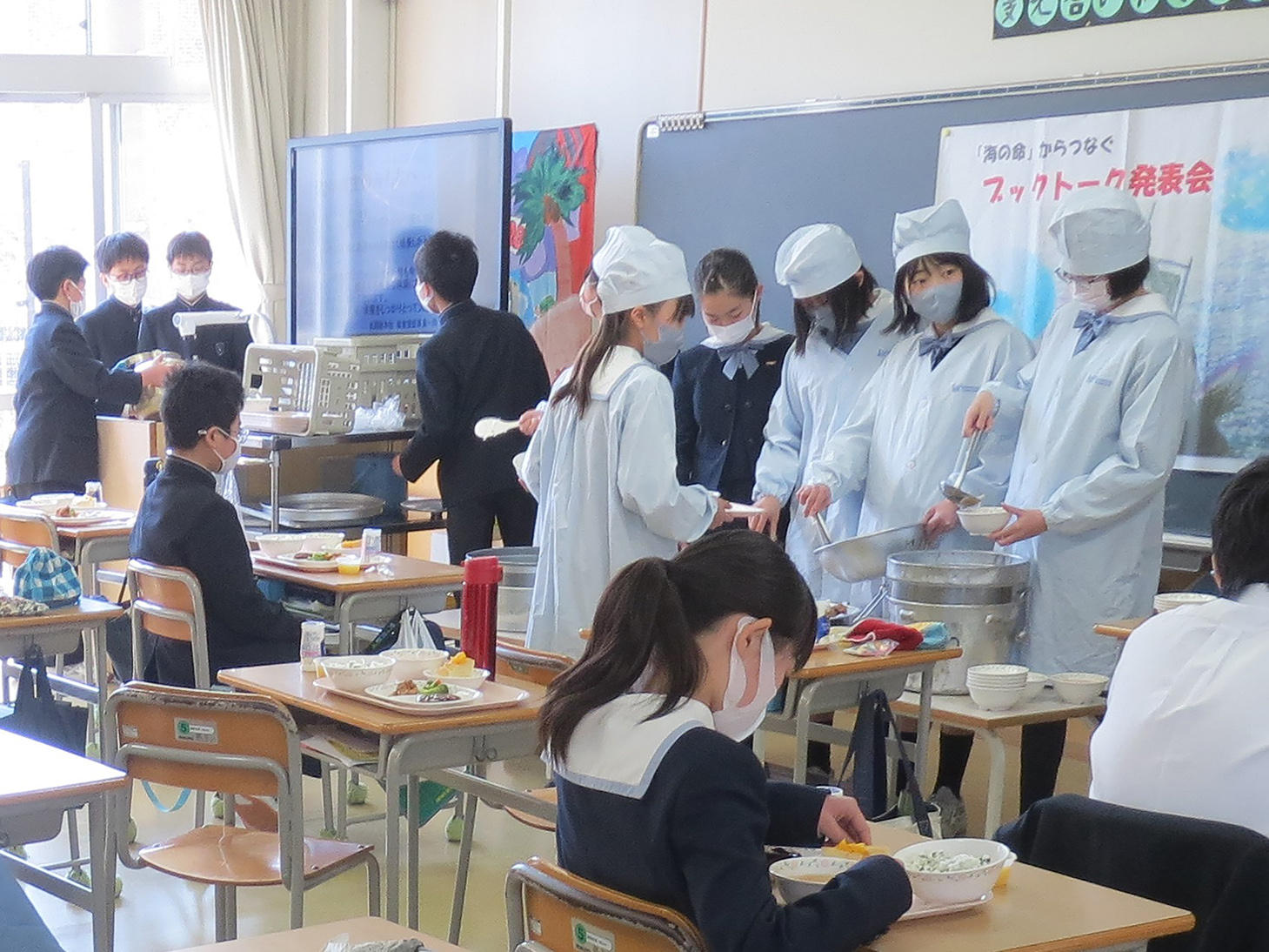 栄養士や調理員の方々も教室に来てくださって、卒業を迎える子どもたちにお話もしていただきました。6年間あるいは奈良学園幼稚園から内部進学した子どもは9年間、いただいた給食です。そんな思いを込めながらの給食。4時間目に活動していたブックトークの掲示や一生懸命作成した新1年生の教室前の掲示物を黒板に残したまま、どの子の顔も「おいしい!」と言っています。