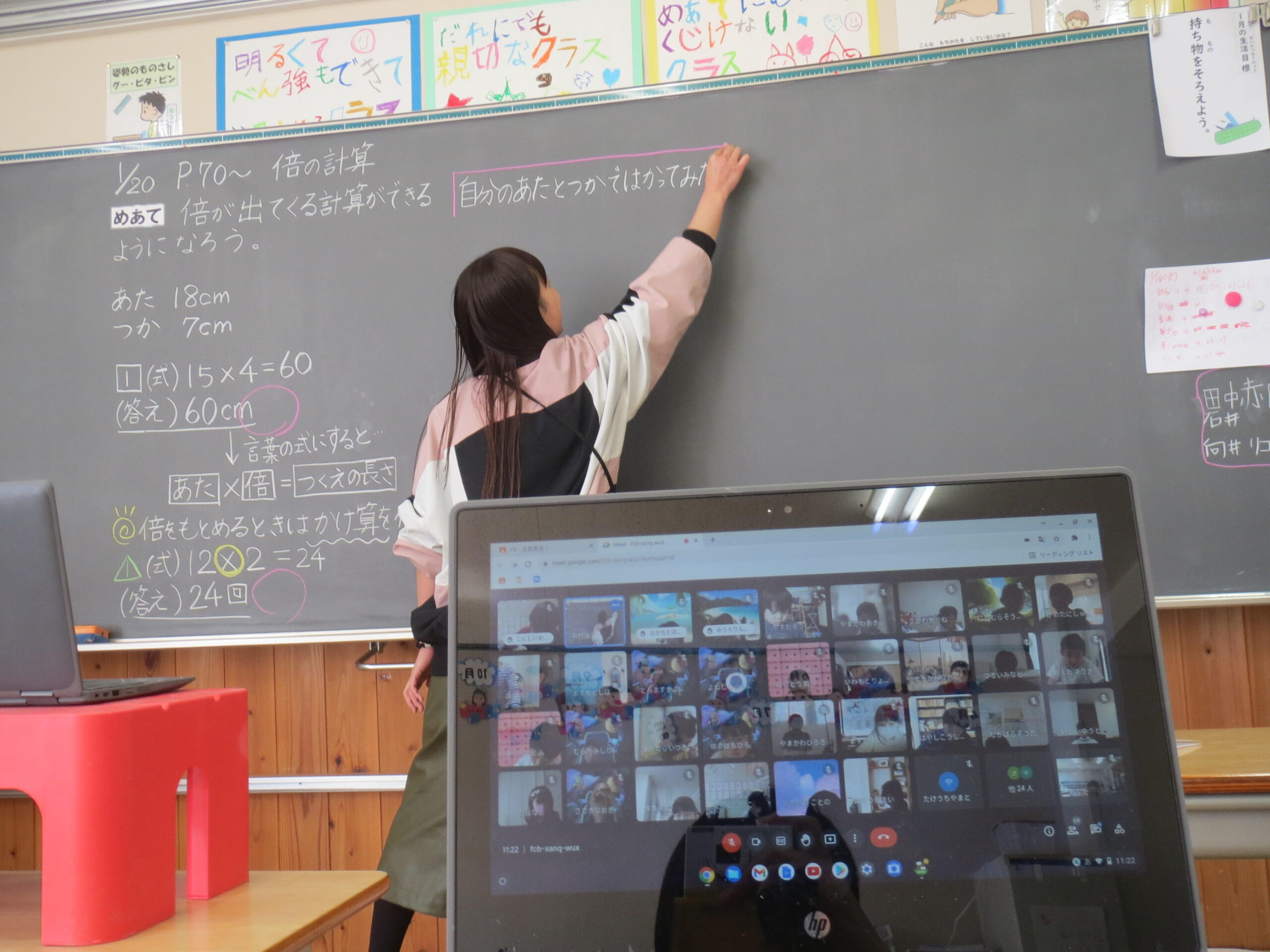 新型コロナウイルスの影響で学年や学級で臨時休業になることも起こっていますが、体調がよければ、家庭で学びを止めることなく学習を進められるように、授業を配信して対応しています。2年生まではロイロノートを活用して、3年生以上はmeetとロイロノートを組み合わせて活用しています。