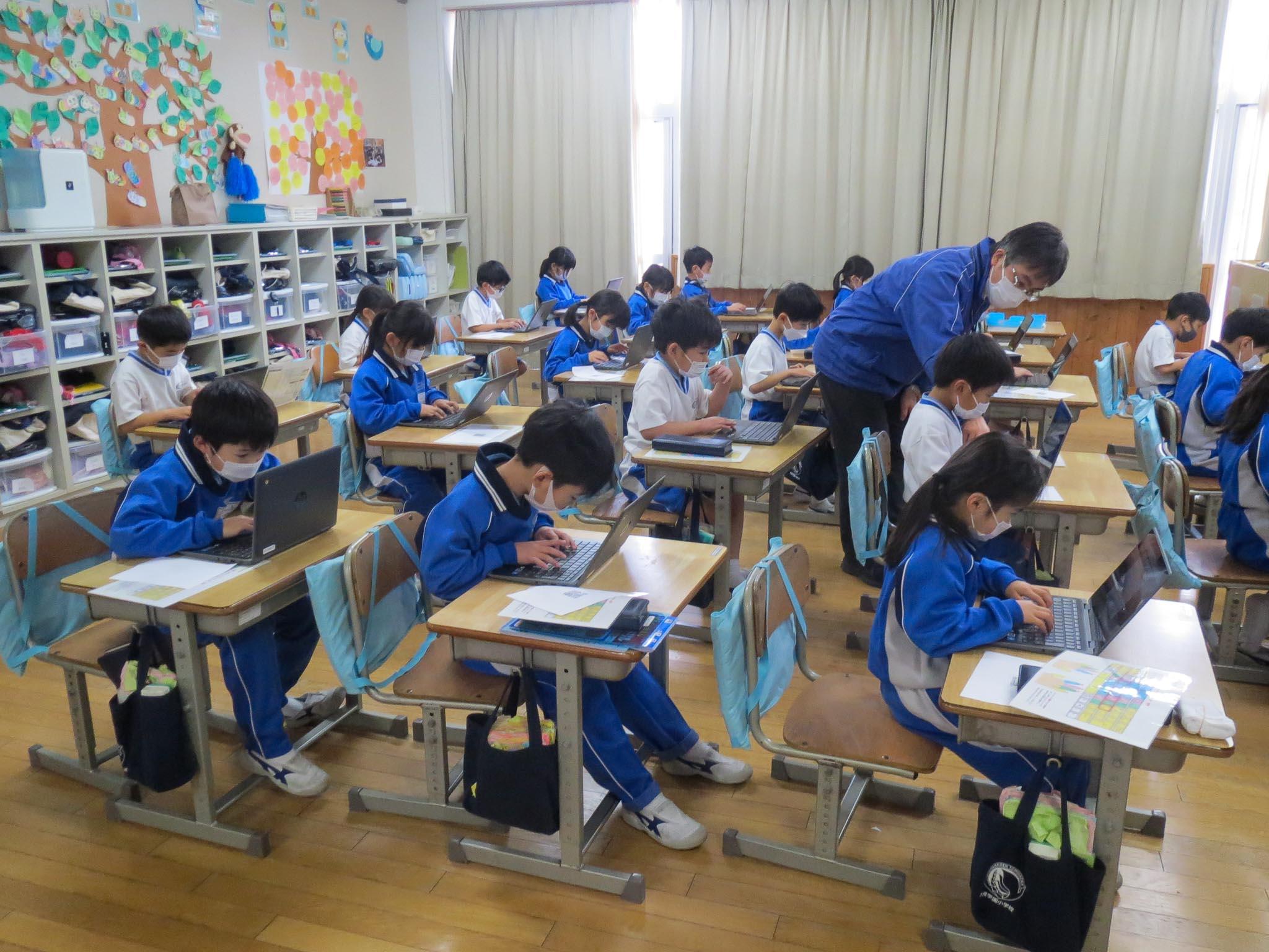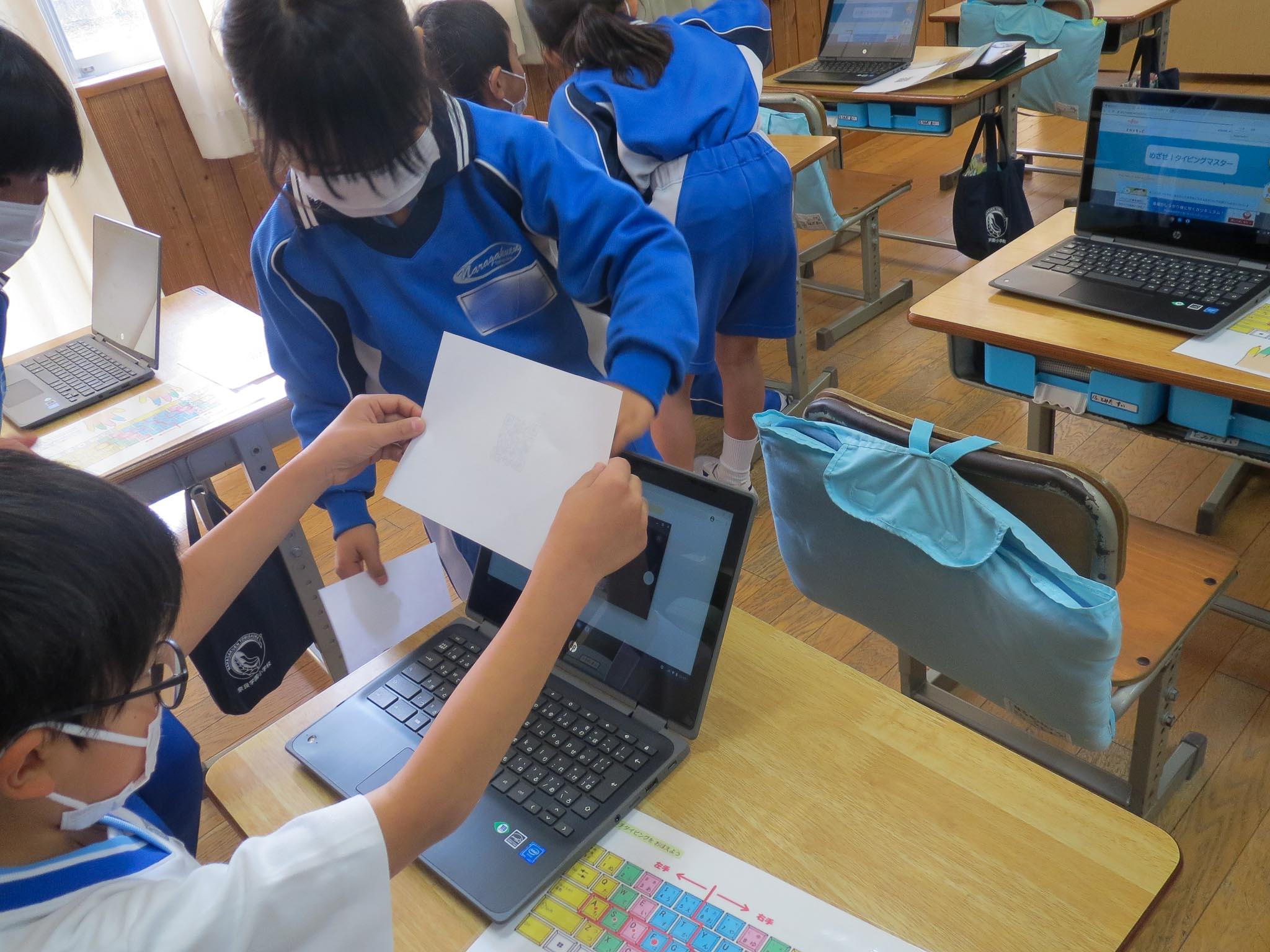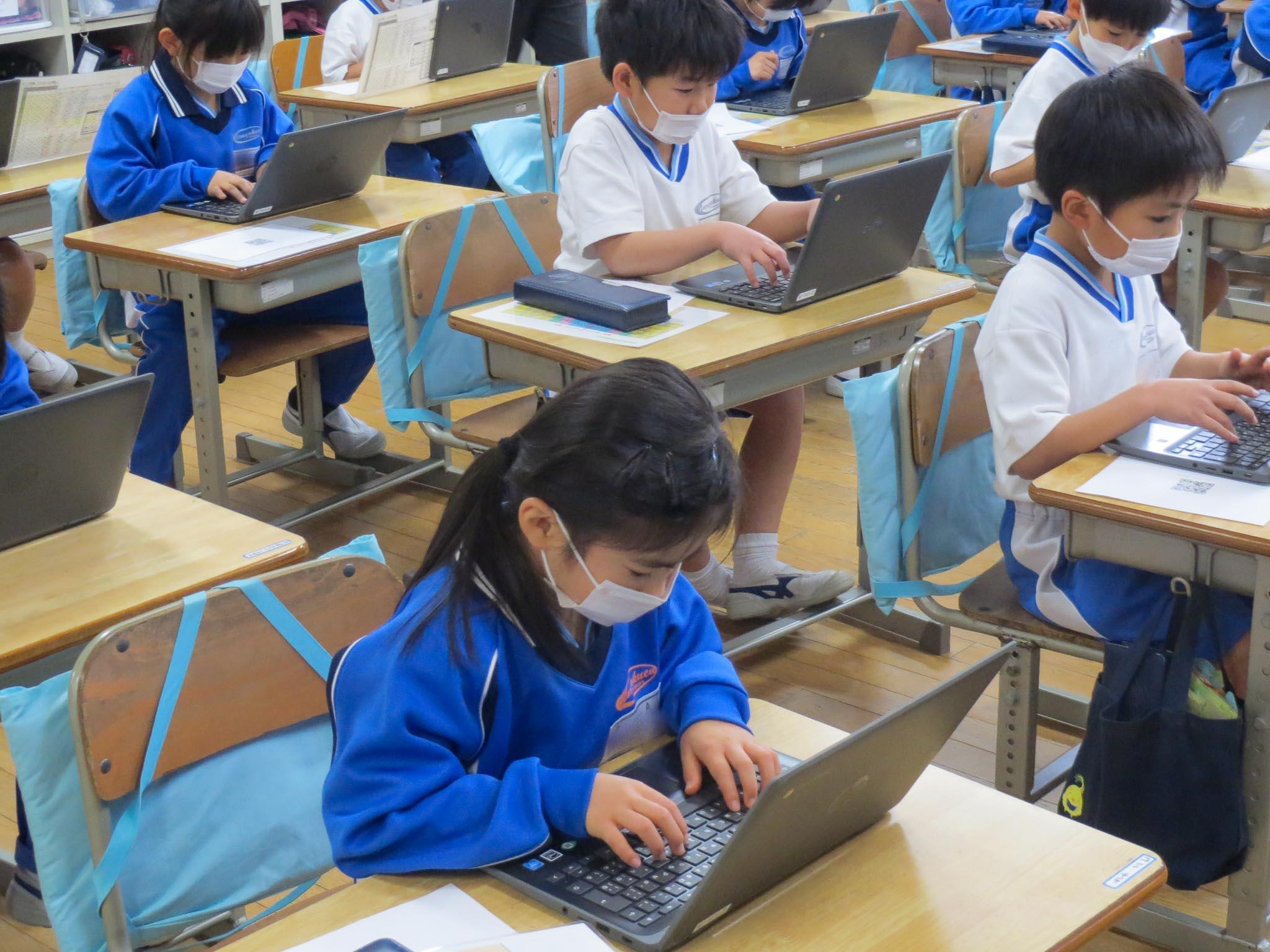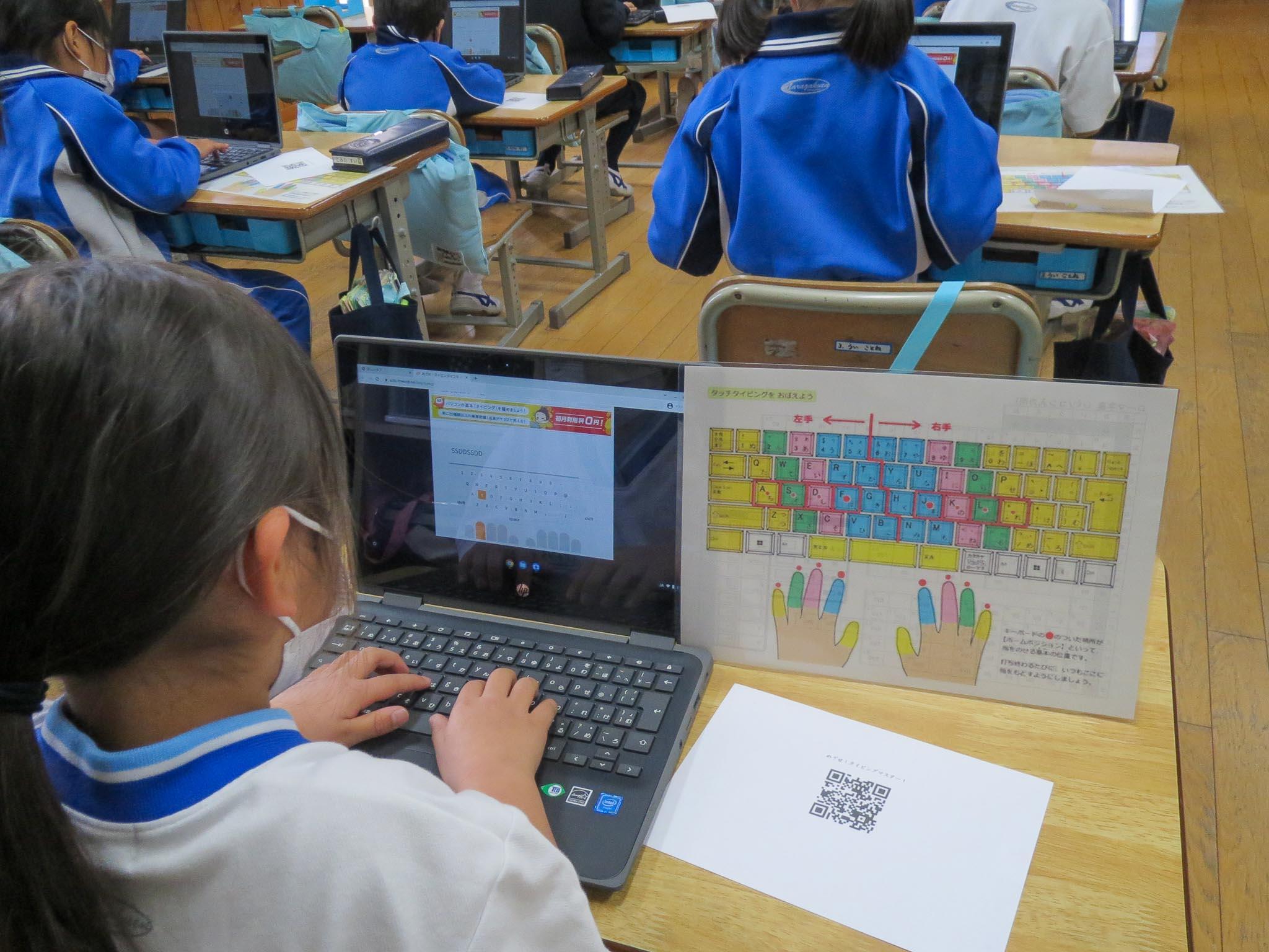 みんな学校用のクロムブックを使っています。PCを立ち上げ、ログインして…。QRコードを読み込んで「めざせ!タイピングマスター」のアプリを起動させていました。全員が上手に起動できたことに指導する教員もびっくりです。子どもたちは、両手の指のポジションについても教えてもらい、タイピング練習の始まりです。これまで経験しなかったことができるようになっていくことを、とっても楽しんでいる様子がうかがえます。