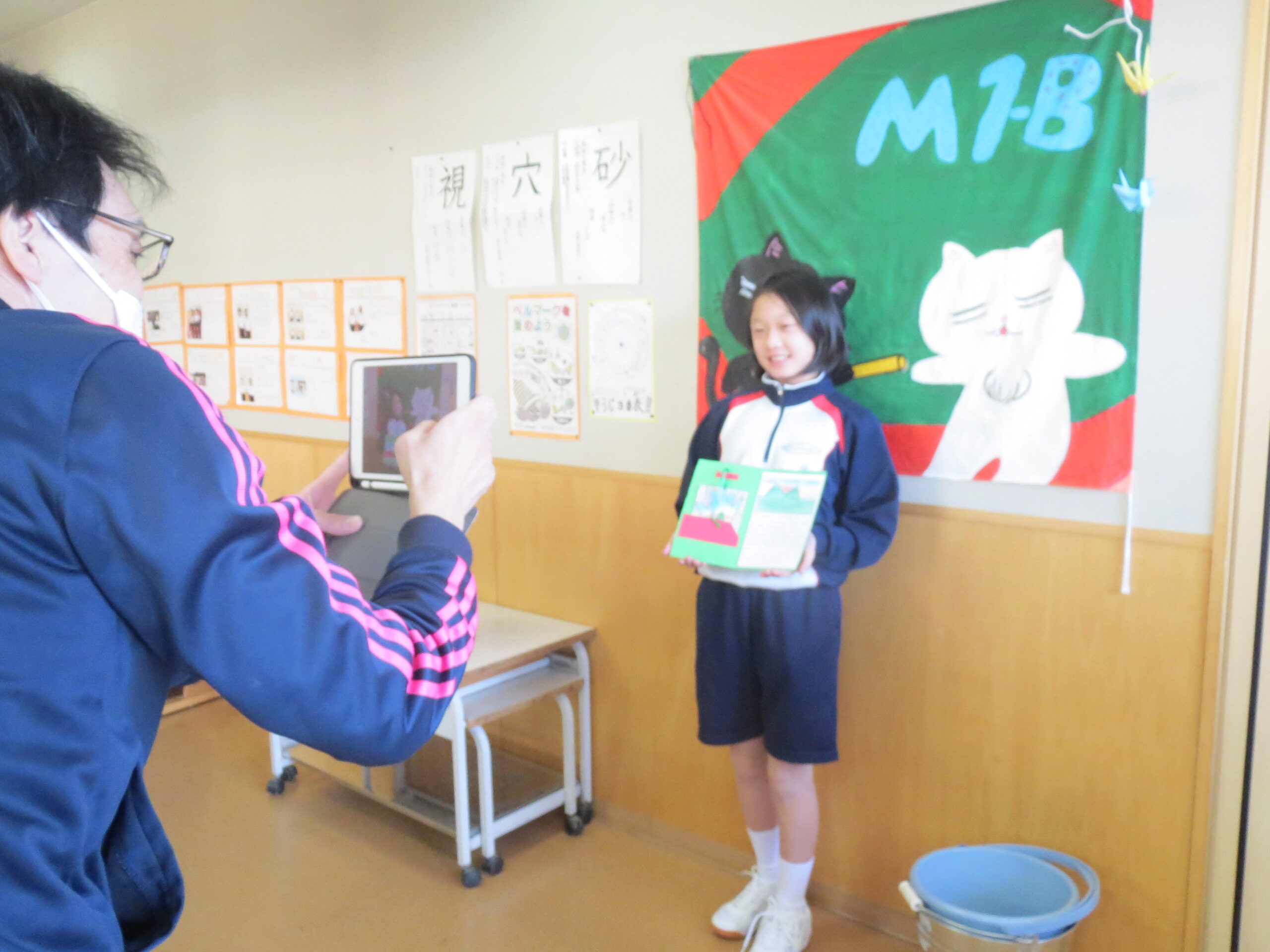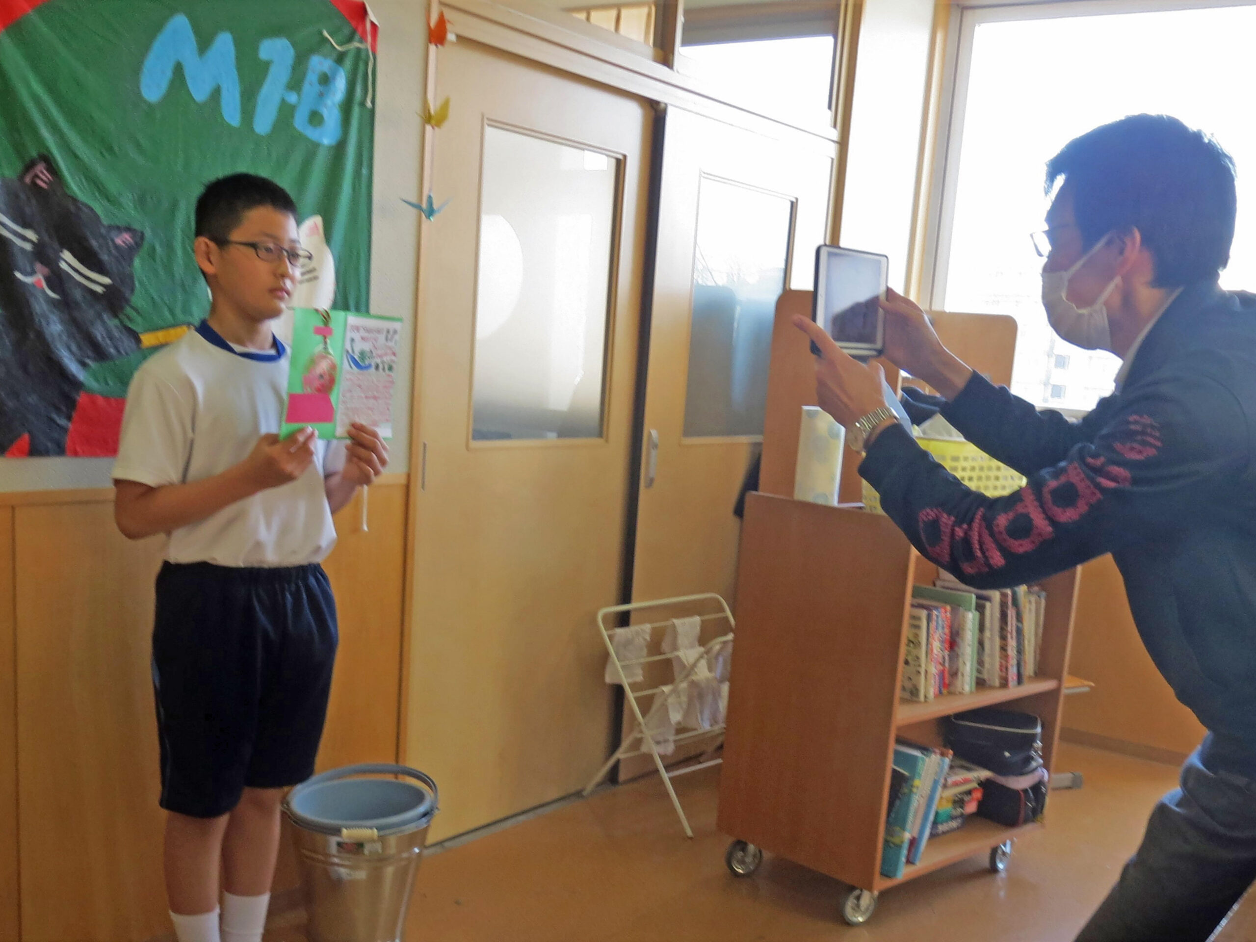英語の時間、一人一人がカードをもって写真に撮り、メリノール校にお礼を送ろうと準備をしてくれていました。来週には、Webexを使って実際に顔を見ながらペアとの自己紹介も行う予定です。
