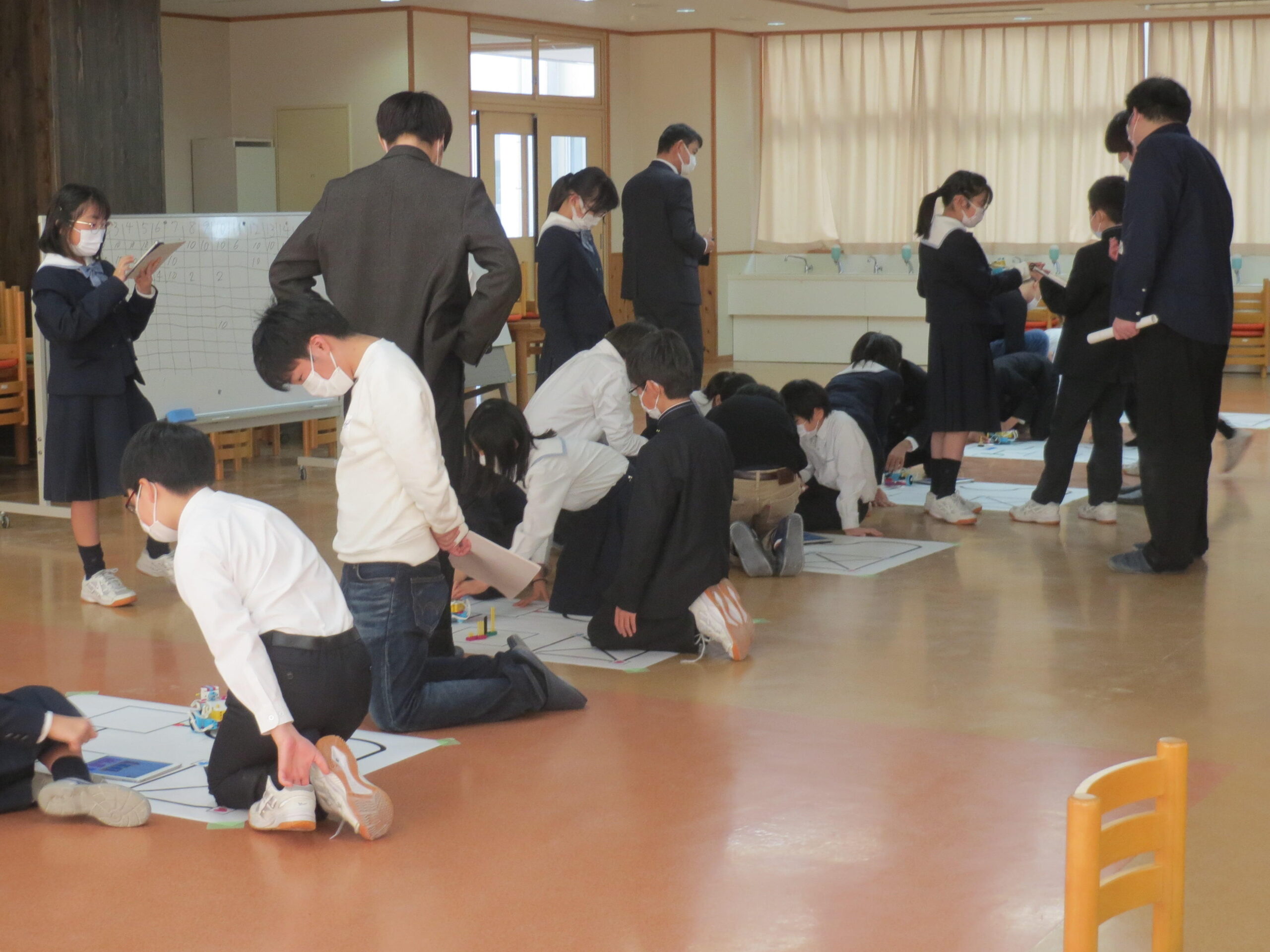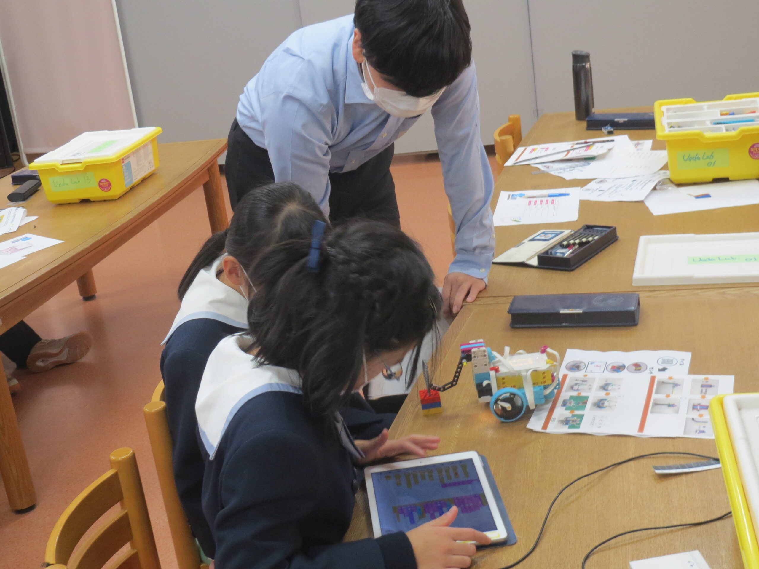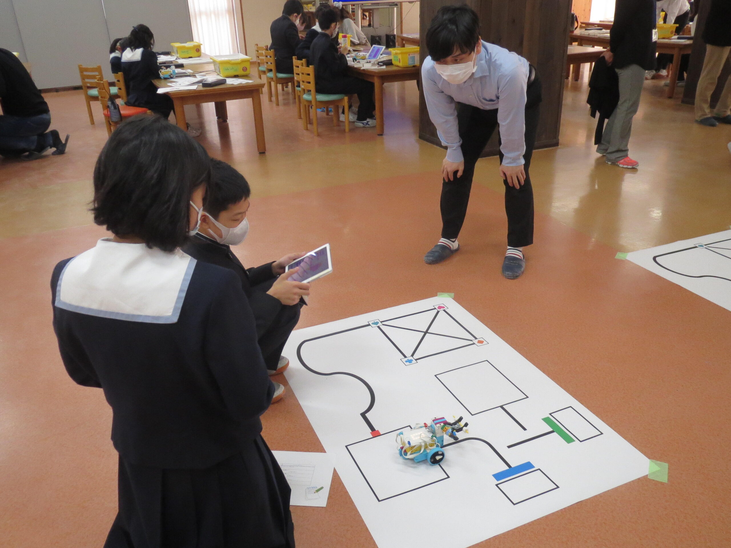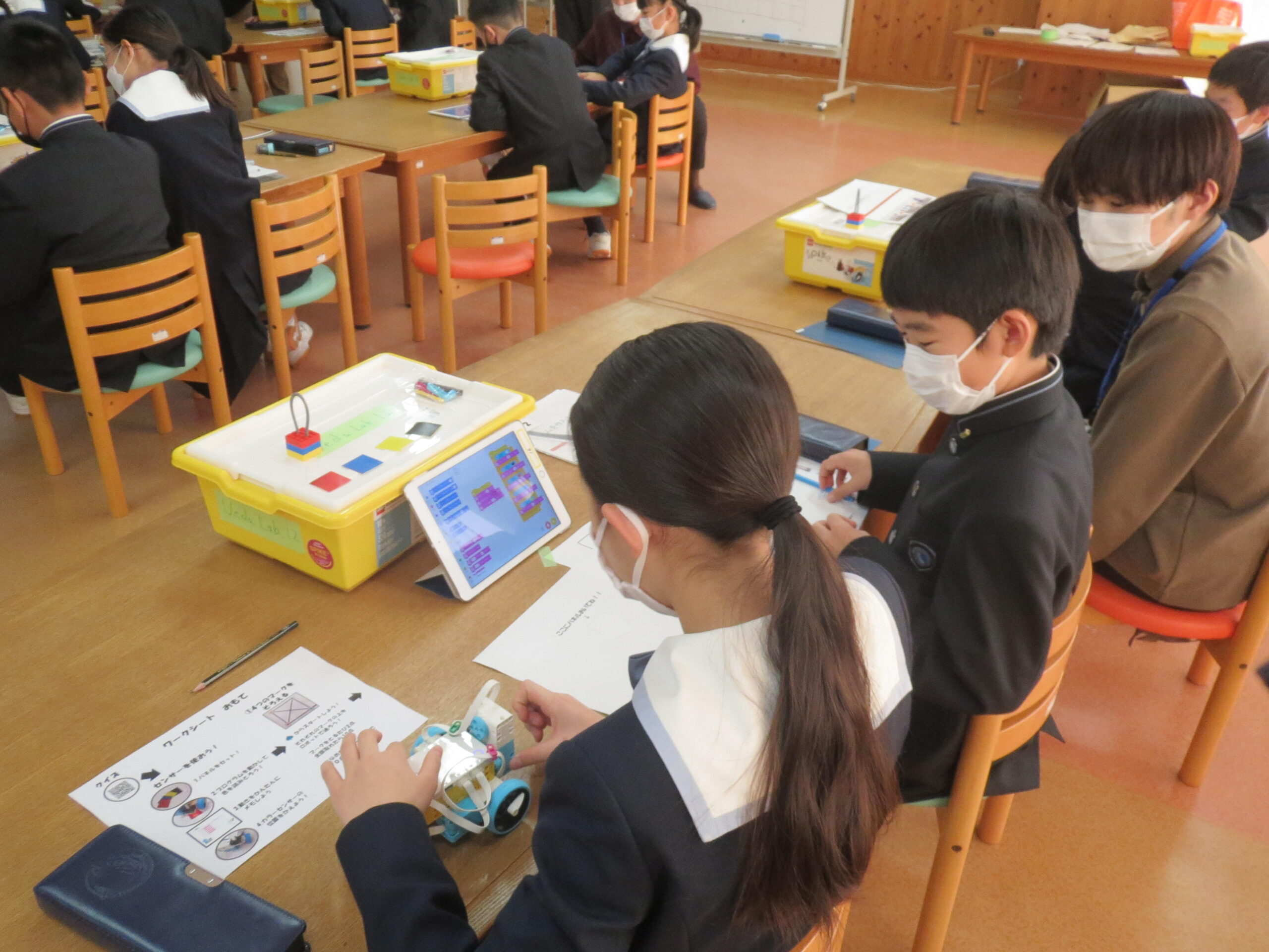 大阪工業大学のロボティクス&デザイン工学部ロボット工学科の上田悦子先生と学生さんたちが、M1(小学5年)生に「ロボットプログラミングを体験しよう」としてプログラミングの授業をしてくださいました。