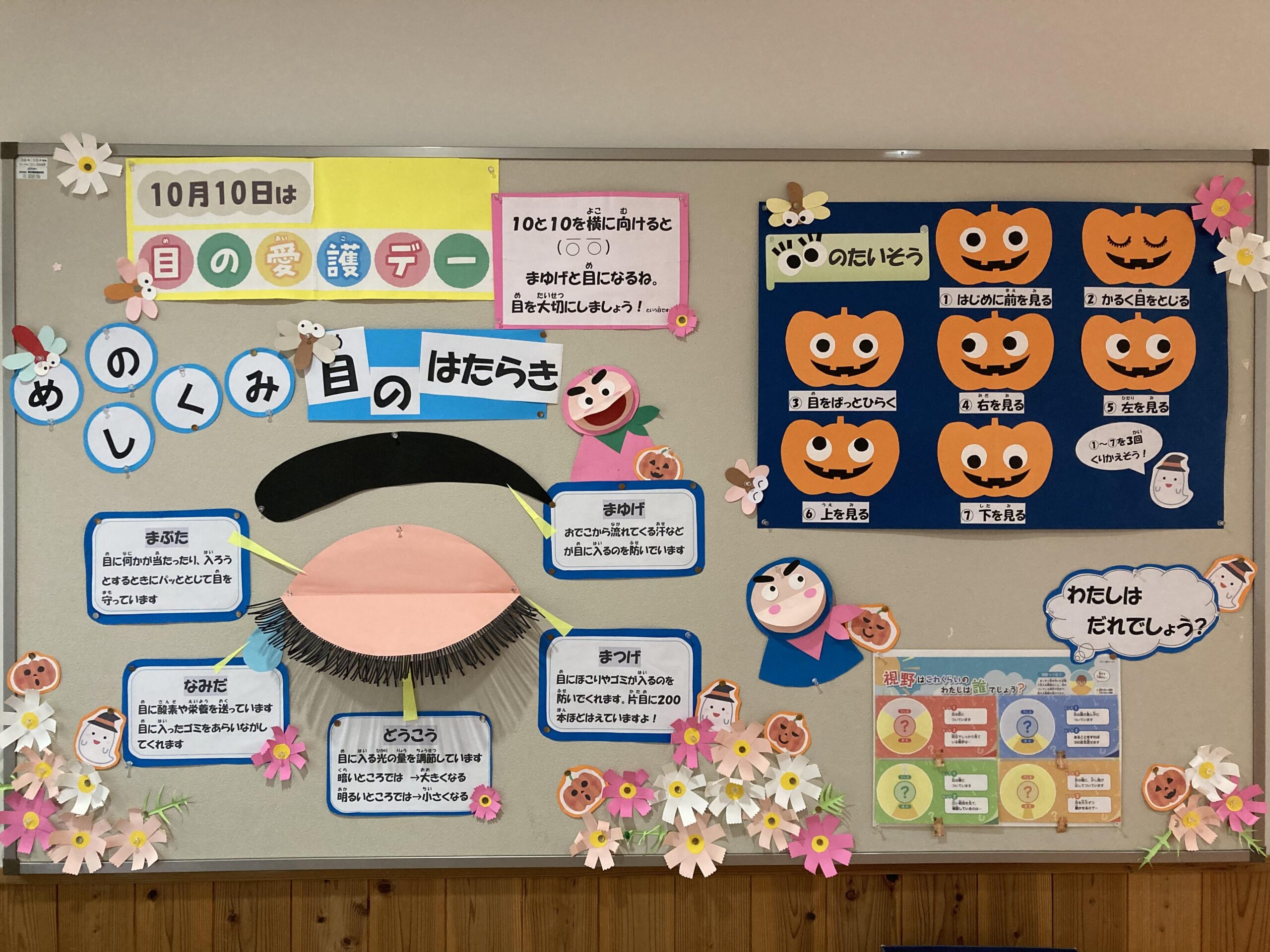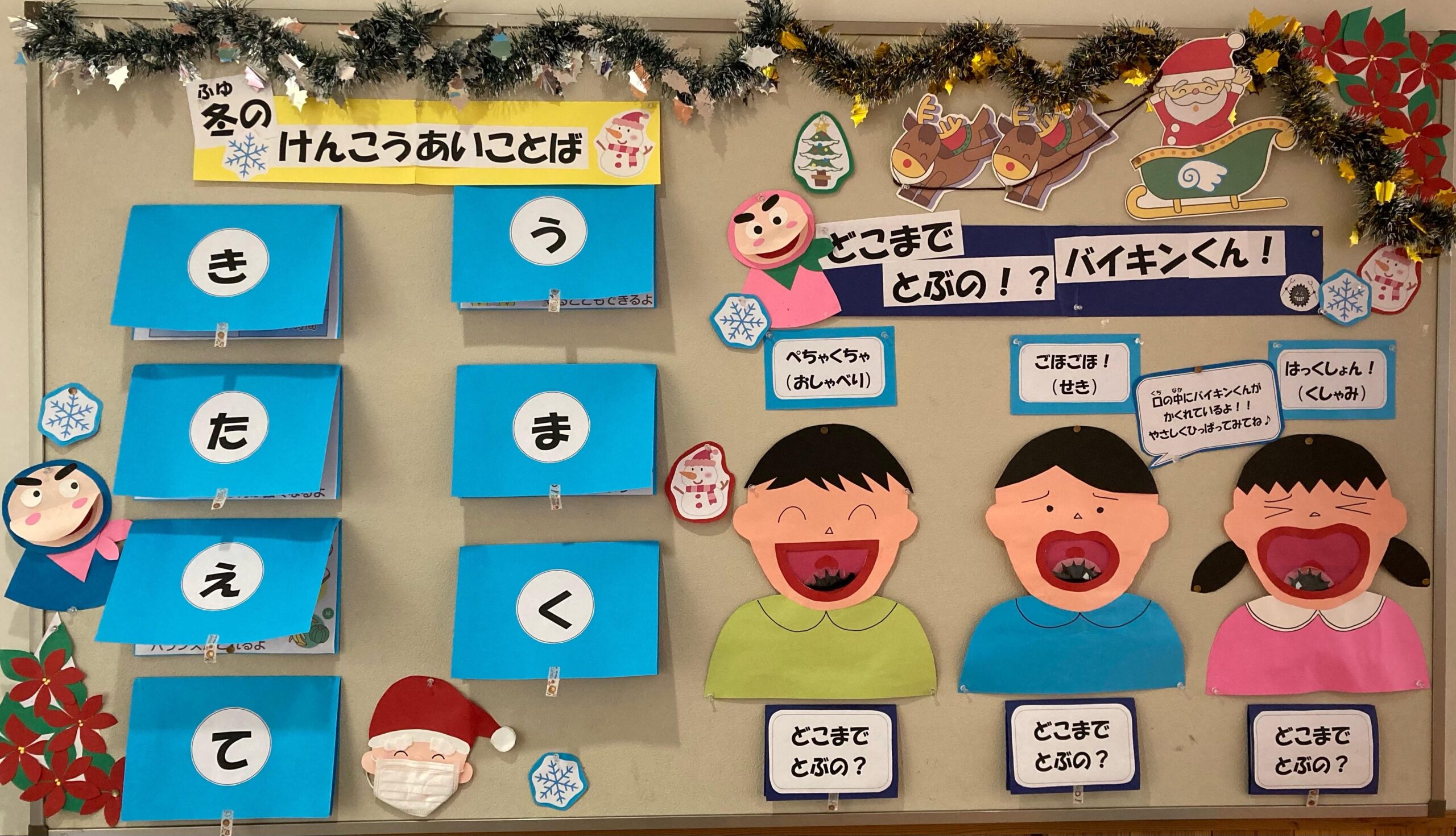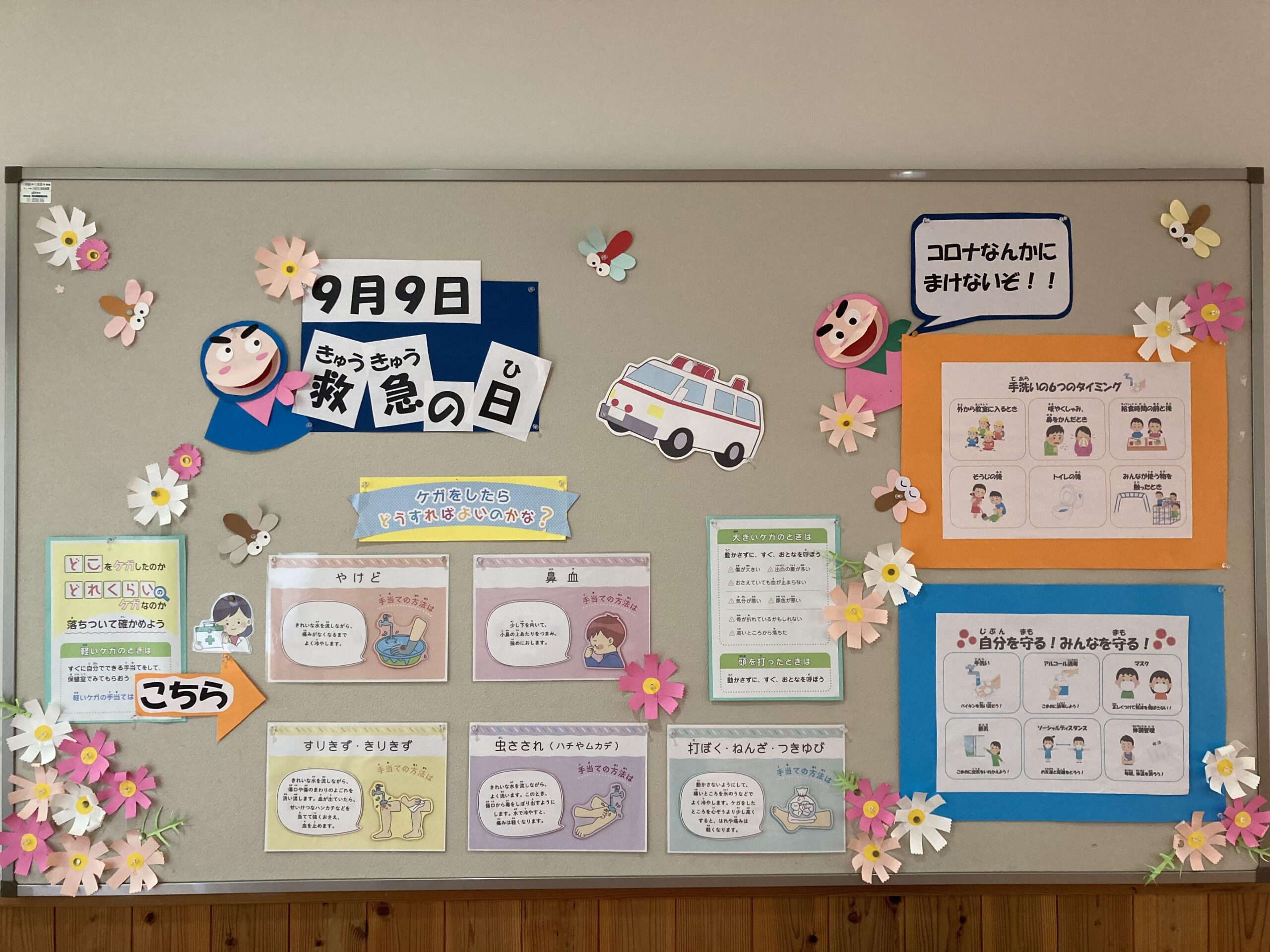 保健室は、けがをしたときはもちろん、なんとなくしんどいときや、話を聞いてもらいたいときなど、どんなときでも子どもたちの言うことを「そっか、そっか」と受け止めてもらったり治療をしてもらったりしてもらえる場所です。子どもたちの心も体も元気で学校生活を送ることができるように様々な工夫をしています。保健室前の壁面掲示もその一つで、大切な役割があると考えています。