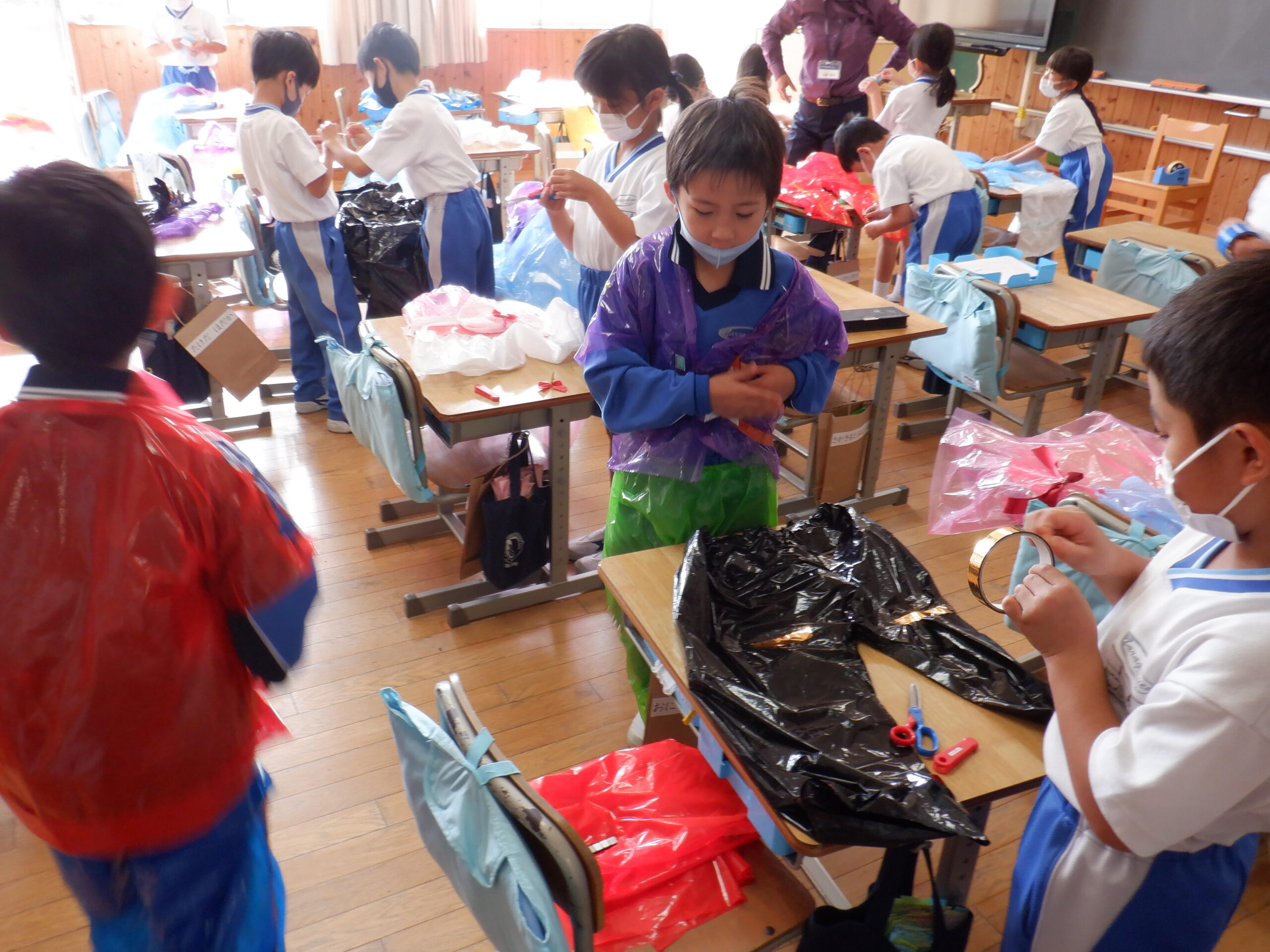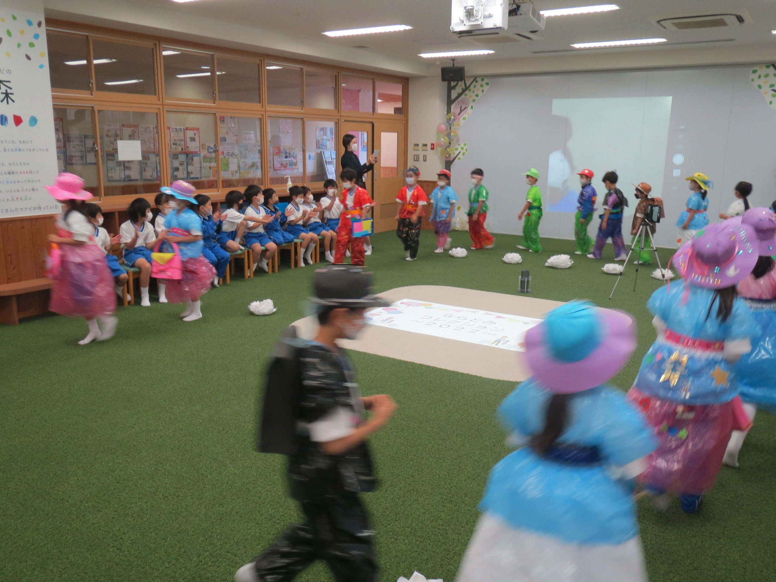 秋の葉や実を使っていろいろな物を作っていた子どもたちが、それらを服に飾りとして使い始めました。すてきな服ができそうだから、作ってみんなでファッションショーをしようということになり、カラー袋を用いていろいろなデザインの服ができあがりました。バッグや帽子も作って身につけた子どもたち。「マナビの森」でファッションショーの開催です!