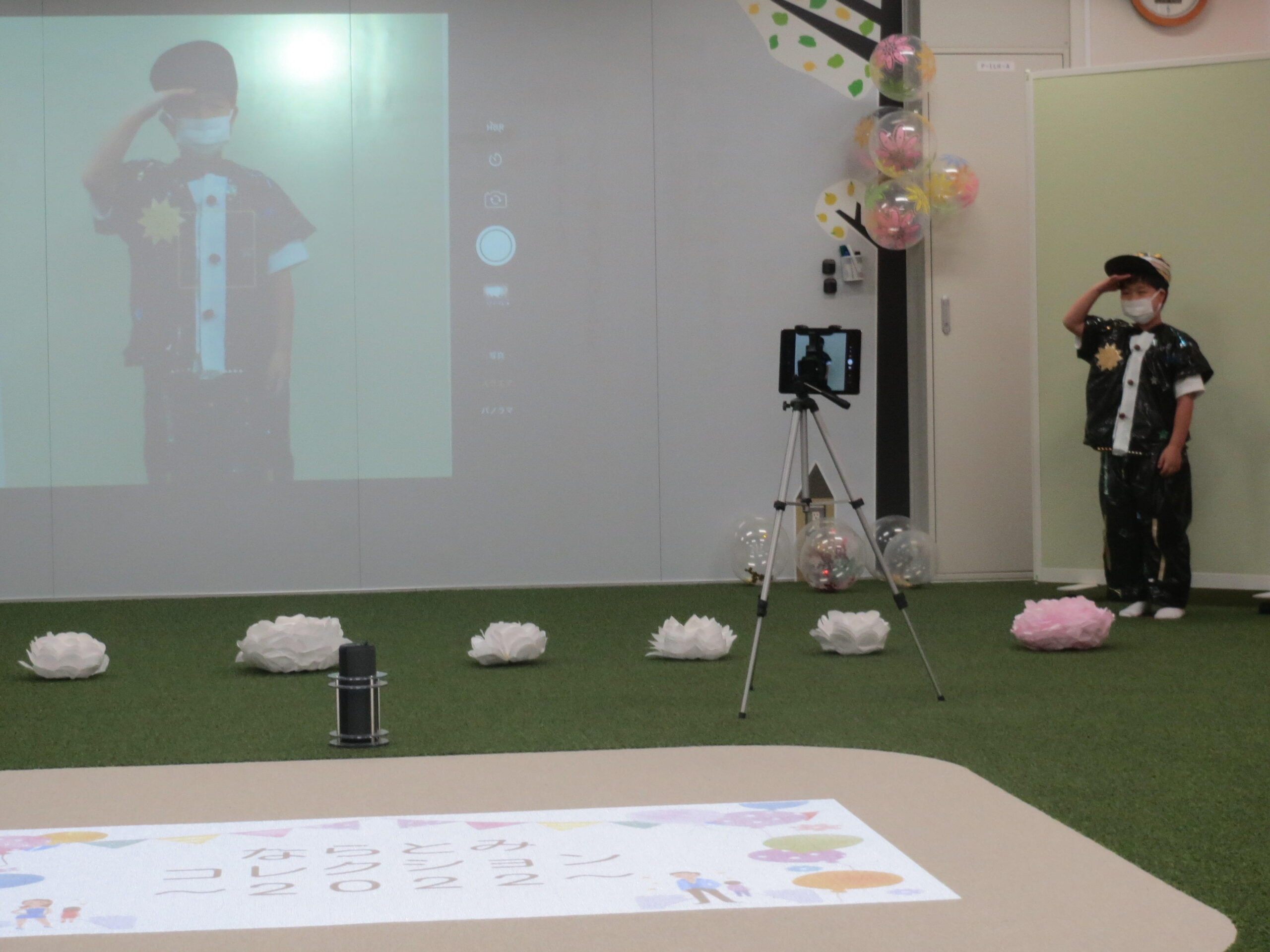 ランウェイを歩いて、タブレットの前でポーズ!ポーズは前面のホワイトボードの壁面にも映し出されます。そして、正面にやってきて一言コメントです。「服の黒とシールが気に入っています。かっこいいベルトができてうれしいです。」「運転手をイメージしました。アイテムで気に入っているのは帽子です。」などなど、とっても緊張しながらですが自分の言葉で説明してくれました。