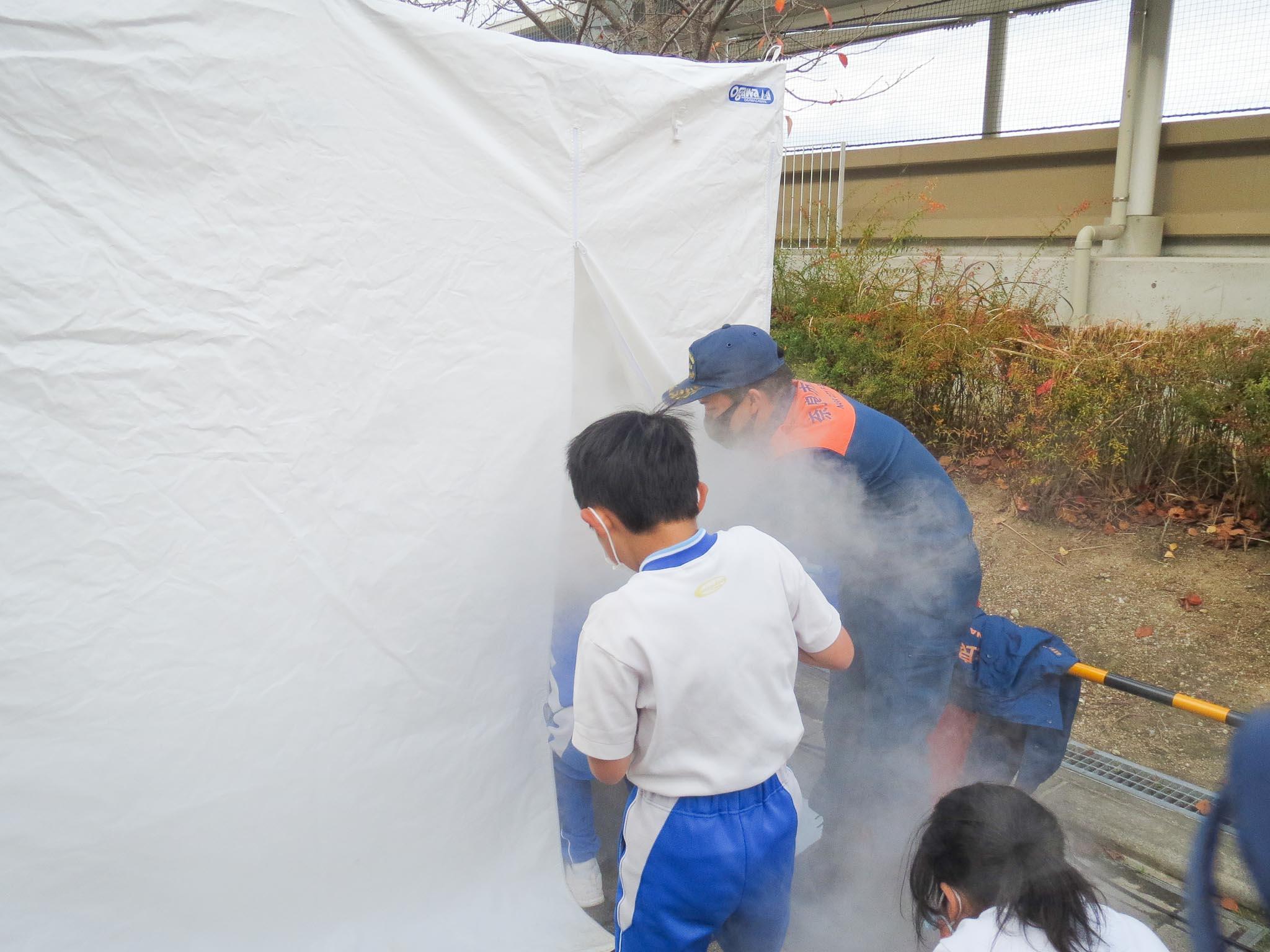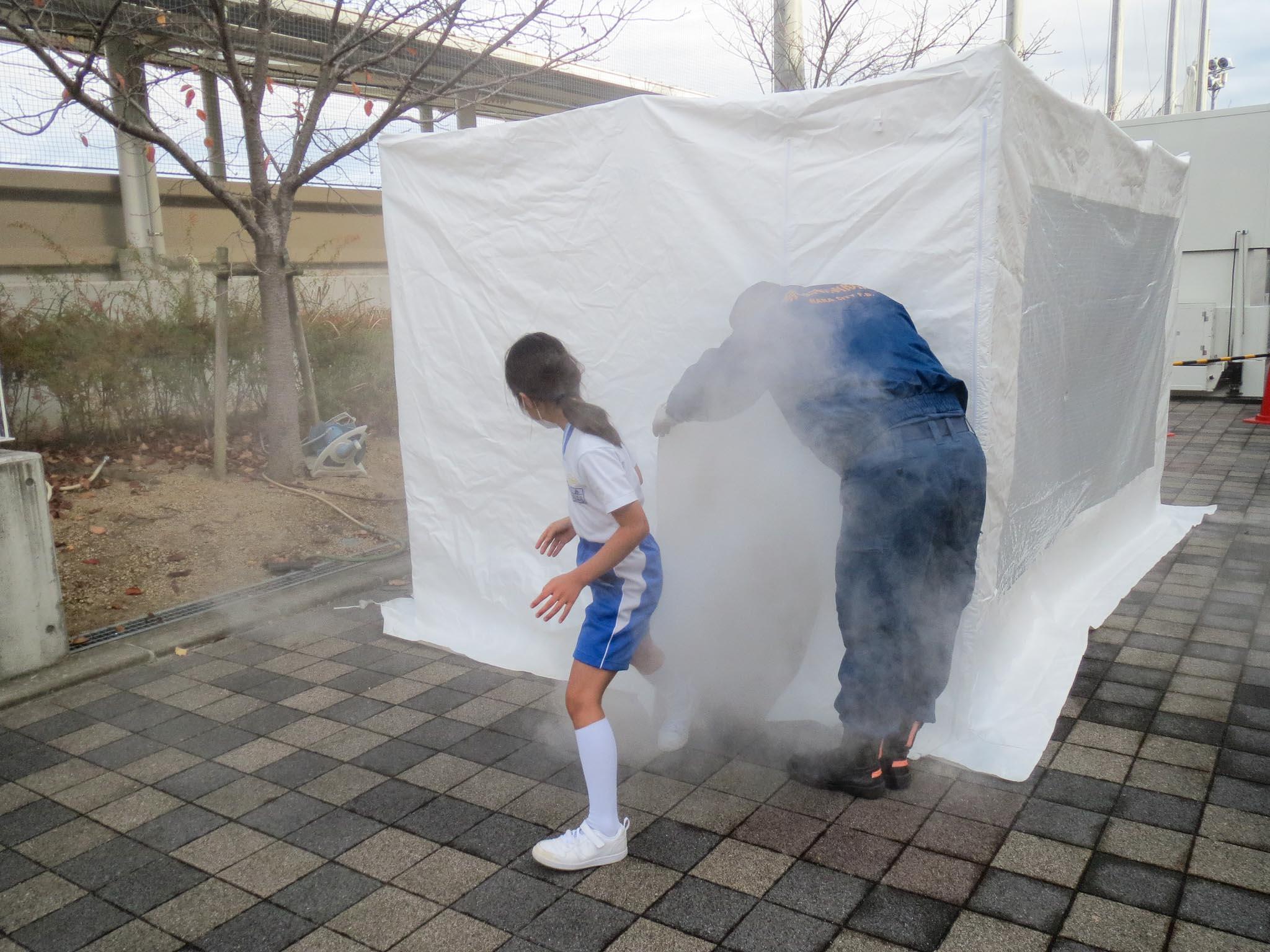 「じしん体験は、本当におこったらということを考えながらやりました。家でおこったときは、固定してあるものにしがみつくといいことも分かりました。けむり体験は、とてもくるしかったです。すったらダメというのも大変だと思いました。たくさんのことを学びました。もしもをそうていして、消防士さんはくんれんをしているということもおどろきました。消防士さんは、町の安全を支えてくれていることを知りました。」