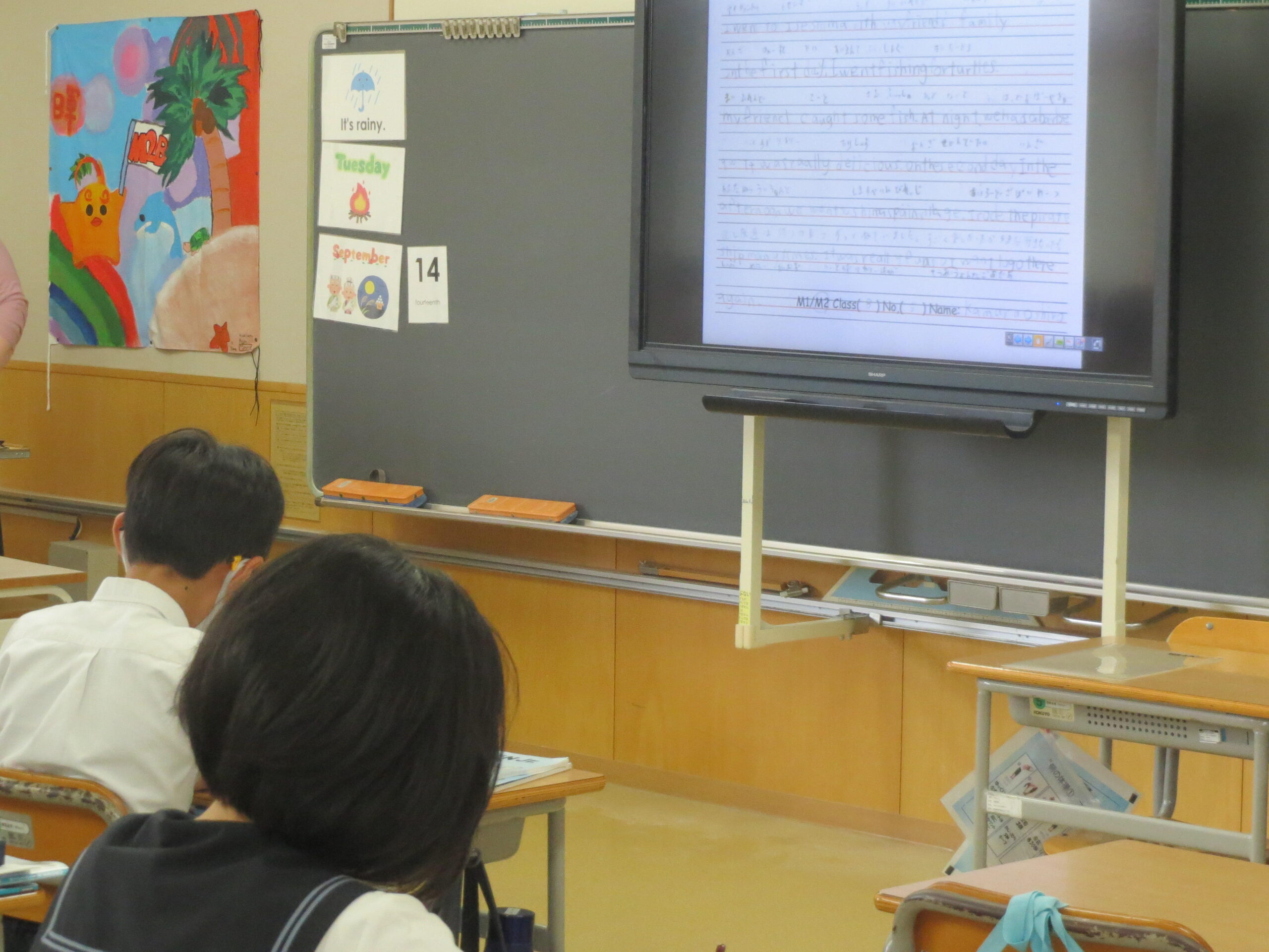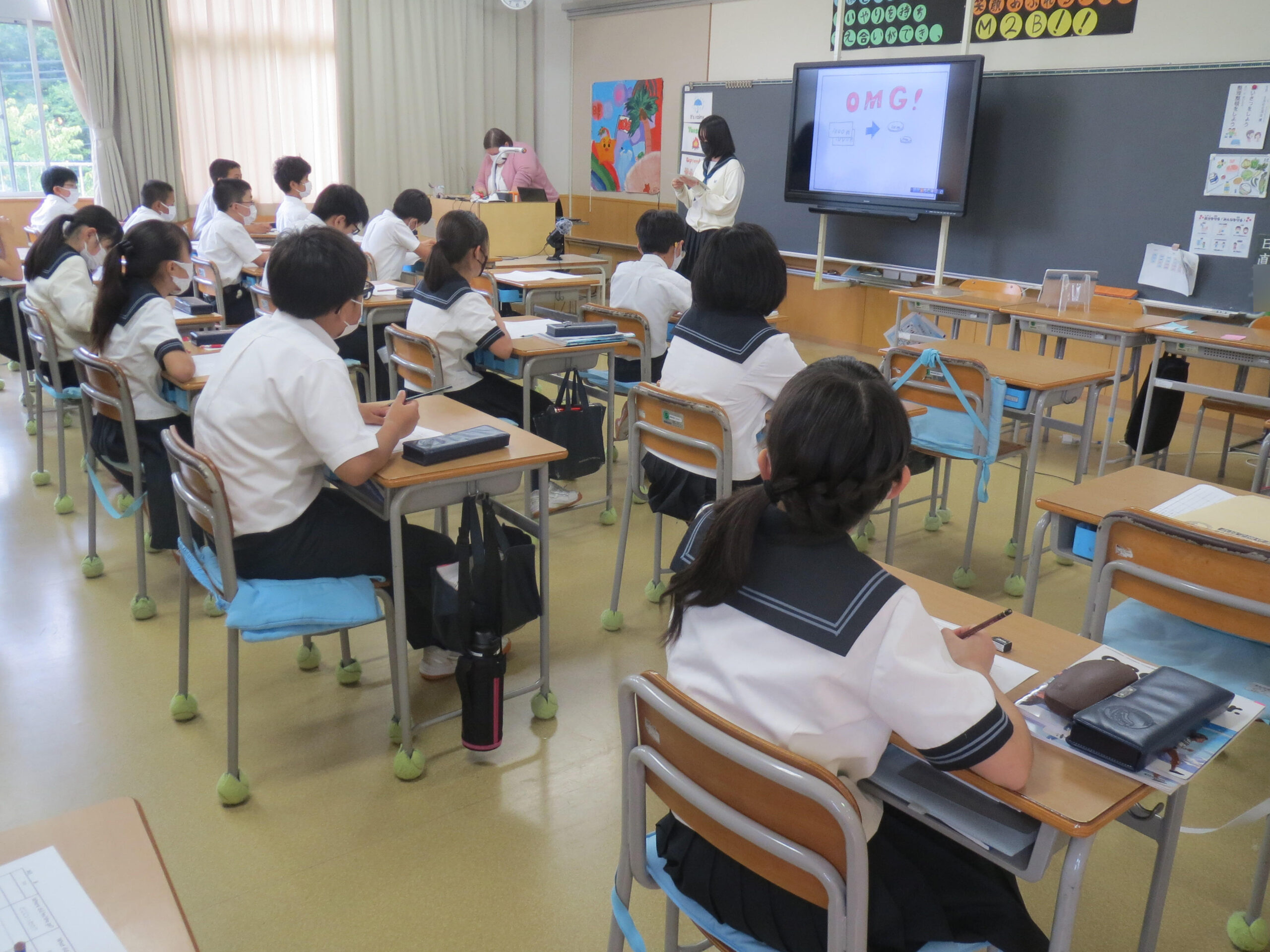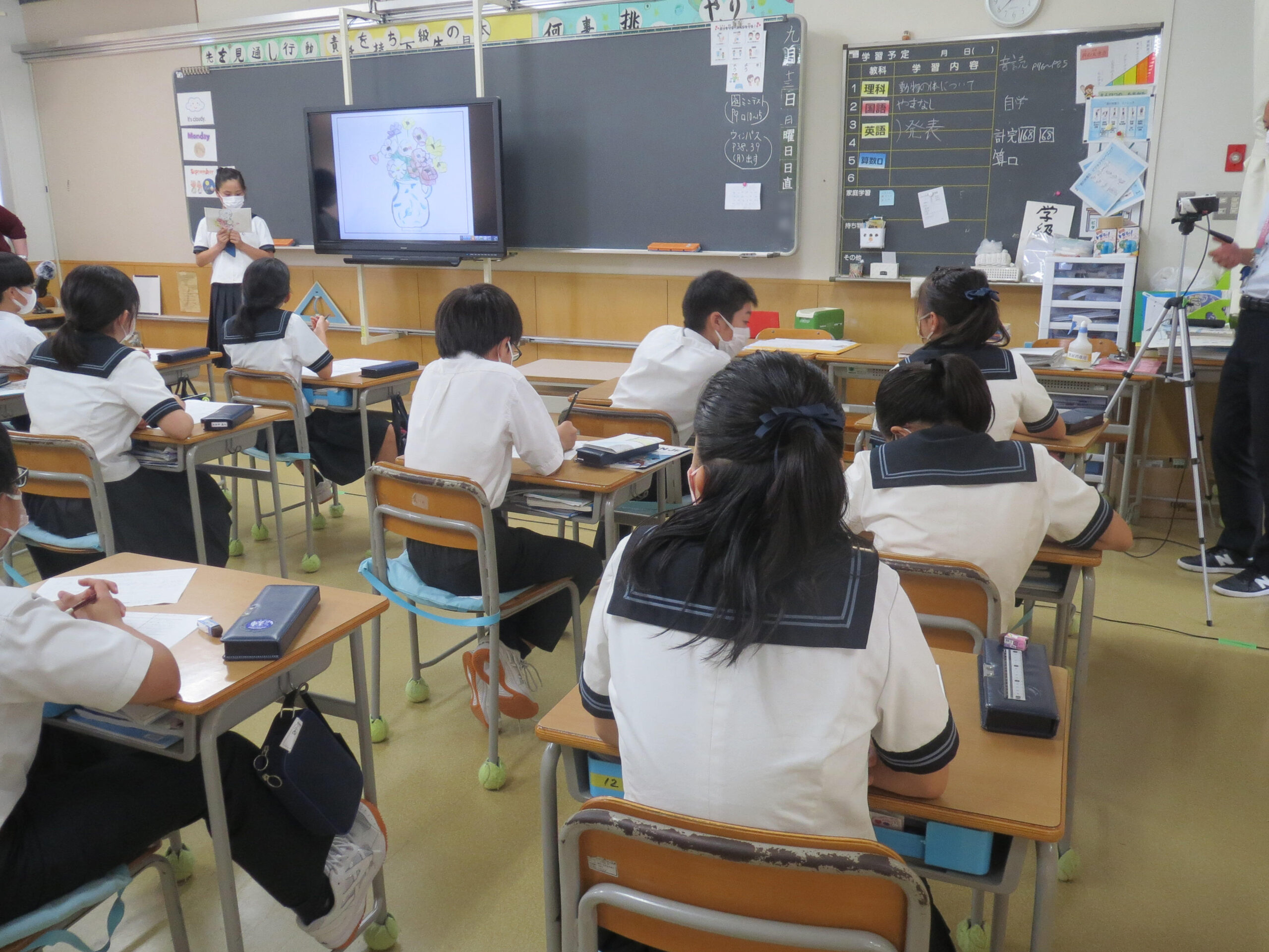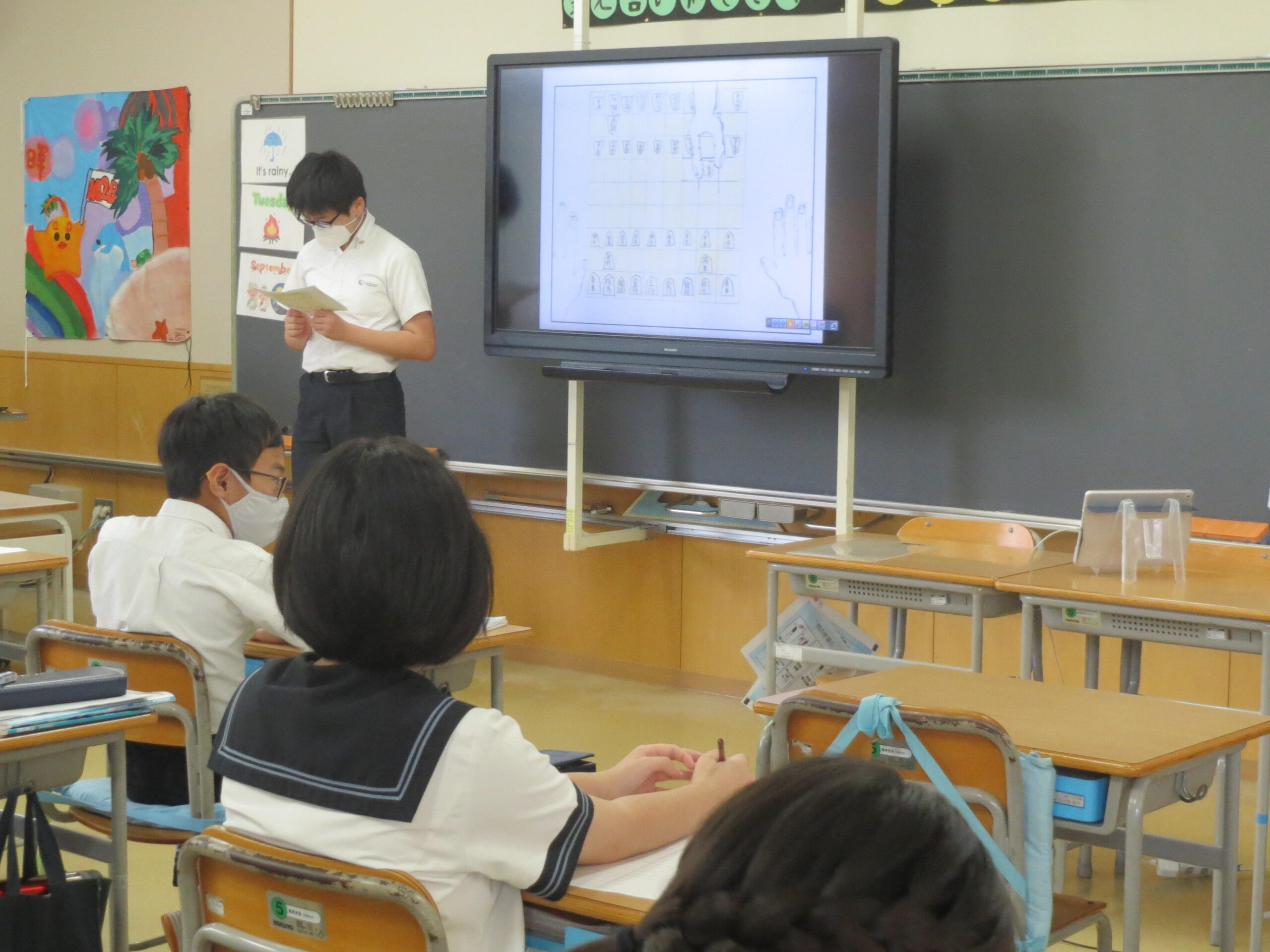 今回は、一人一人の夏休みの一コマを、オンライン参観で保護者の方々に英語で伝えました。