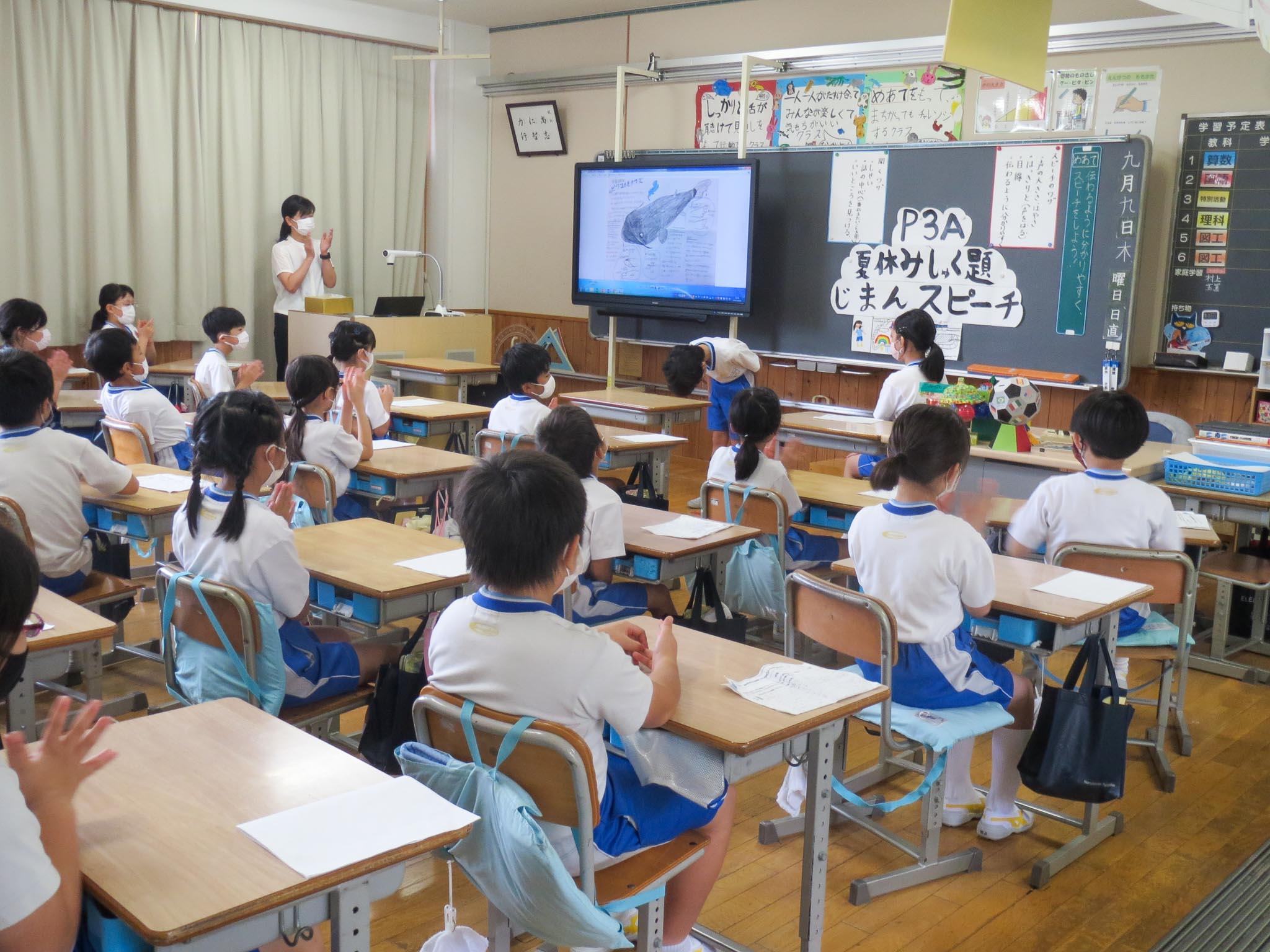 一日に一学年ずつ実施しているオンライン参観の3日目。P3(小学3年)生のオンライン参観日です。「夏休み宿題じまんスピーチ」と題して、子どもたちの「じまん」の数々をクラスのみんなに、そして保護者の皆様に聞いていただきました。