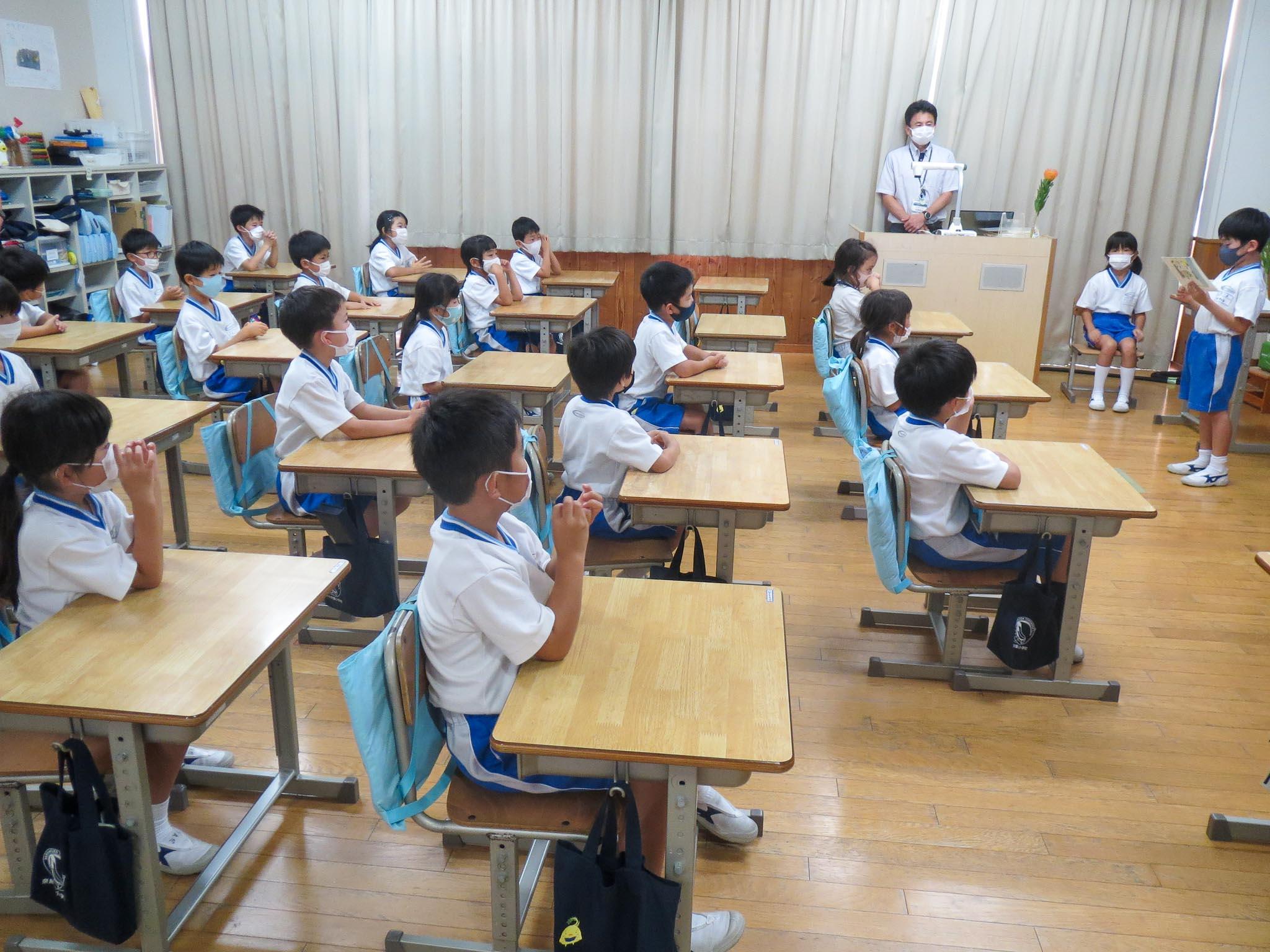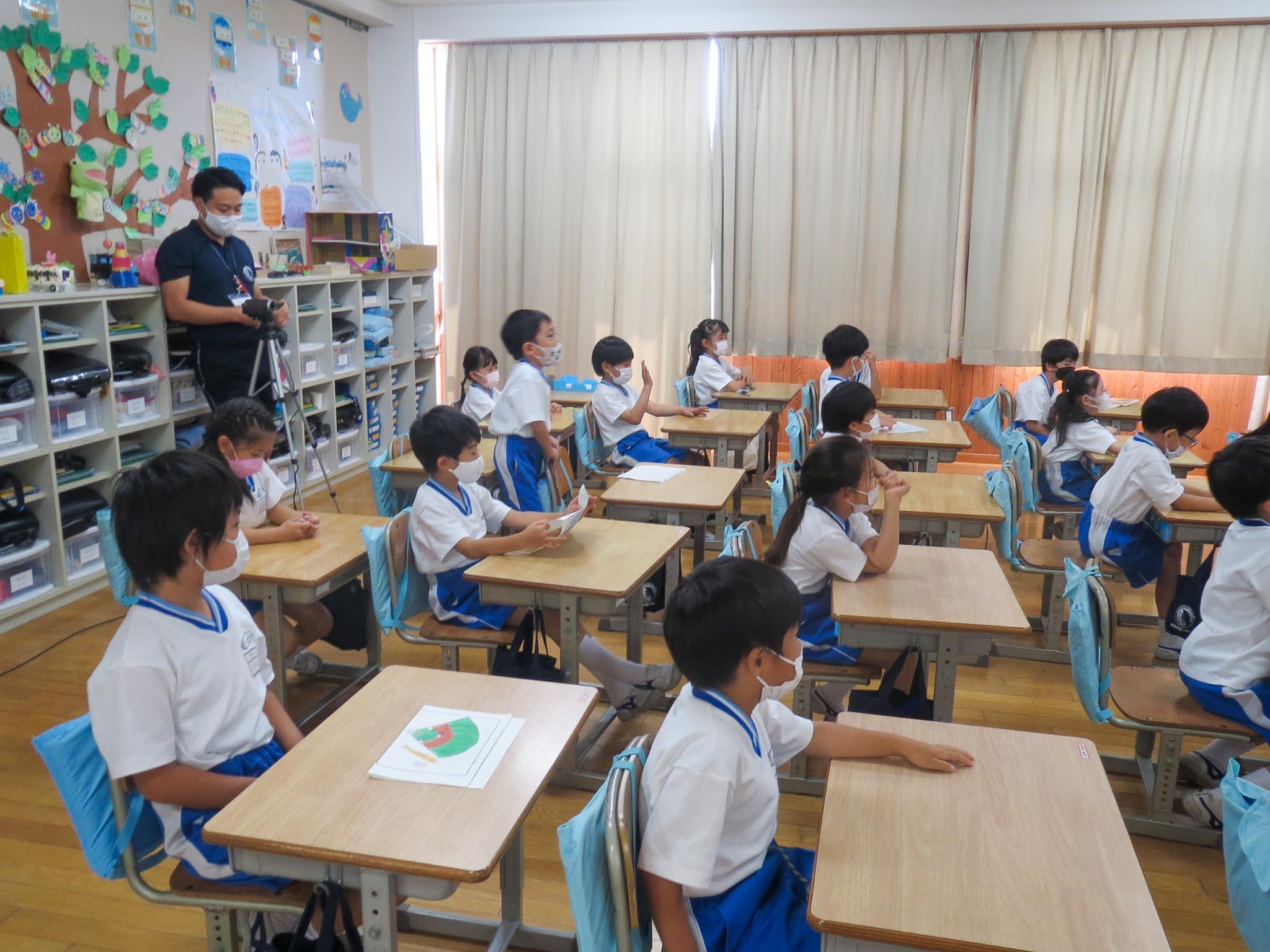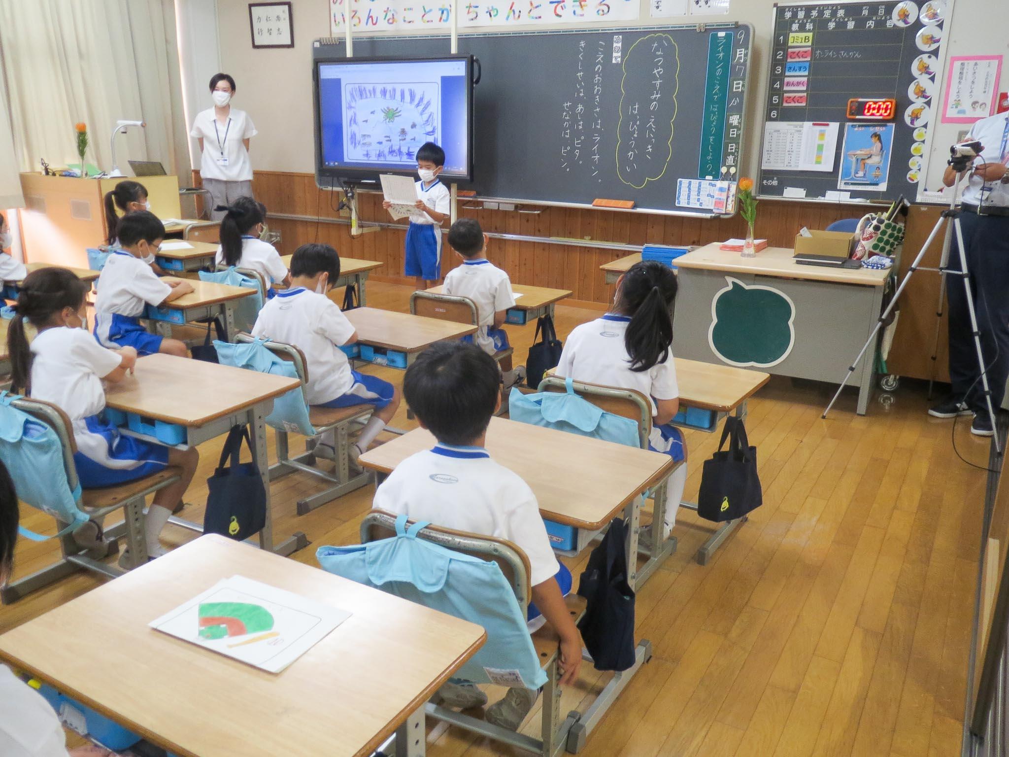 まず、P1(小学1年)生のオンライン参観。授業は、「なつやすみのえにっきはっぴょうかい」ということで、自分が選んだ絵日記の一日を大型ビジョンに映しながら説明する子どもたちです。説明が終わった後には、日記の内容についてのクイズもして、みんなで聞いたり発表したりして楽しむ様子を観ていただきました。普段の参観日もそうなのですが、今日も緊張しながらカメラの前に立つ子どもたちでした。