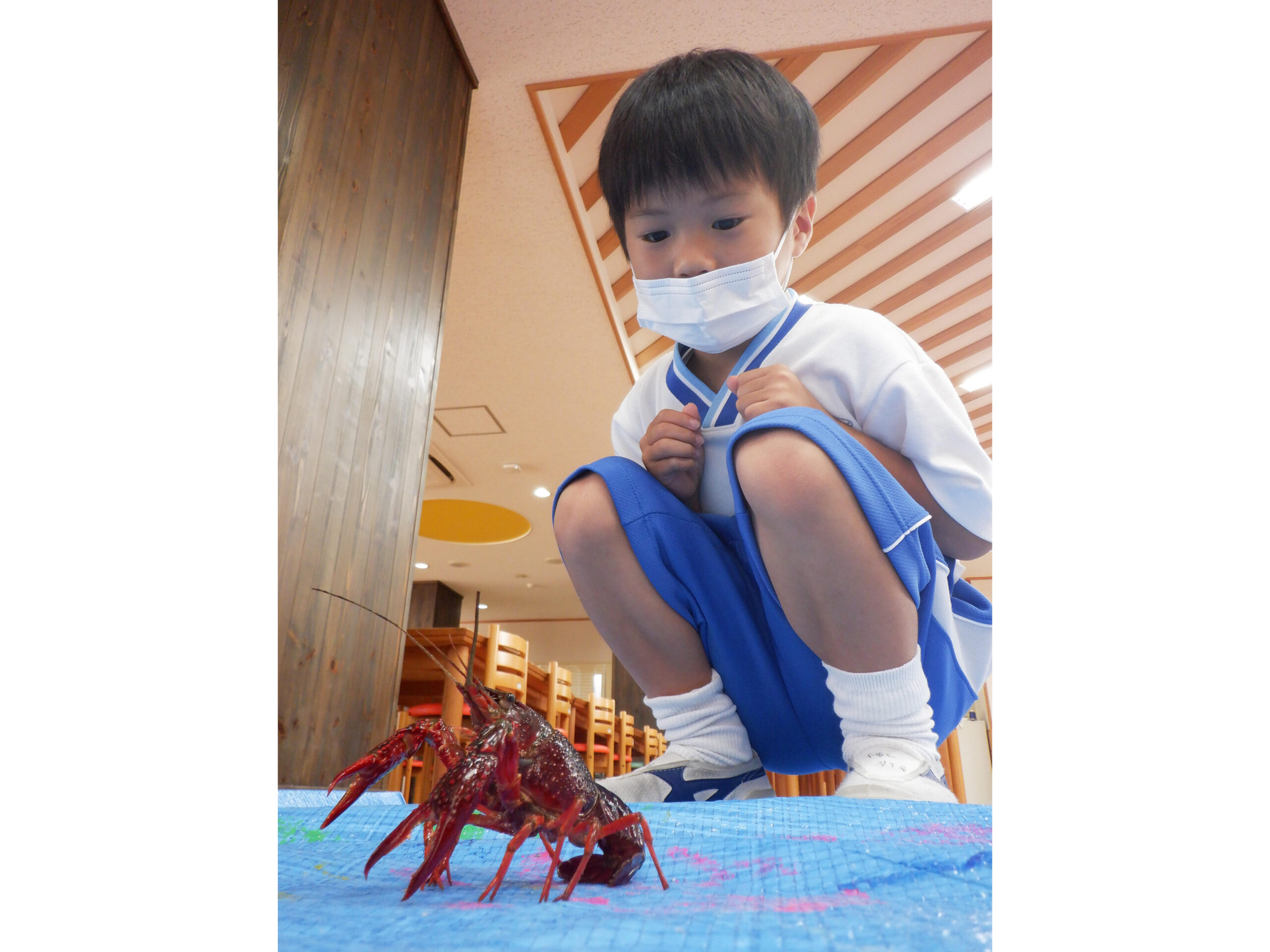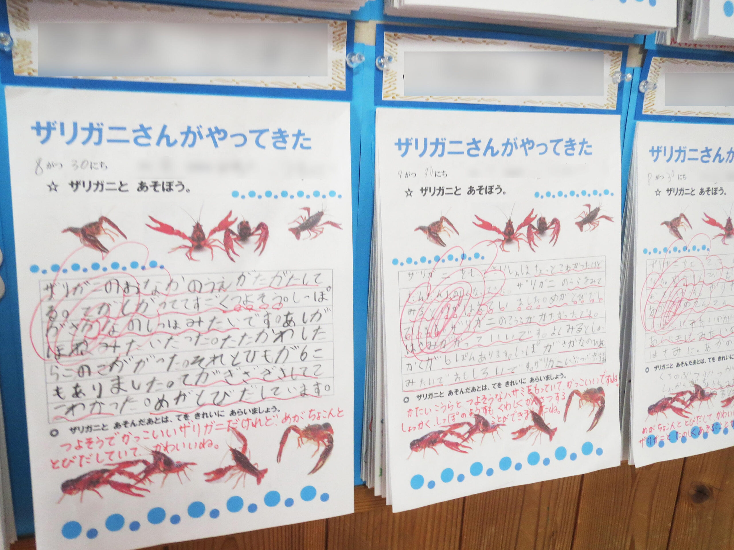 「ザリガニをもってさいしょはちょっとこわかったけどだんだんたのしくなってきました。ザリガニのうらをみてみるとけがはえていました。めがとびだしています。ザリガニのこうらがかたかったです。はさみがかっこいいです。よくみるとしょっかくが6ぽんあります。しっぽがさかなのひれみたいでおもしろいです。ザリガニにぶつぶつがついています」