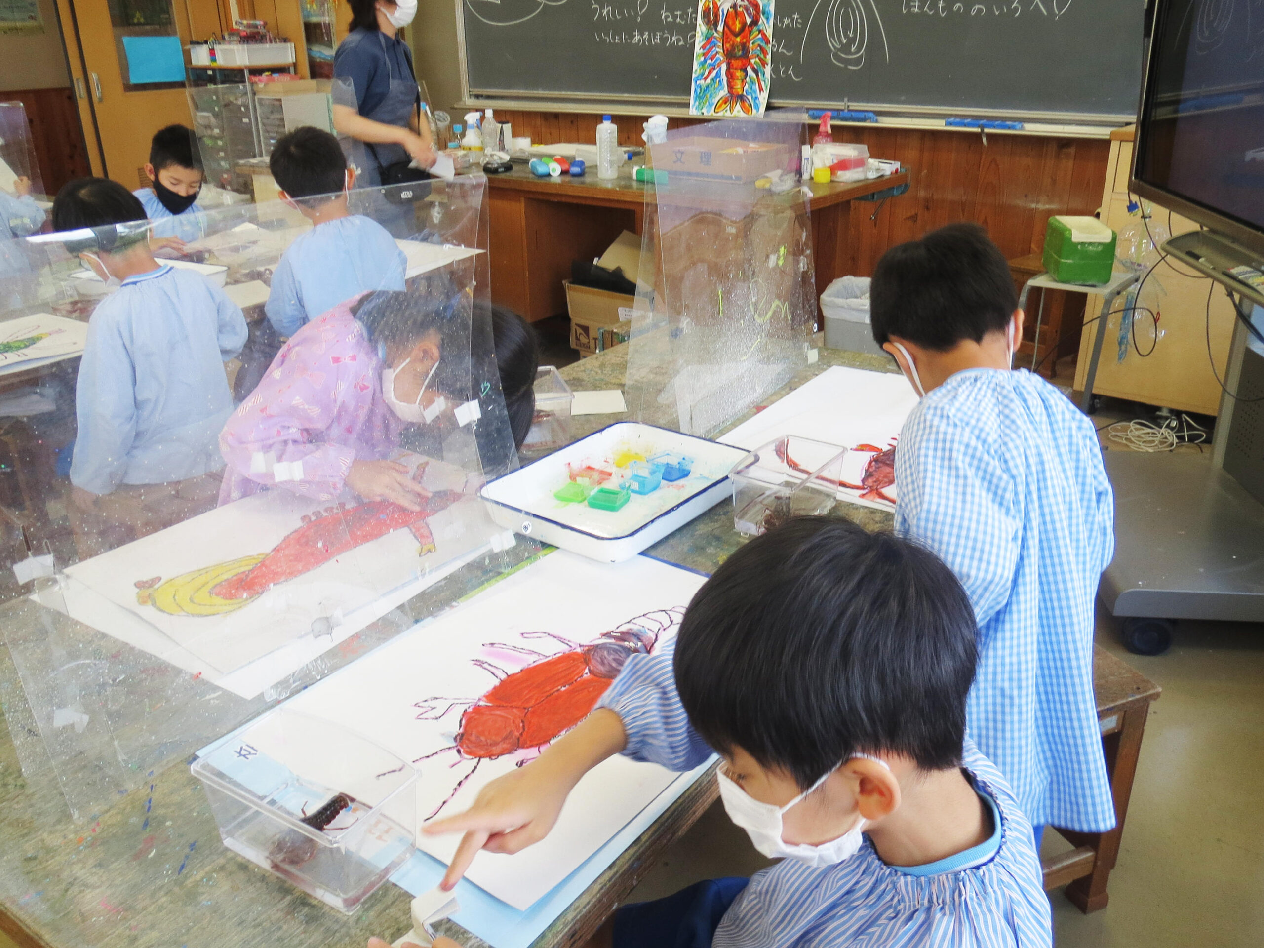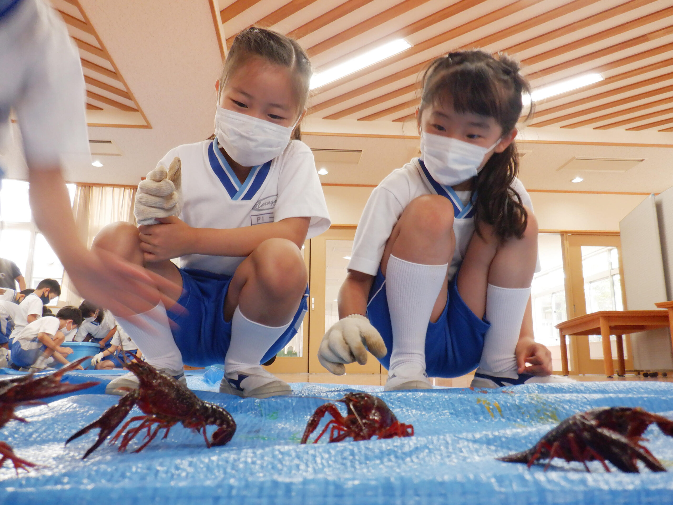 P1(小学1年)生が、生活の勉強でザリガニと遊びました。今までつかんだことがなかった子も、最初は軍手をはめて、慣れてくると素手でつかめるようになってきます。うーんと遊んだ後は、自分のザリガニを決めて虫かごに。虫かごを横に置きながら、一緒に遊んだことを文章に書いたり、図工の時間に絵で描いたりしていきます。