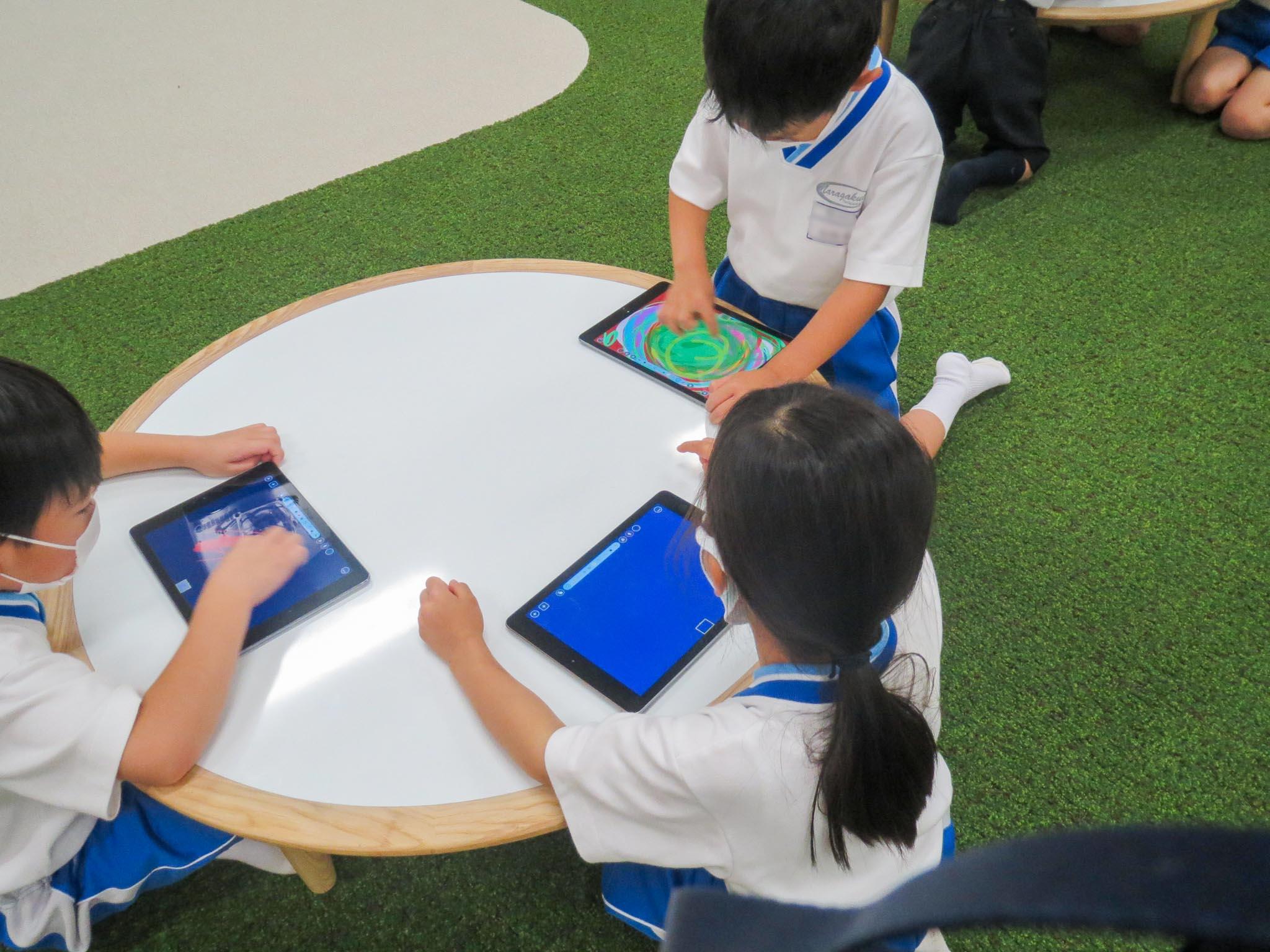 子どもたちは、ロイロノートのお絵かき機能を使って、様々に描き始めています。「うさぎとかかえるとかを描くのではなく、色や形でいろんなことを試してみてね。おもしろいことを見つけられるかな」と教員から言われた子どもたちは、一人一人が決まった形にとらわれることなく、本当に自由にタブレットで描いていきます。描きなぐる、ともいえるくらい一生懸命です。