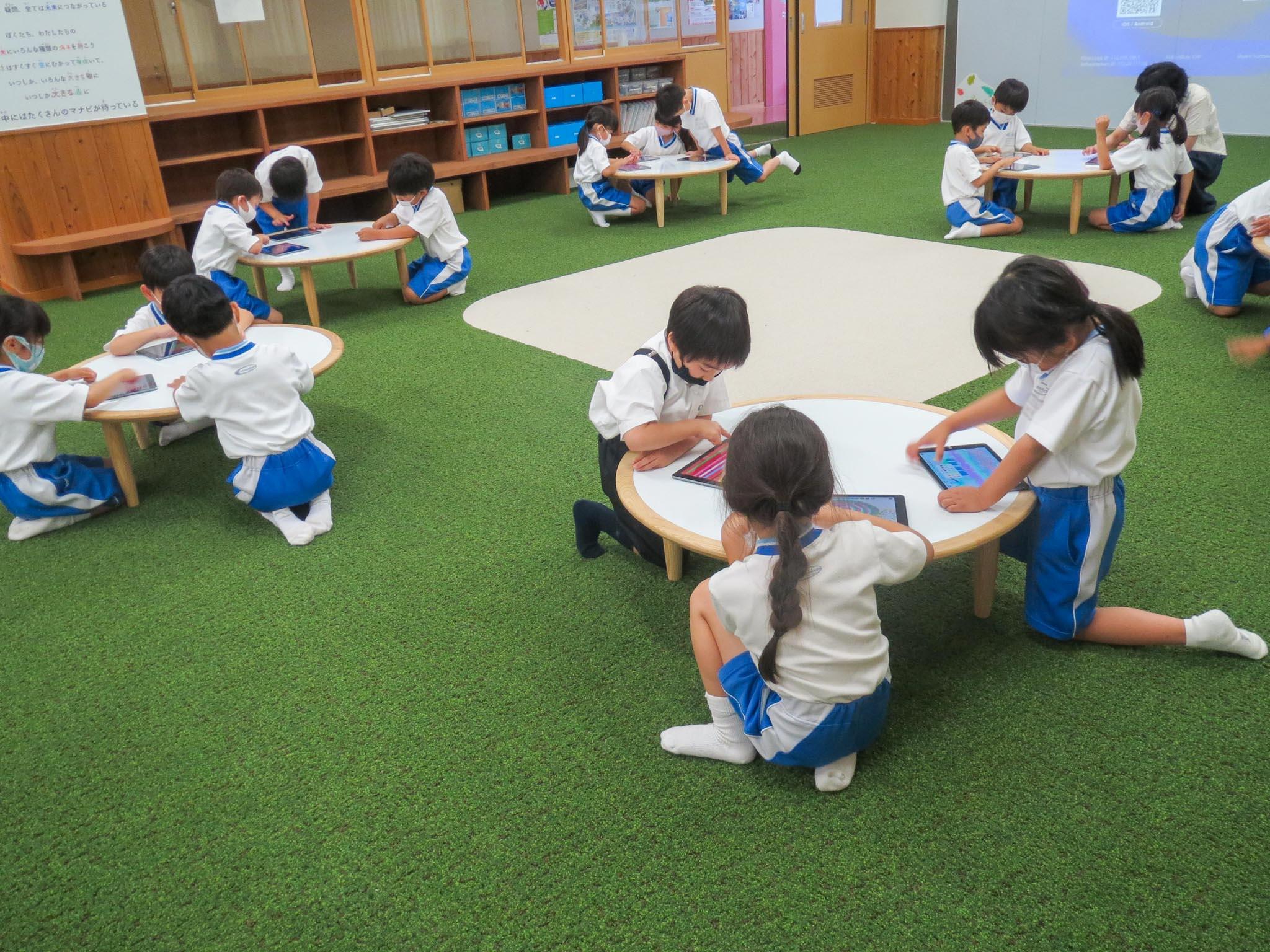 「マナビの森」で1年生が図工の「いろ・かたち・いいかんじ!」の勉強をしていました。めあては、「ロイロノートの おえかきぎのうをつかって、いろやかたちのすてきを あじわおう!」です。