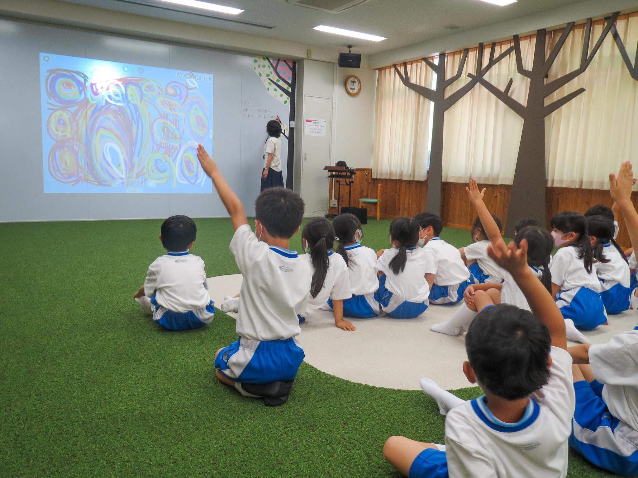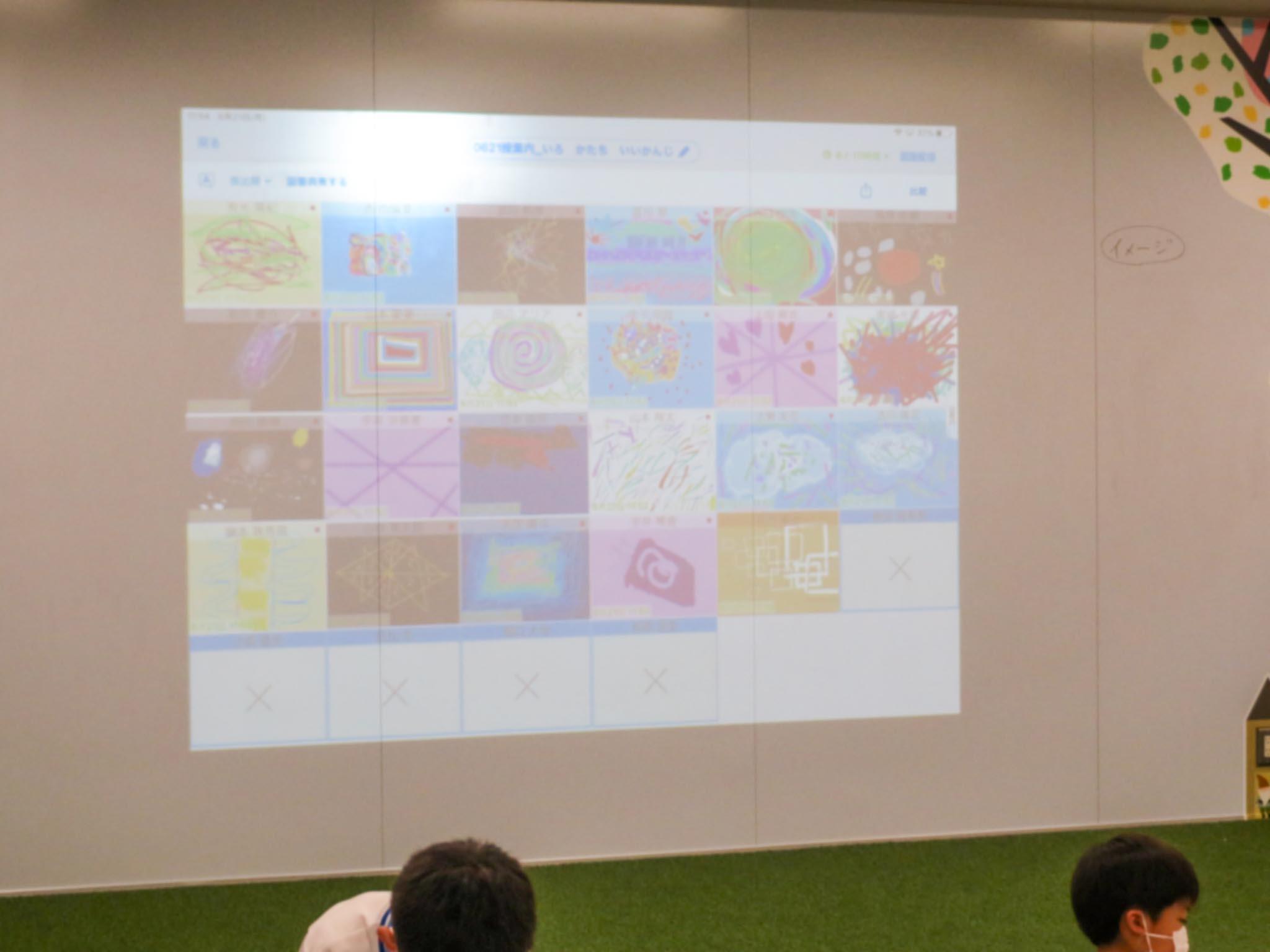 描き終えてみんなの作品が提出箱に提出されると、今度はそれを見ながら、鑑賞の時間です。どんなことがイメージできるかな、どんな色が使ってあるかな、どんな形がみつかったかな、どんどん意見が出てきます。