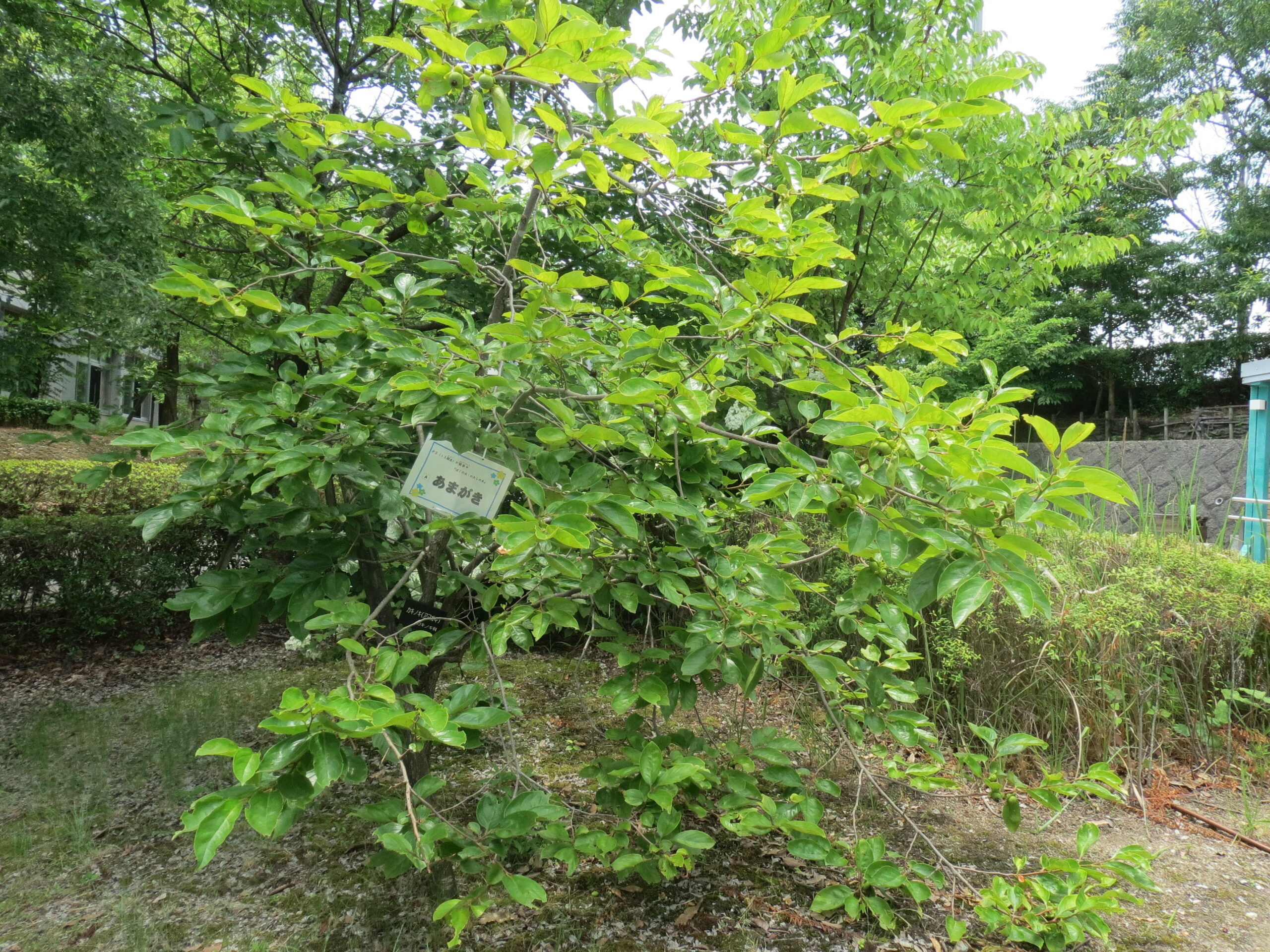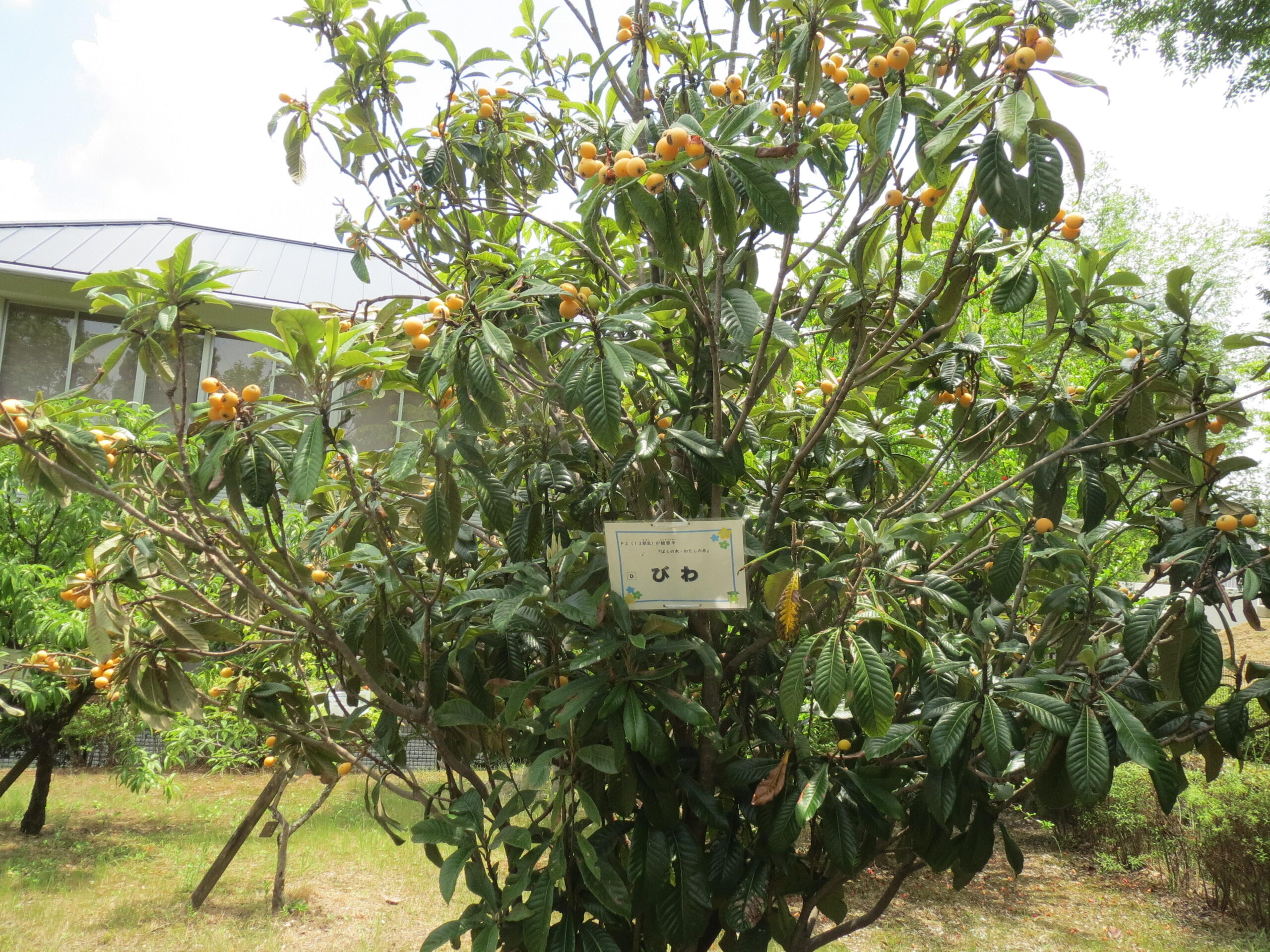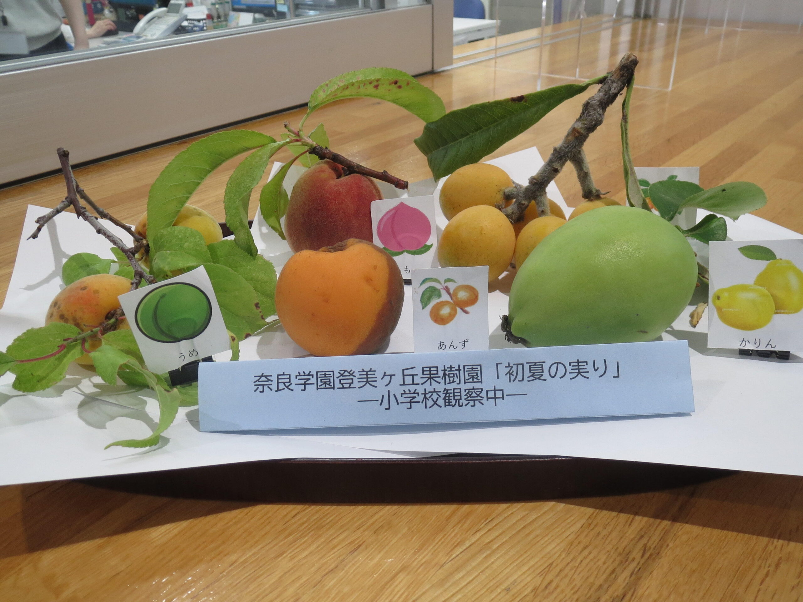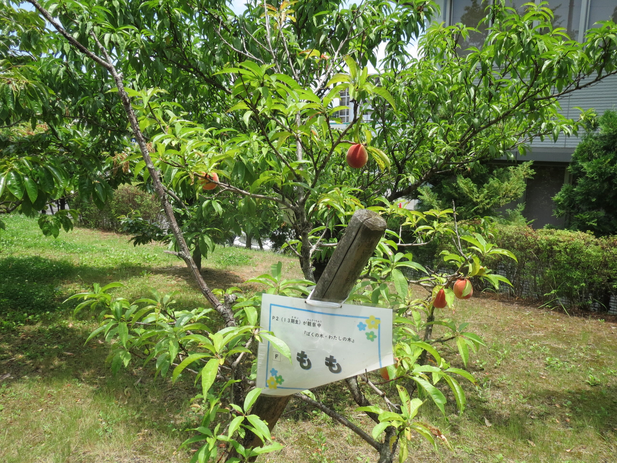 初夏の季節、たくさんの実がなってきました! ウメ、アンズ、モモ、スモモ、カリン、ビワ…。秋の実りが楽しみな木もあります。2年生が生活科の勉強で「観察中」の札をかけている木も見つけました。
