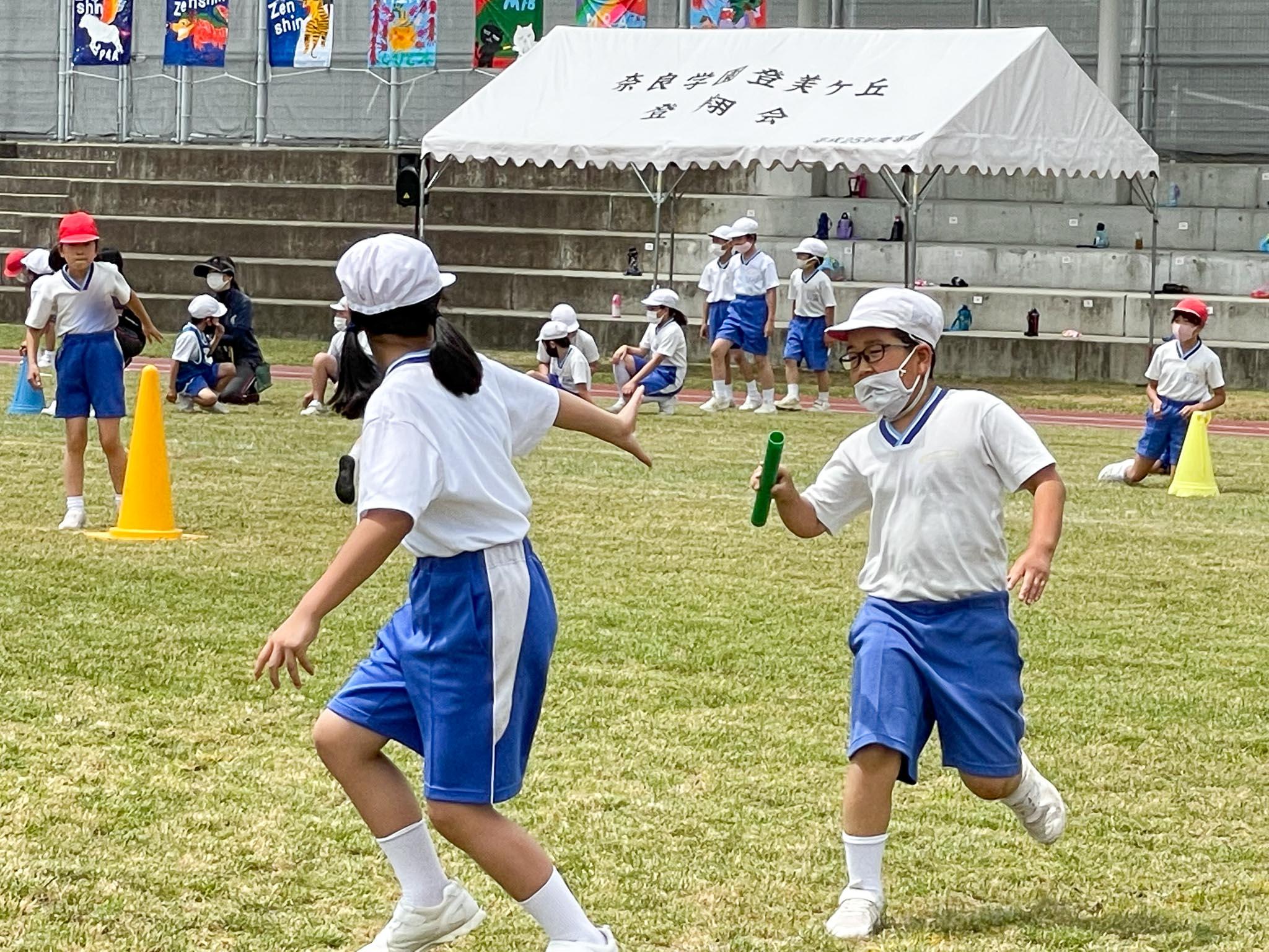 P1(小1)生にとっては初めての、M2(小6)生にとっては最後のなとみんピック。1時間目はP2(小2)生とP4(小4)生が、2時間目はP3(小3)生とM1(小5)生が、3時間目はP1生とM2生が一緒に競技を行いました。徒競走やハードル走、折り返しリレーや障害物リレーや紅白対抗リレーなど、日頃の体育学習の成果を確かめる場です。そして、いよいよ4時間目は全員がそろってクラス対抗リレーと奈良登美弾(全校ダンス)。