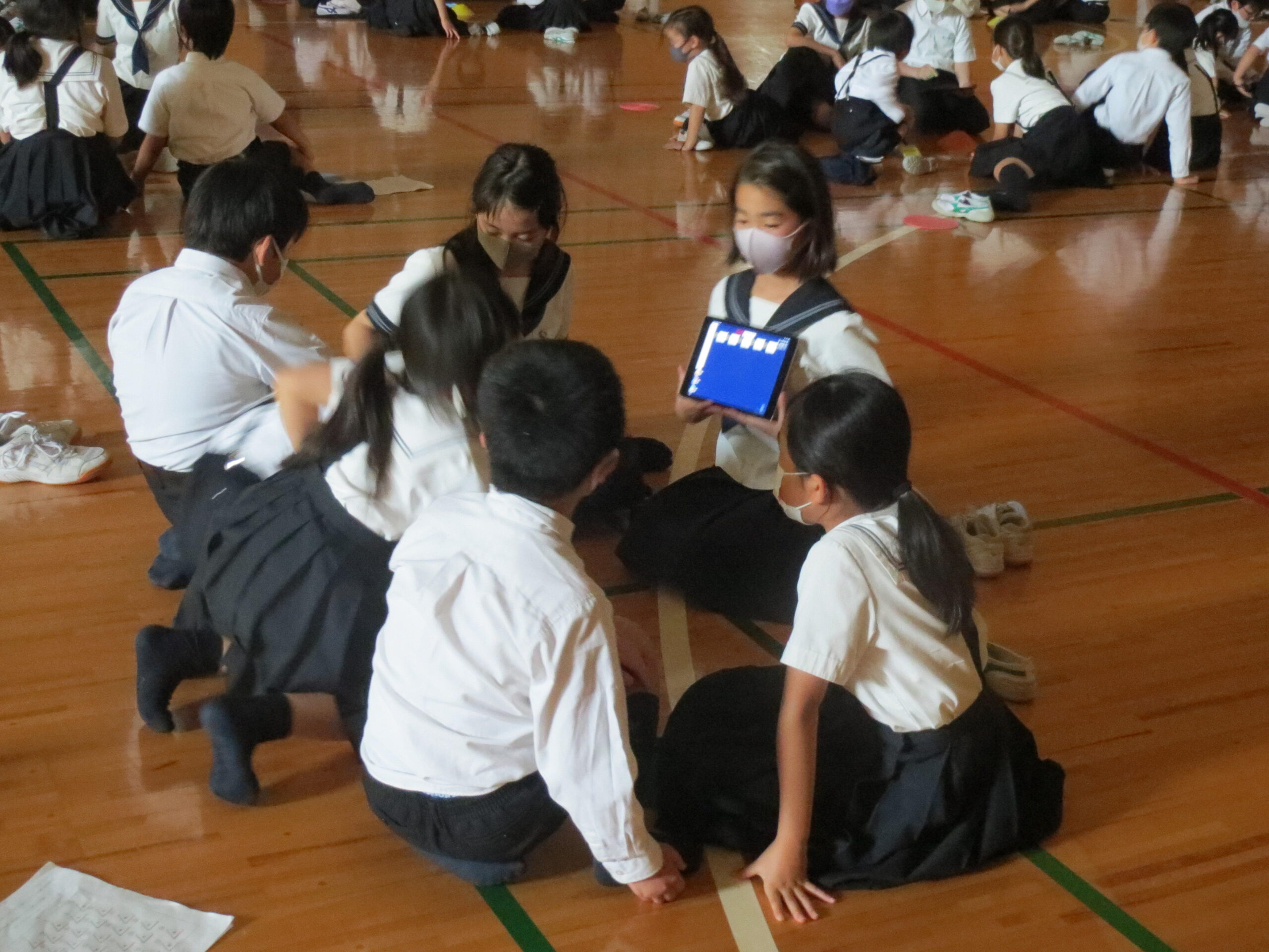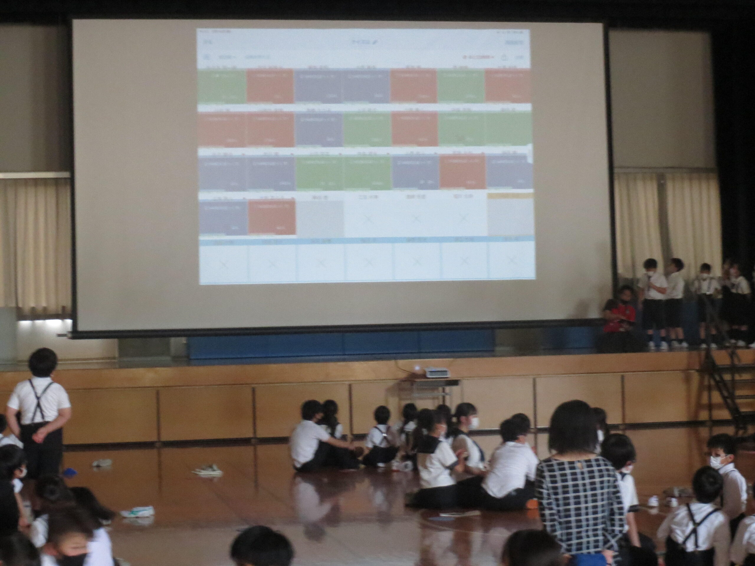 その後に、P4生が進めるクイズです。グループに1台のipadを持ち、ロイロノートを使いながら、色で答えるグループの回答を送信。ステージの画面に全グループの回答が出てきます。「P棟昇降口の靴箱の数はいくつですか?」ん?教員も分からないな、という顔で、グループの回答も案の定いろいろな色です。「答えは543。青が正解です」という具合に進んでいきます。「○◯先生が小さいときに習っていた習い事は何でしょう?」とか「◯◯先生の好きなキャラクターは何でしょう?」など楽しい質問がいっぱいでした。