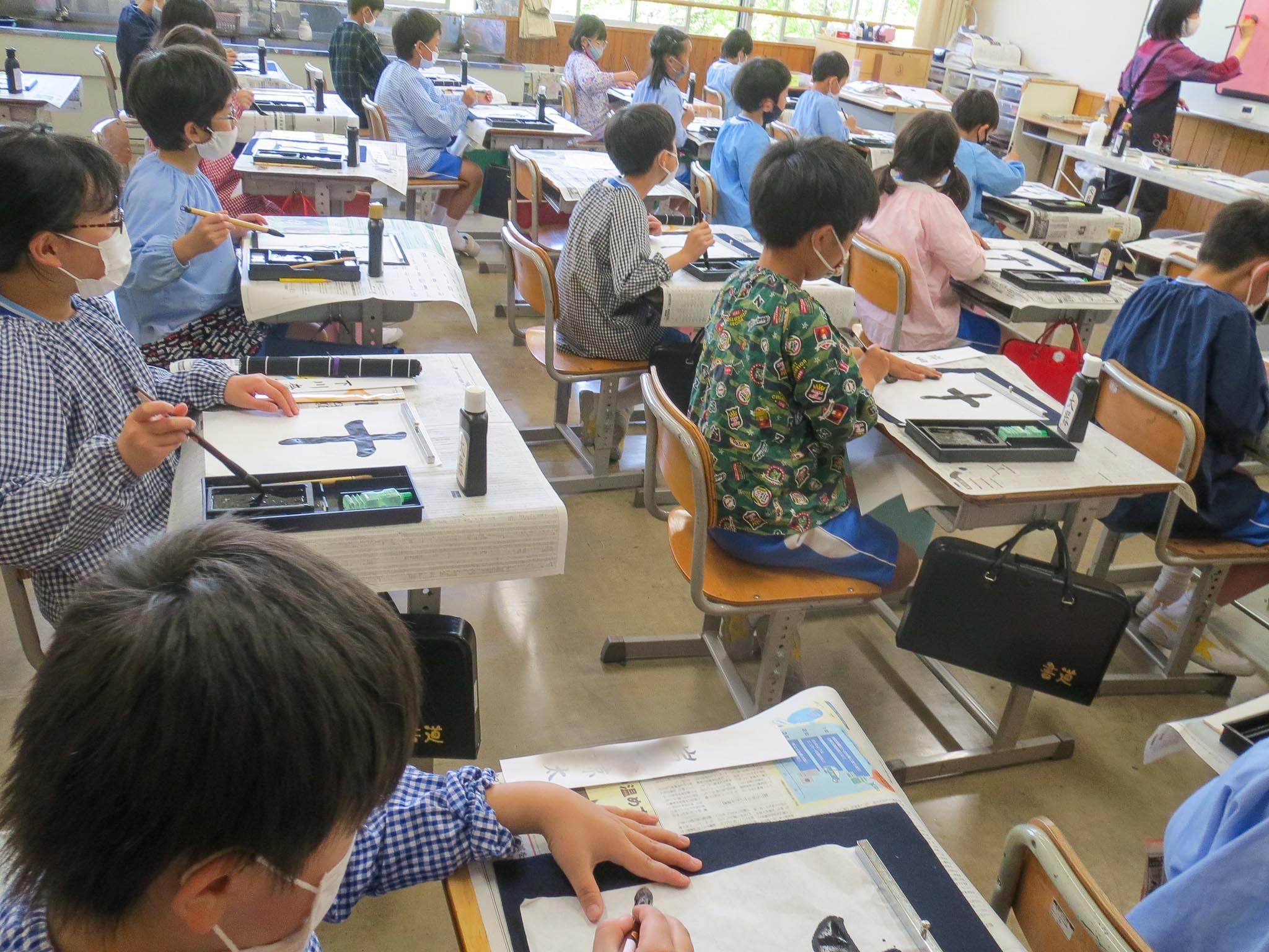 今日、はじめて半紙に筆を使って墨で字を書く3年生の子どもたちです。