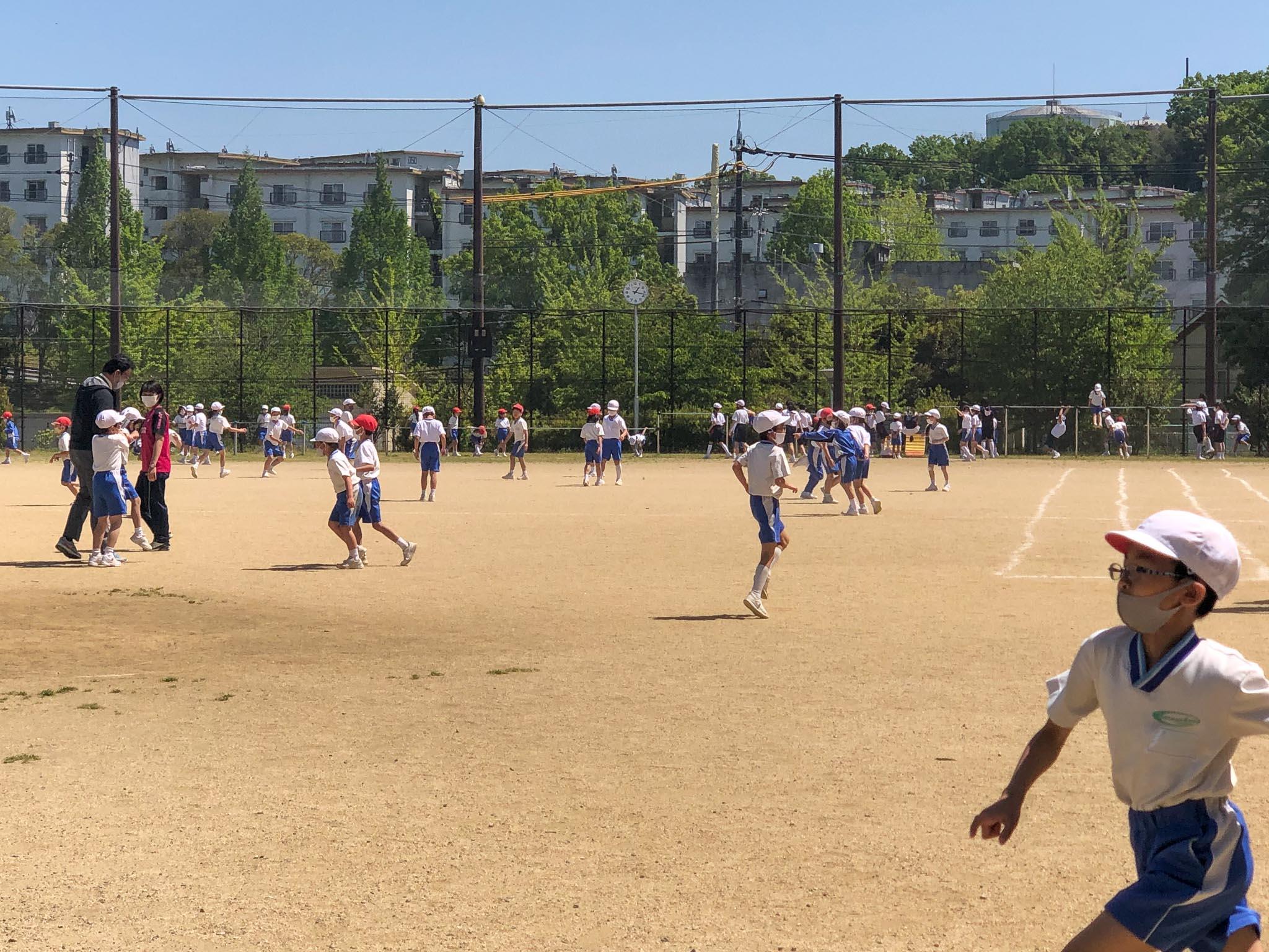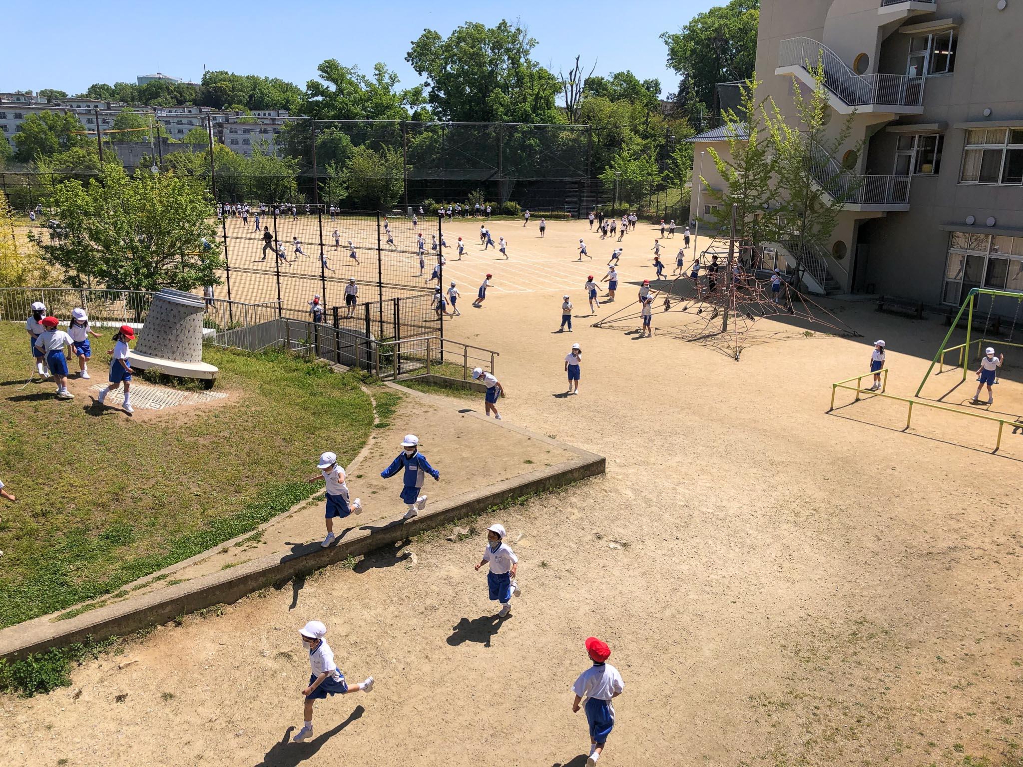 コロナ禍の学校の昼休み。指導を徹底した上で、マスクをして元気に遊ぶ子どもたちです。各学年の教員も、学年フロアに残る教員と運動場に出る教員とで分担し、一緒に子どもたちの遊びの中に入っています。子どもたちと教員の距離感が近いのは、このような時間が当たり前に持てていることが大きな理由でもあります。