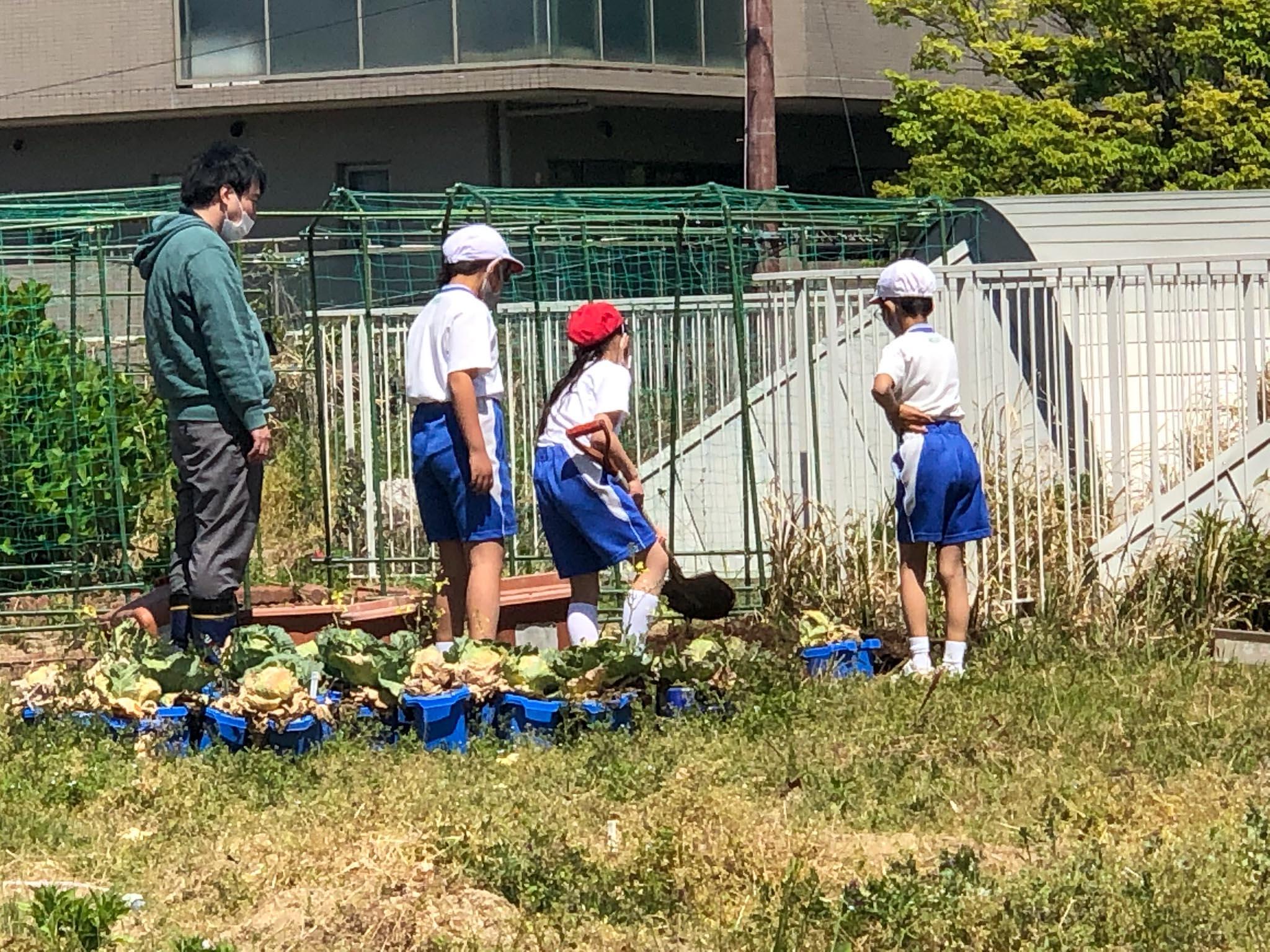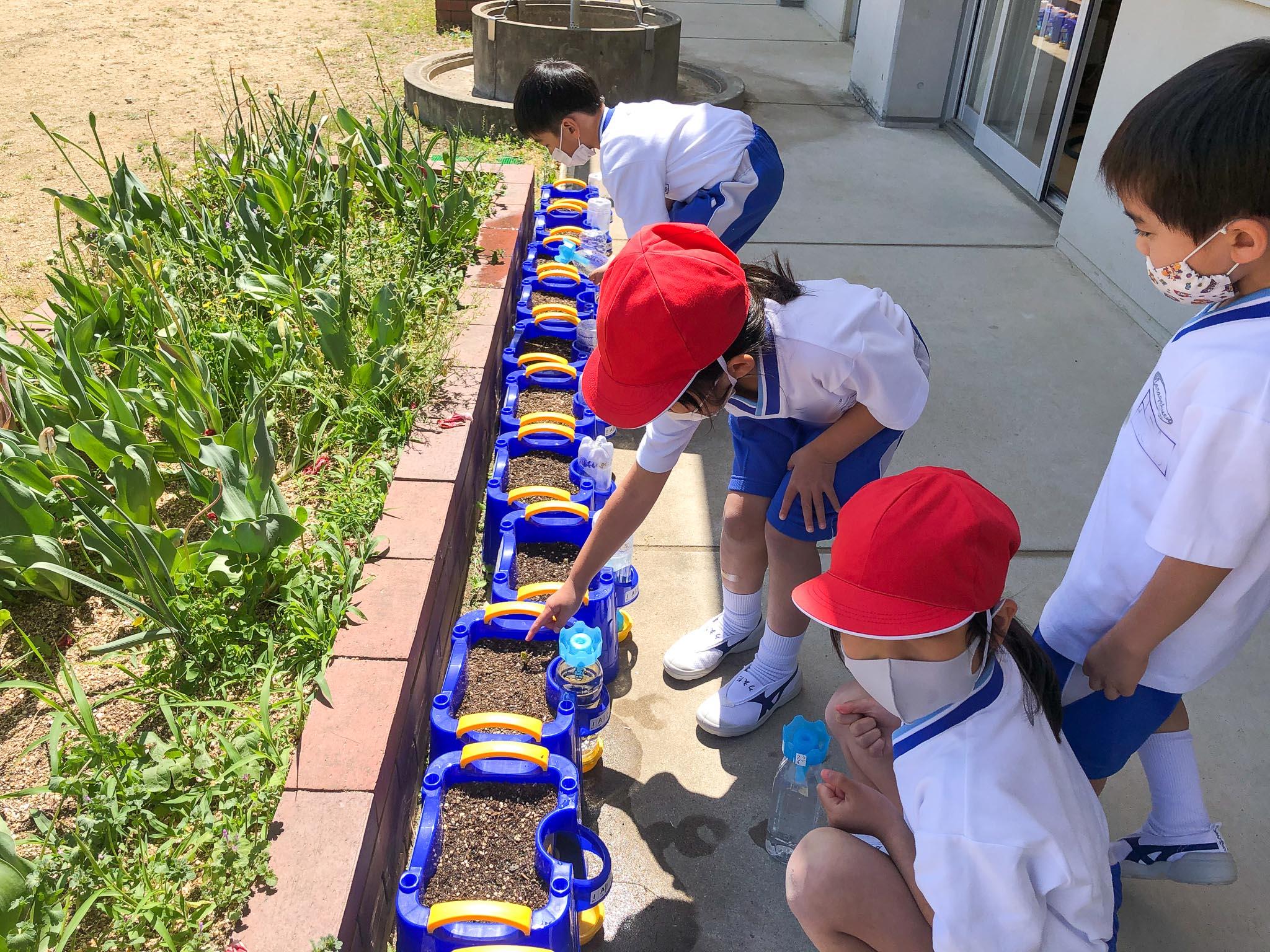 ドッジボールに、鉄棒に、鬼ごっこに、雲梯に…本当に一生懸命遊んでいます。1年生の教室の前では、先週植えたアサガオの種の芽が出たと喜んでいる子どももいました。栽培園では、作物を植える準備を手伝っている子も。