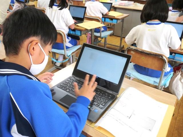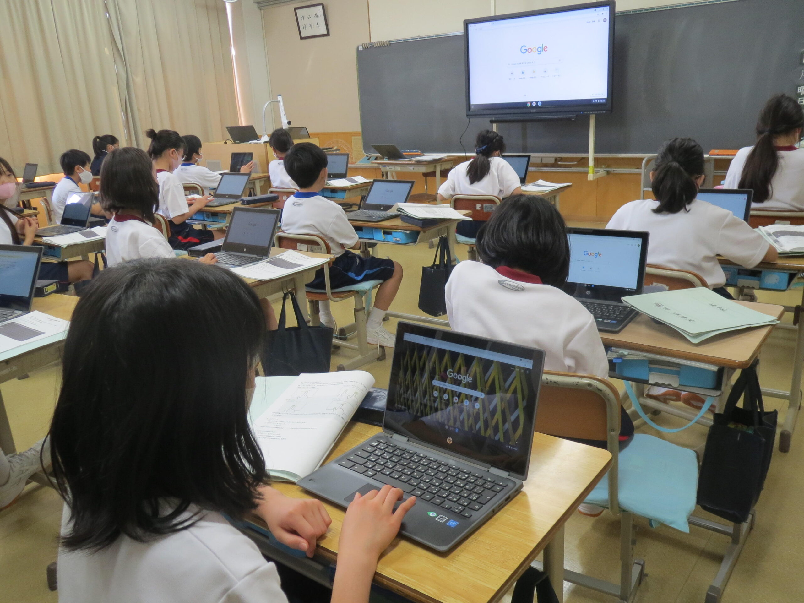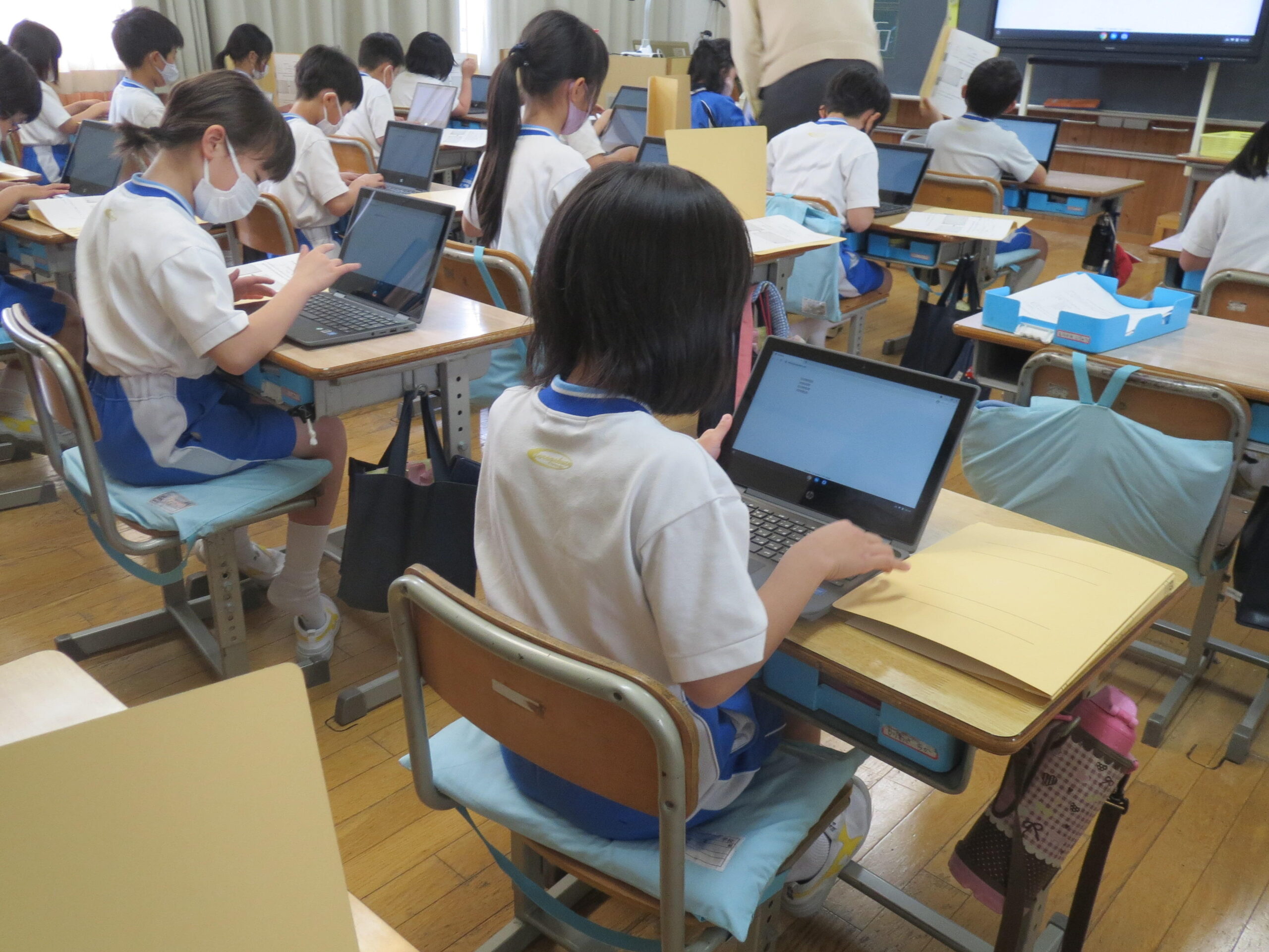 これまでは、キーボード入力などの学習はPC教室で行っていましたが、今年度からは、新しいノートPCを一人一台準備して、教室で学習できるようになりました。教室ではipadを一人一台で使うことも多い子どもたちですが、いろいろな学年でノートPCも使い始めています。初めてのChromebook(クロームブック)ですから、起動からログインして、と一つずつの作業を進めていきますが、きっとすぐに使い慣れてくれるだろうなと感じることができる子どもたちの様子です。