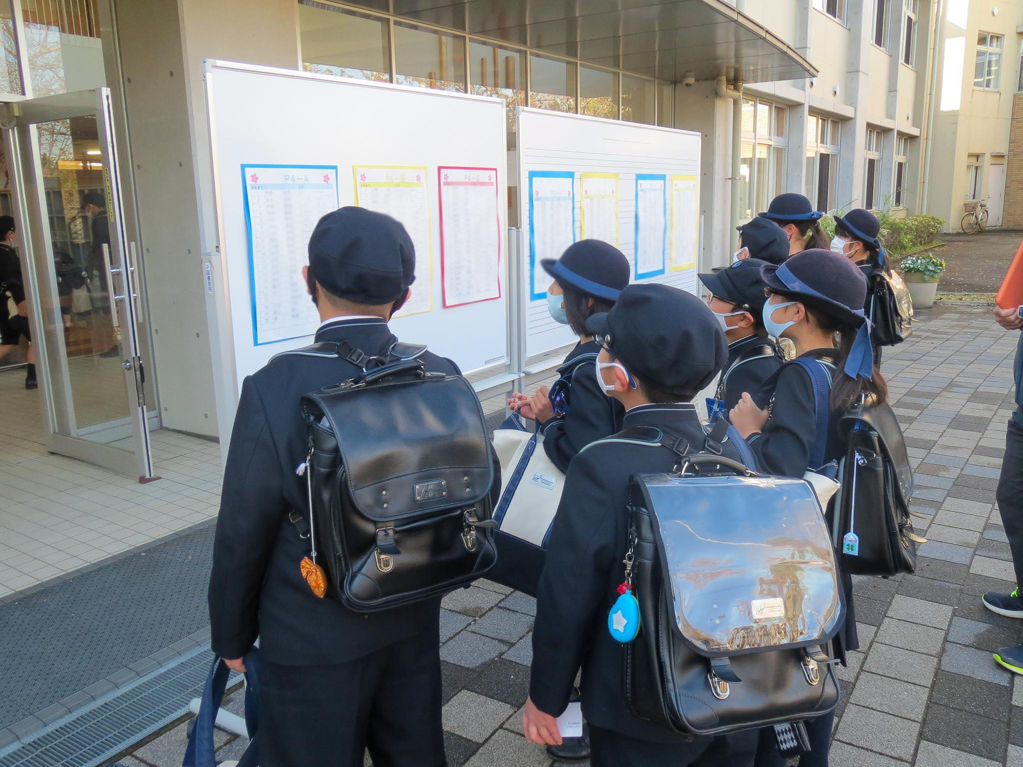 昇降口前に掲示されたクラスを見て、自分の名前を見つけると、急いで靴箱の場所を探しに行く子どもたちです。