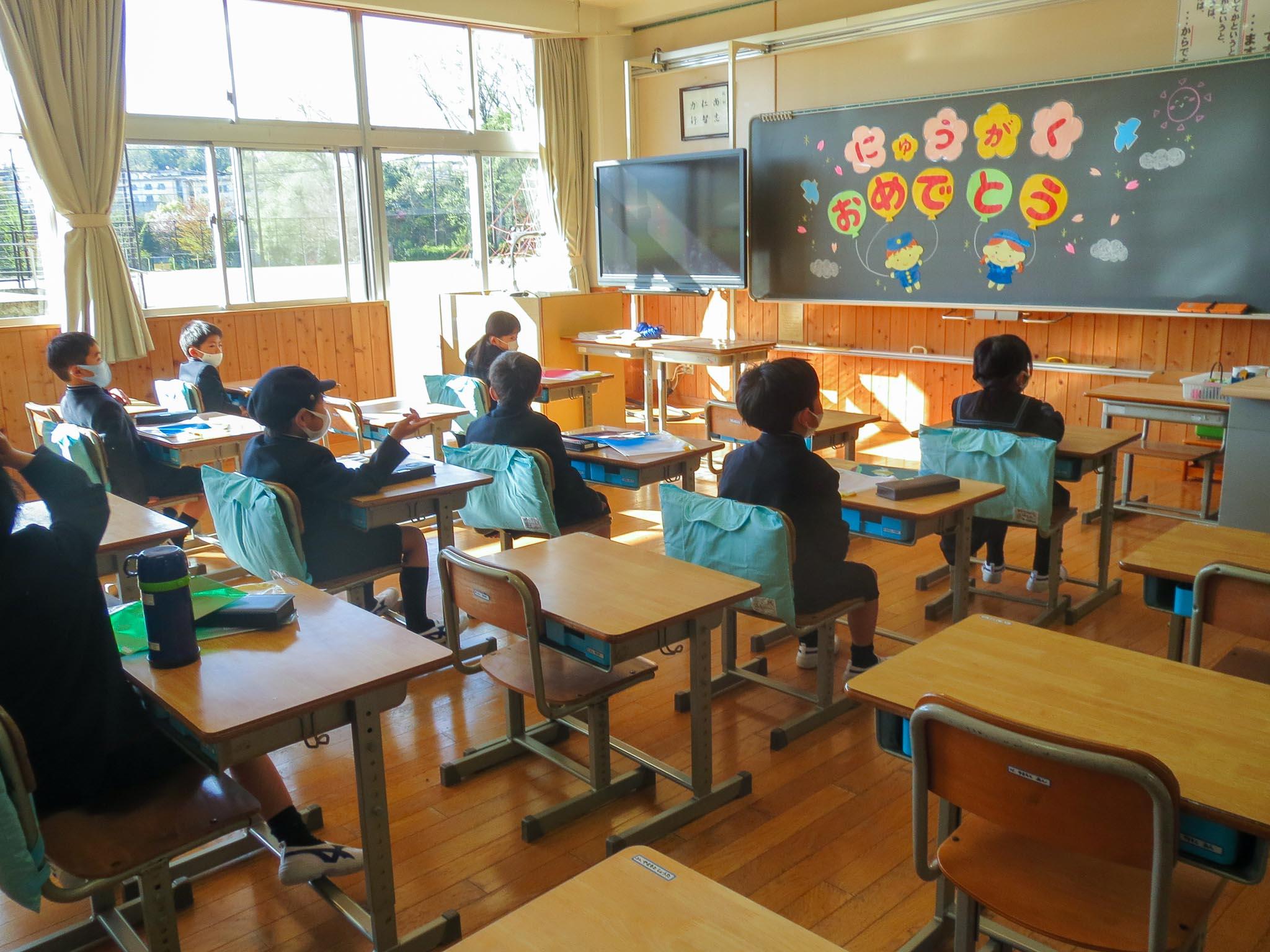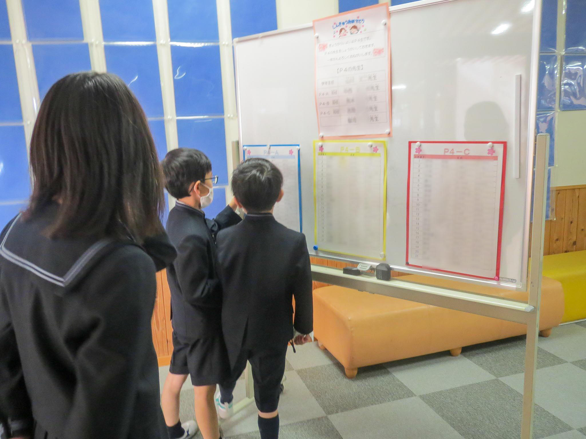 各学年のフロアには、学年団の先生の名前が張り出してあります。M2(小6)学年は、慣れた雰囲気で、友だち同士が学年スペースで朝の時間を過ごしています。この前入学式を終えたばかりのP1(小1)学年をのぞいてみると、きちんと自分の机に座ってみんながそろうのを待っています。どの学年の子どもたちも、新しく始まった学年を楽しみにする気持ちが伝わってくる始業式の朝でした。
