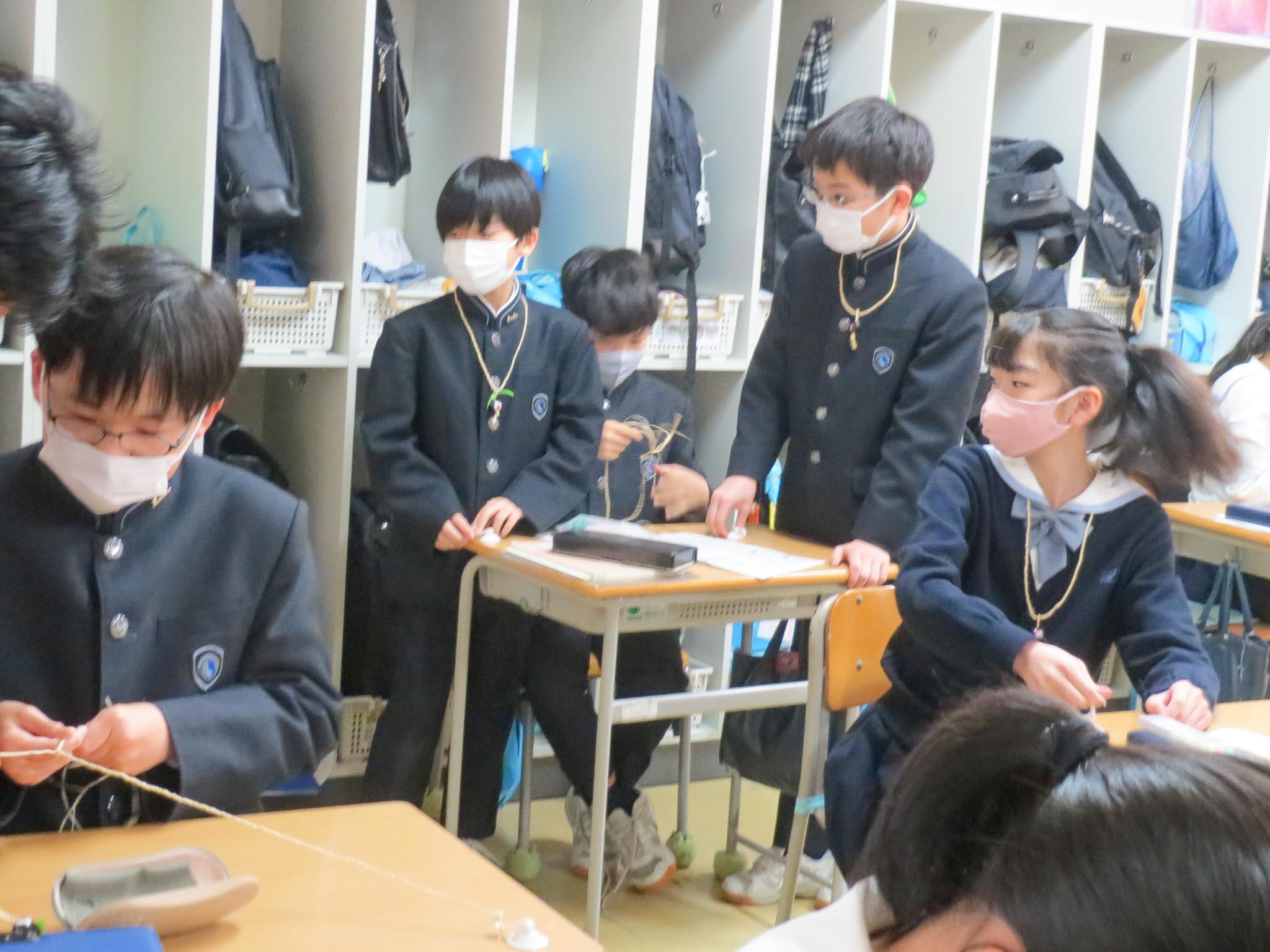 思ったより手先を使って編み上げることの難しさを体験し、できあがったククイナッツチョーカーを首にかけて満足する子どもたちです。