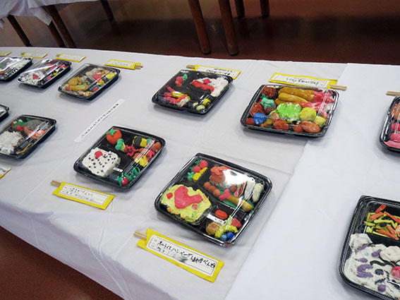 P2生の制作物「わくわくおべんとうやさん」の説明です。「紙粘土で、自分だけのすてきなお弁当をつくりました。思わず食べたくなるような、自分だけのお弁当。絵の具を紙粘土に混ぜることもがんばりました!」