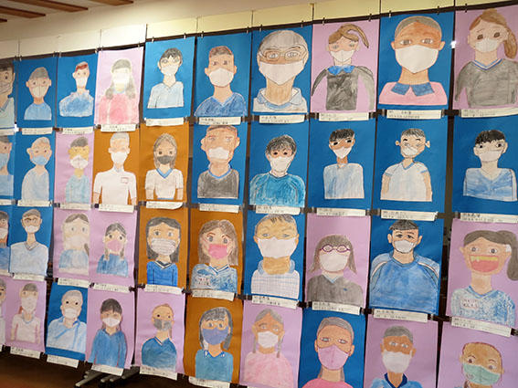 P4生の絵画の説明です。「今年はコロナ禍で、マスクをしたまま自画像を描きました。早くこのコロナが収束することを願って描きました」