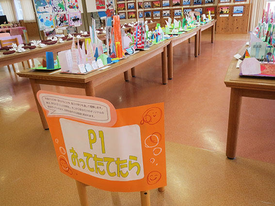 P1生の制作物「おってたてたら」の説明です。「平面から立体へ変化することを、図工の学びを通して理解します。紙は、折ると立つことを発見し、そこから自分だけのオリジナルの作品を作っていきます。空間を創作する意識も育まれます」