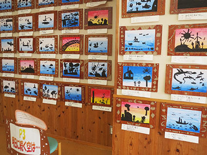 P3生の絵画の説明です。「グラデーションを学びました。水を用いたグラデーション・色と色のグラデーション。そこに、P2で学んだカッターの技を組み合わせ、すてきな切り絵風の世界を生み出しました。額にも注目してください!」