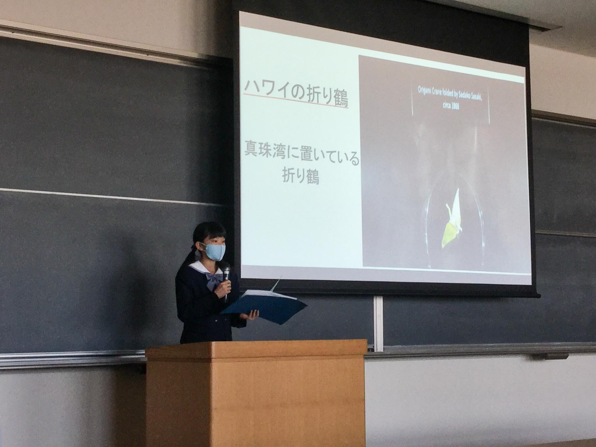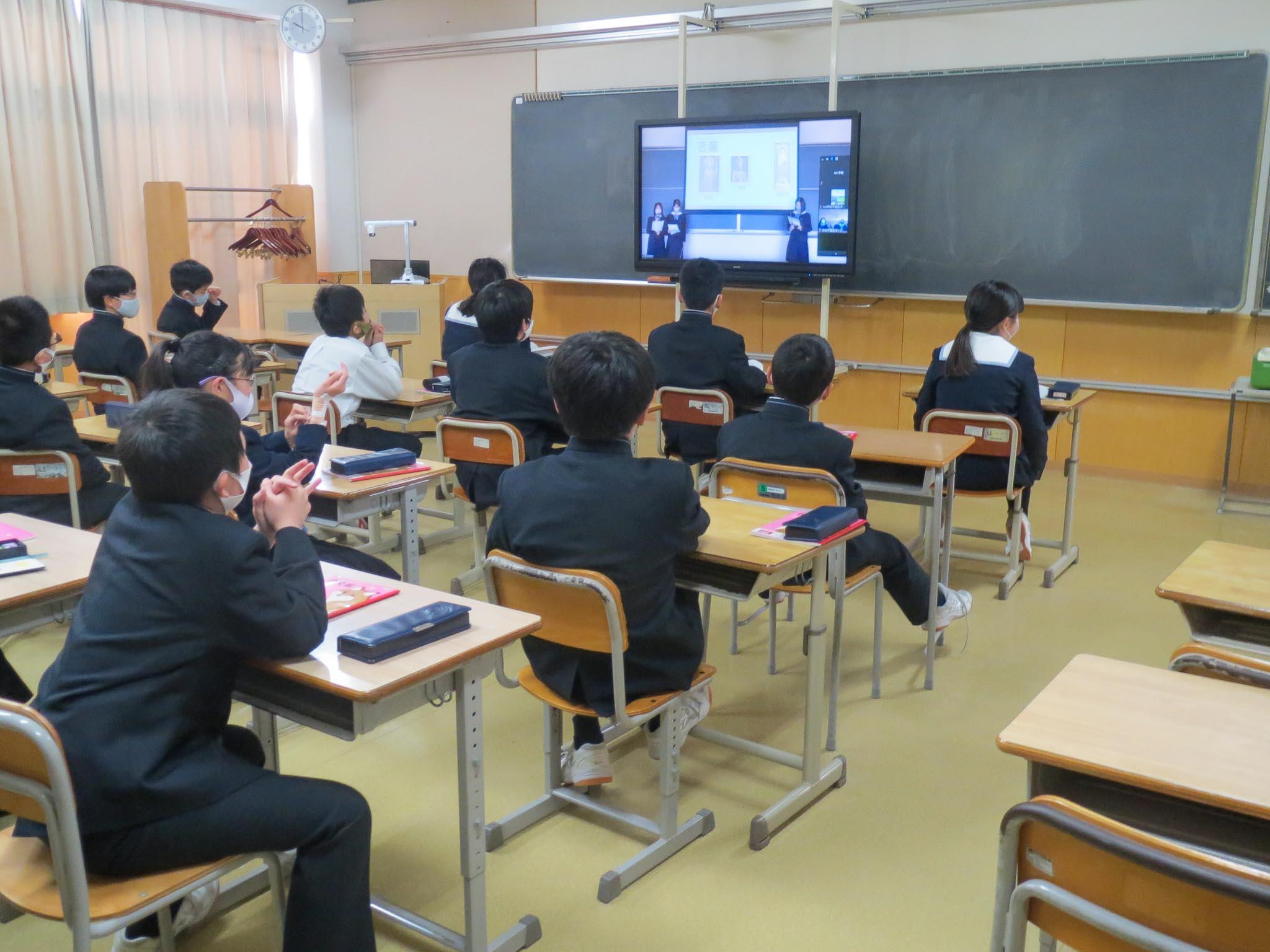 M1学年は、広島への宿泊学習に向け、様々なテーマで調べたことを、パワーポイントにまとめて発表してくれました。「貞子さんについて」調べたグループは、原爆が落ちた広島にいた貞子さんについて考えながら、ハワイのパールハーバーでも展示されていることにも触れ、お互いを認め合い心の輪をつなげていくことが必要、過ごしている毎日はとても価値があることなどに考えを至らせていました。「大久野島」、「戦争中の町や建物の様子」などをテーマに自分たちがすべきことは何か、考えたことを発表してくれました。