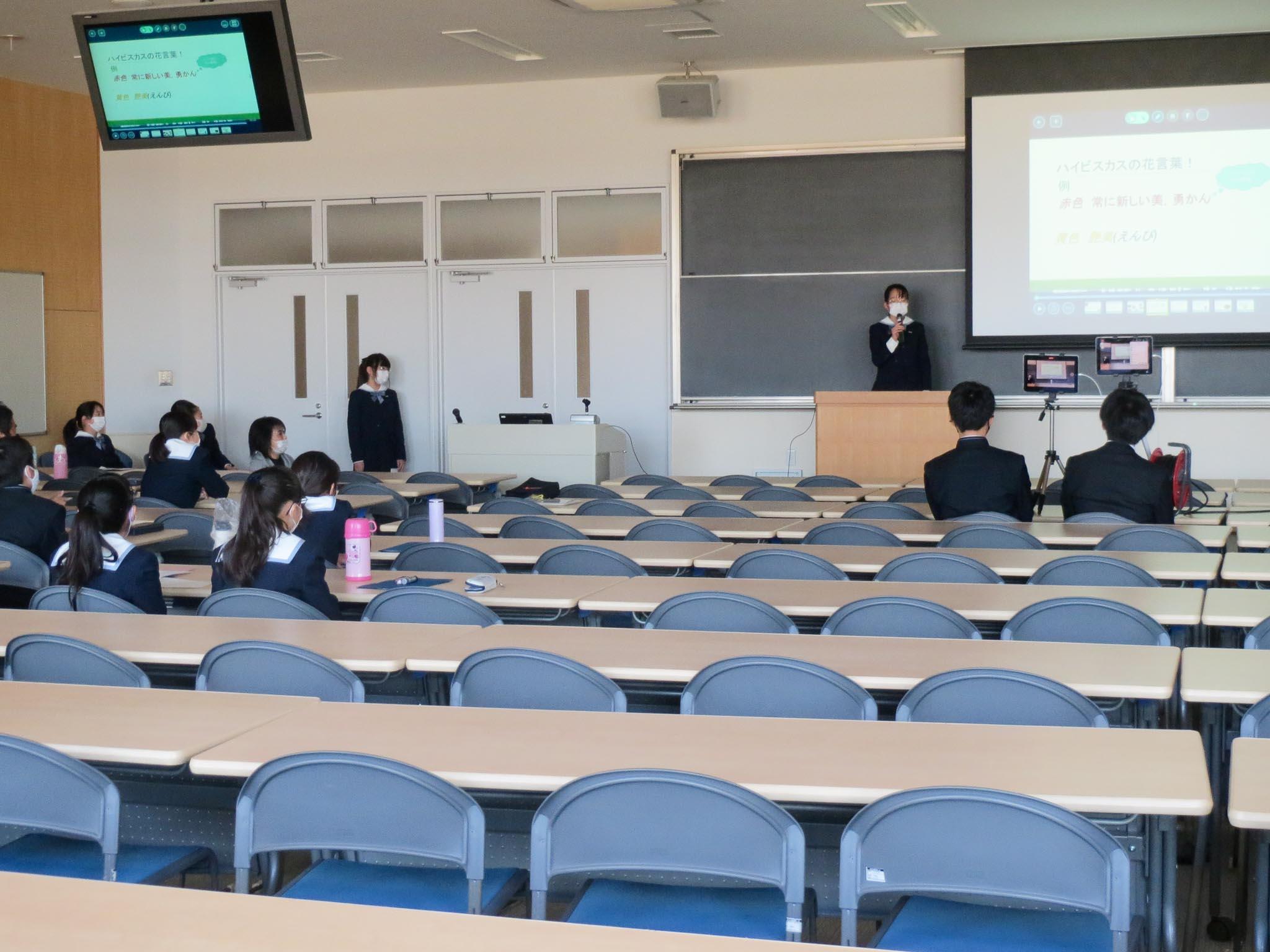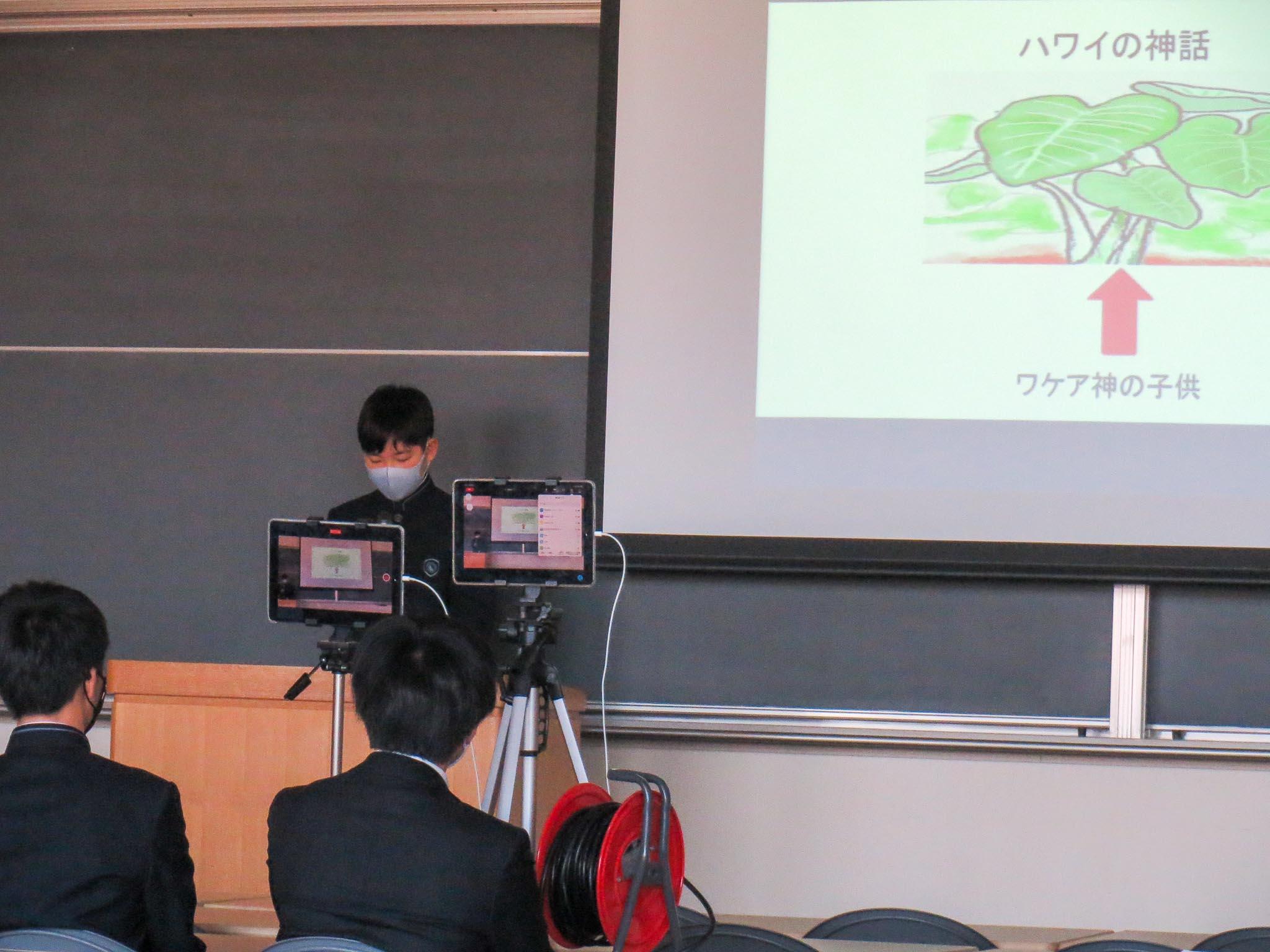 M2学年は、宿泊学習でハワイに行くことができなかったのですが、ハワイに関わるたくさんのことについて調べてきました。ロイロノートを使いながら、ネネについて、ハイビスカスについて、タロイモについて、ハワイ語について、コナコーヒーについて、食文化についてなど、一人一人のテーマをまとめ、発表してくれました。M2生は、2月末にハワイの姉妹校であるメリノール校とwebでつながり、交流を行う予定です。そこに向ける思いをつなぐM尚志祭にもなりました。