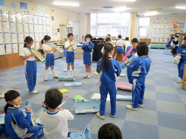 朝学校に来てから自主的に練習をしている子どもや、朝の会が終わって1時間目が始まるまでの短い時間を使ってオープンフロアで集まって練習をしている学年、音楽の時間を使ってたっぷりと練習をしている学年など、尚志祭に向かう過程を積み重ねている各学年の一場面です。