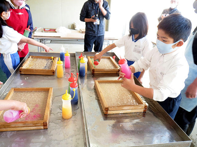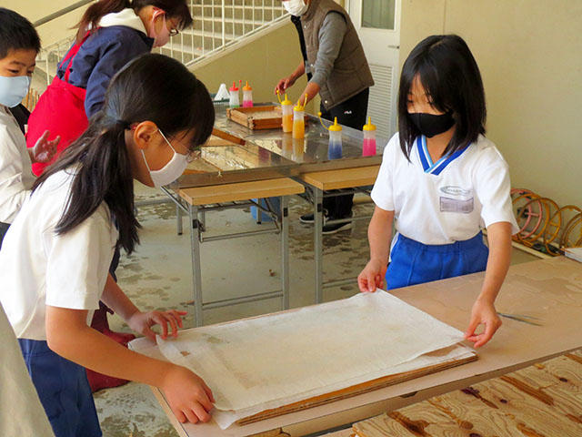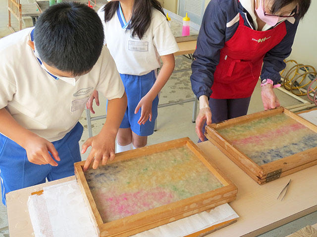 楮(コウゾ)の繊維の処理をして、塵を丁寧に取り除いてなどのとても大変な工程を経て準備していただき、子どもたちは水に手をつけながら紙をすいていきます。福西さんに手助けをしてもらいながら厚さが均一になるように気をつけて水から出し、次に、淡い色を模様としてつけて、紙床ができあがりです。水をきって重ねて置くところまでが今日の作業です。あとは、福西さんが持ち帰って乾燥してくださいます。