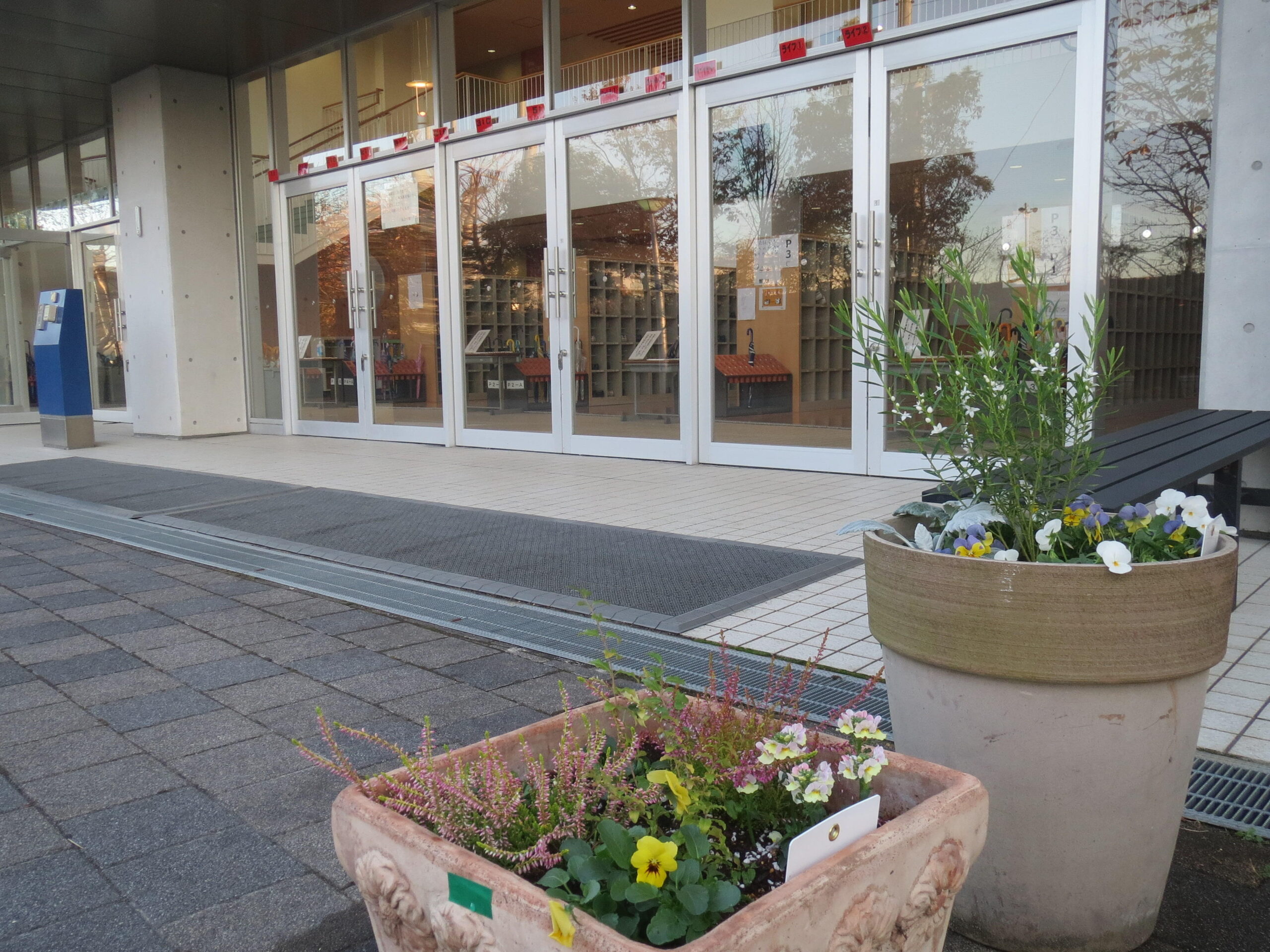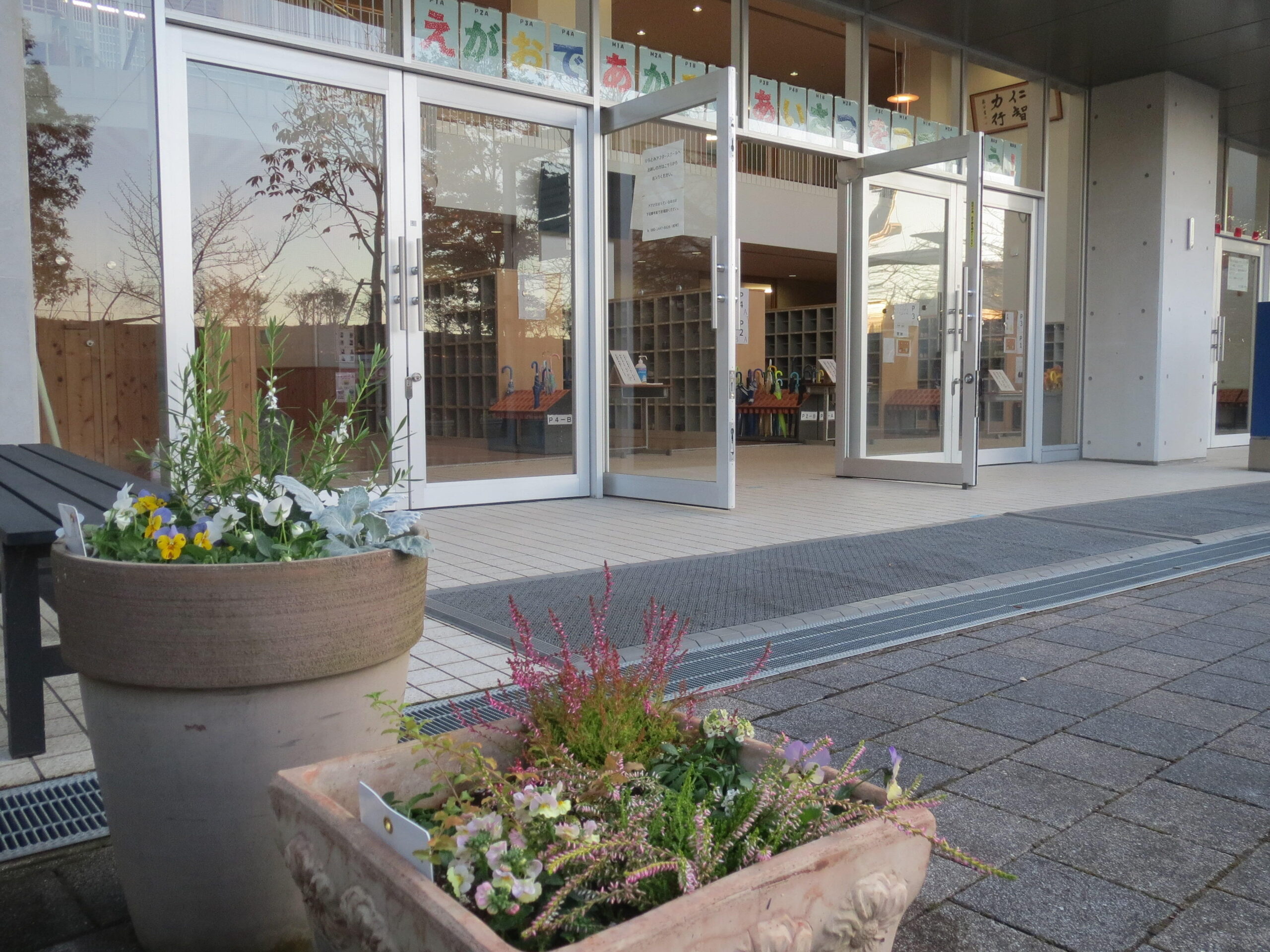 また、P昇降口のすぐ横に、環境整備部の方々が、きれいな寄せ植えをしていただきました。冬になり、木々の葉も落ちてさみしくなった場所に、ホッとできる花達が鉢に収まって子どもたちを見守ってくれます。保護者の方々の子どもたちへの温かなお気持ちが伝わってきます。ありがとうございました。