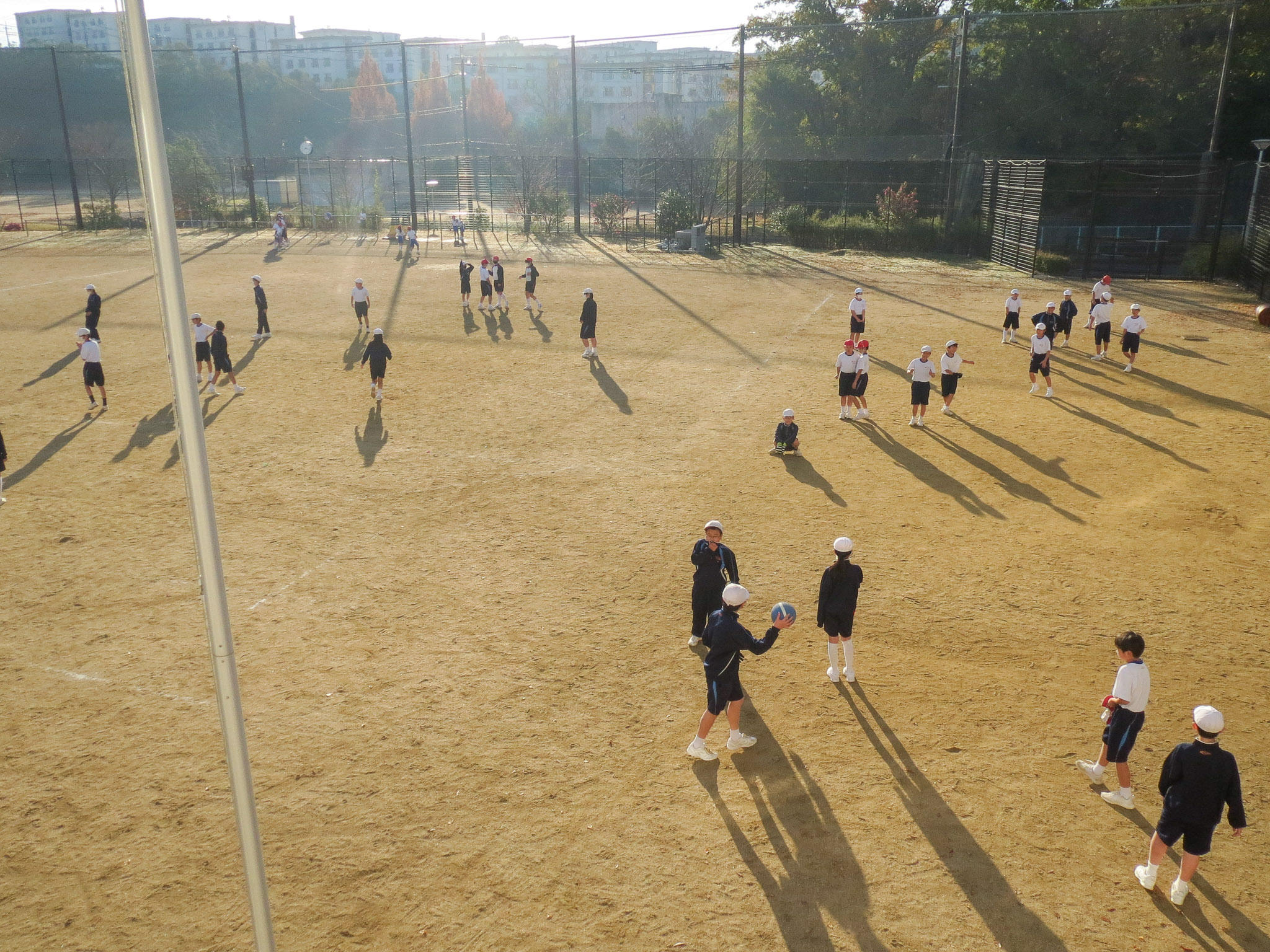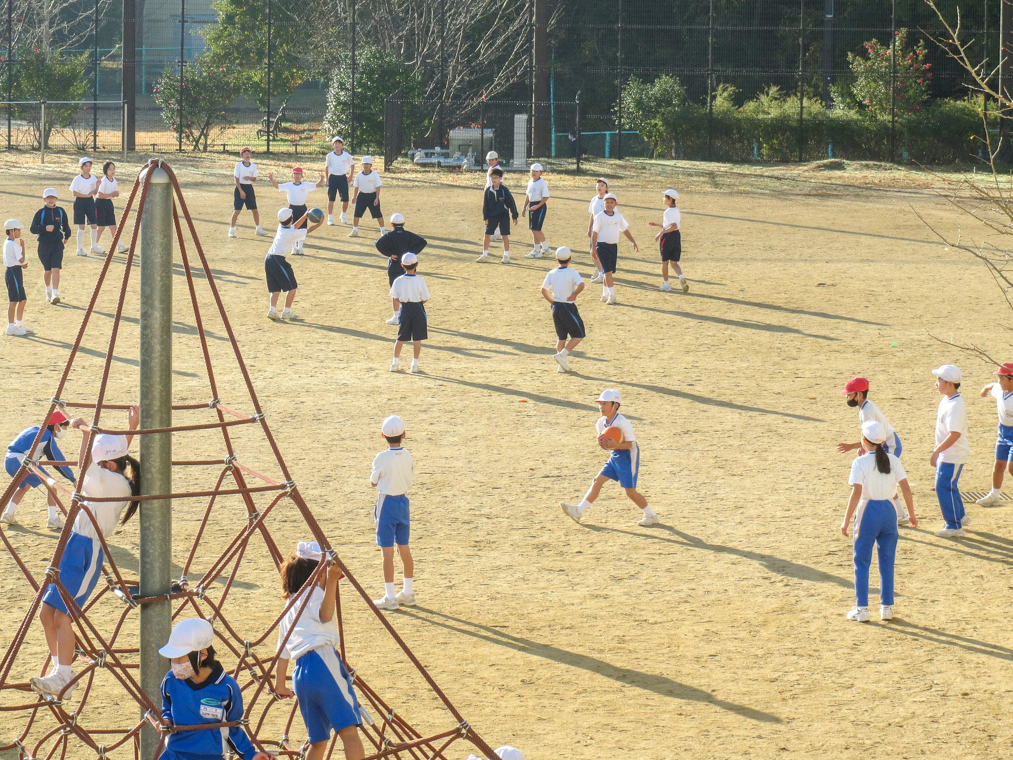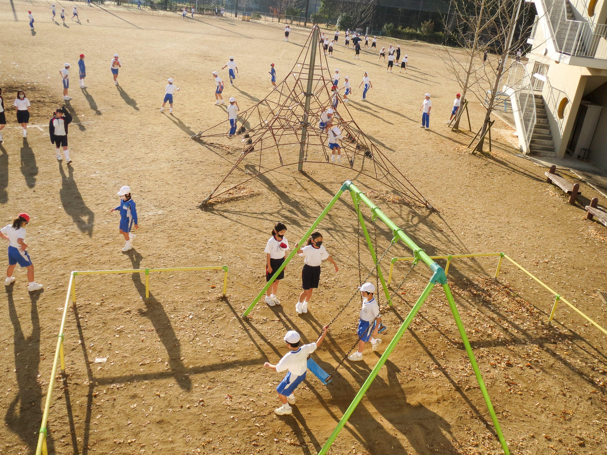 朝、奈良学園小学校のグラウンドに目を向けると、朝日を浴びて元気に遊んでいる子どもたちがたくさんです。学級園の近くで鬼ごっこをしている子どもたちや交代しながらブランコを楽しんだり、ドッチボールをしたりして友だちと一緒に楽しく遊んでいます。このあと時間が来ると、走って昇降口に向かい、読書タイムの始まりです。