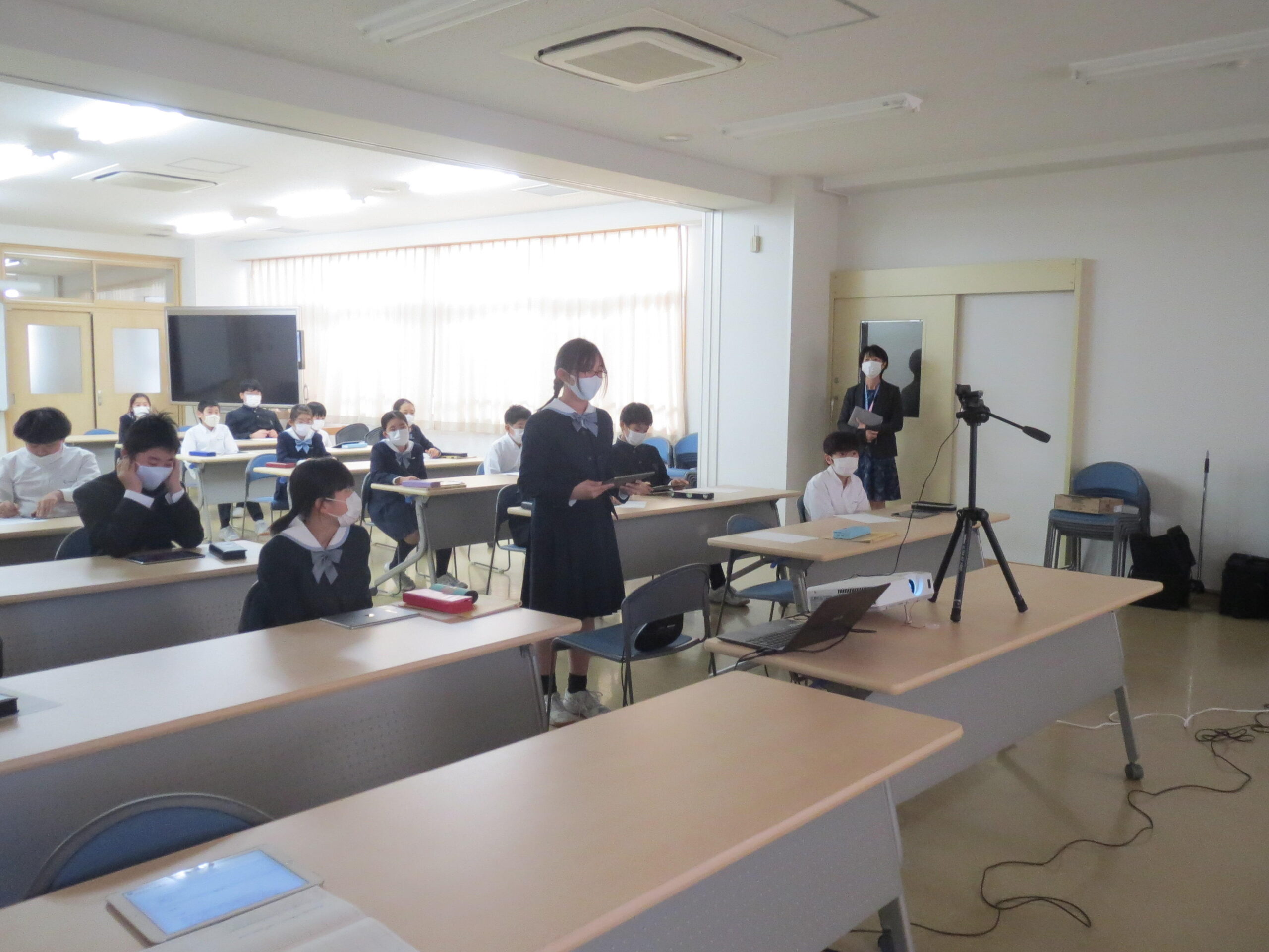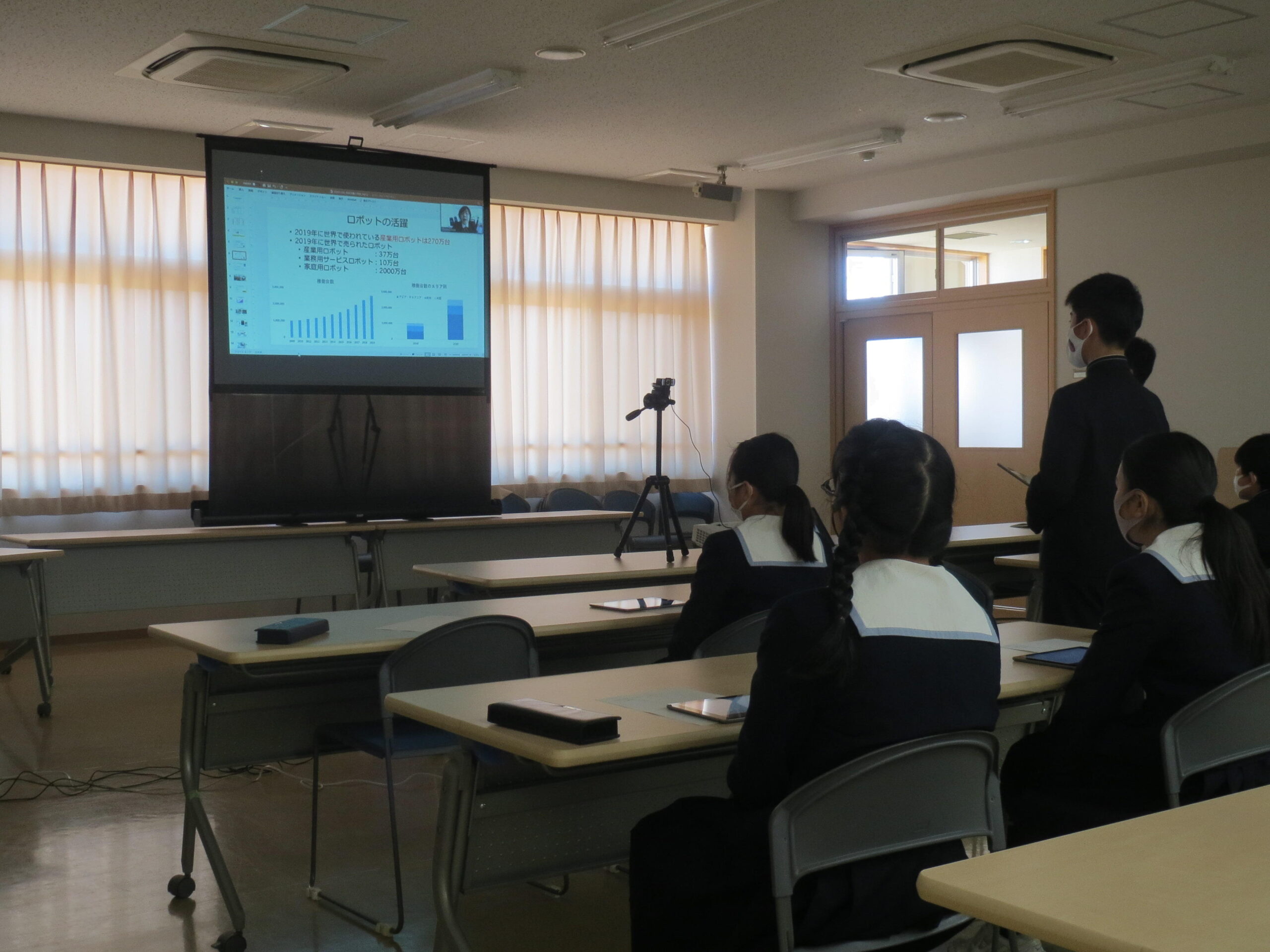 ロイロノートに記録した自分の質問を見ながら、上田先生に質問をします。webカメラを通して質問するというとても緊張する場面となりました。「世界でどれくらいの数のロボットがあるのですか」「ロボットが一番使われている分野はどんなところですか」などという質問や「AIがすることが広がってくると、ロボットに支配されることは起こりませんか」などという質問も。先生からは、「作り手は人間だから、支配するロボットは創ってはいけないし、出ては来ないのですよ」というお話や「プログラミングのように順序立てて考えることと、国語で勉強しているように論理立てて考えることは同じですよ」というお話もありました。ふだんは接することのできない見方や考え方に触れることができるとても貴重な時間となりました。